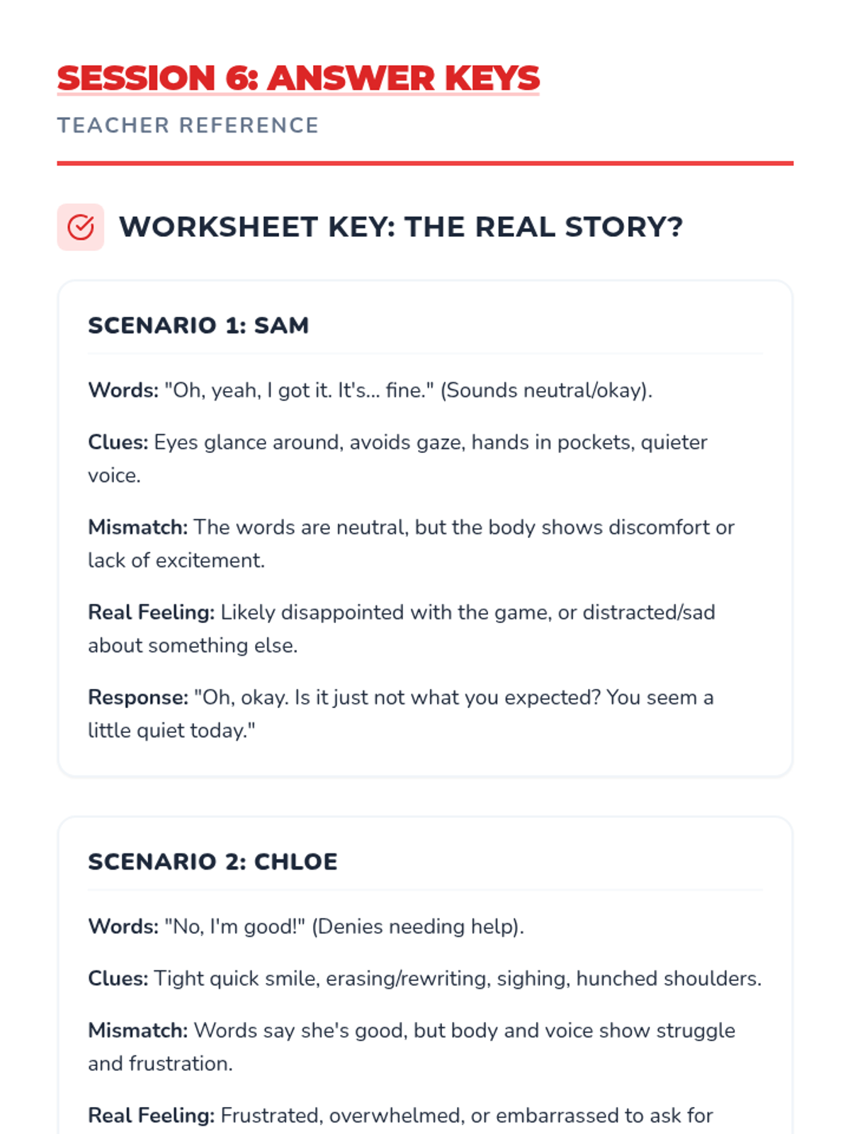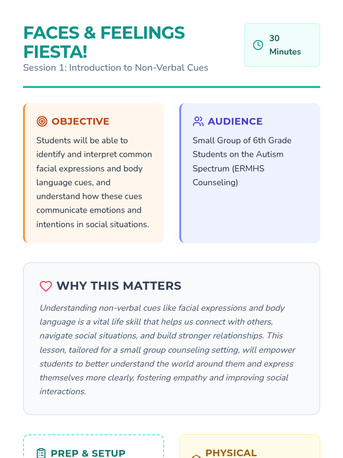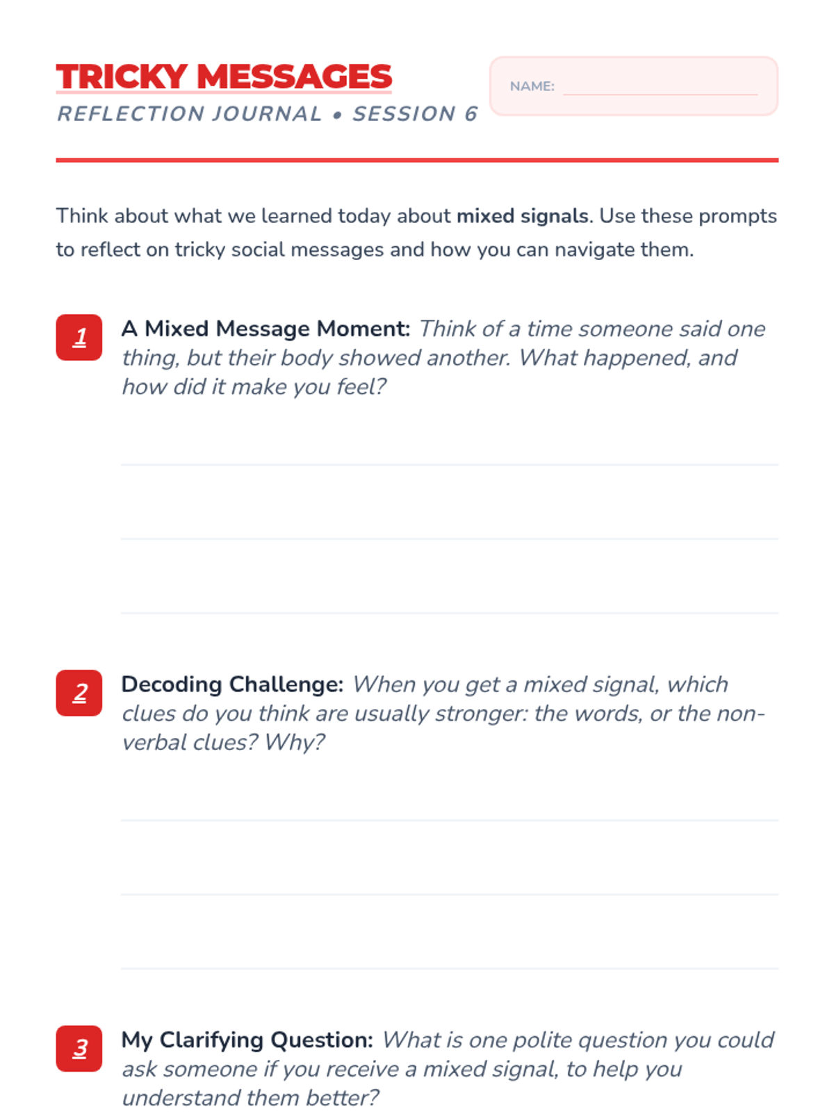 A 6-session social-emotional learning sequence for 6th-grade students on the autism spectrum, focusing on interpreting facial expressions, body language, tone of voice, and social context.