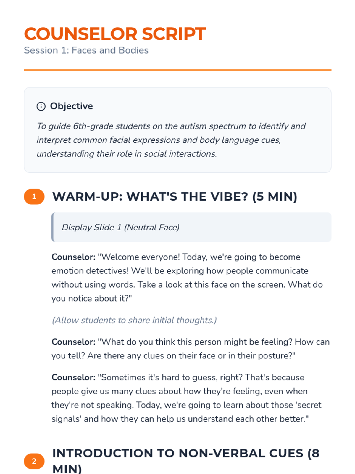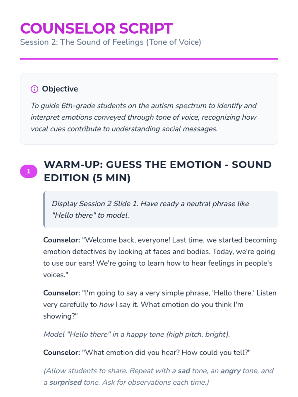 A 36-week social communication curriculum for children with Level 1 autism and ADHD, focusing on the nuances of the Emotion Wheel through 15-minute weekly lessons.