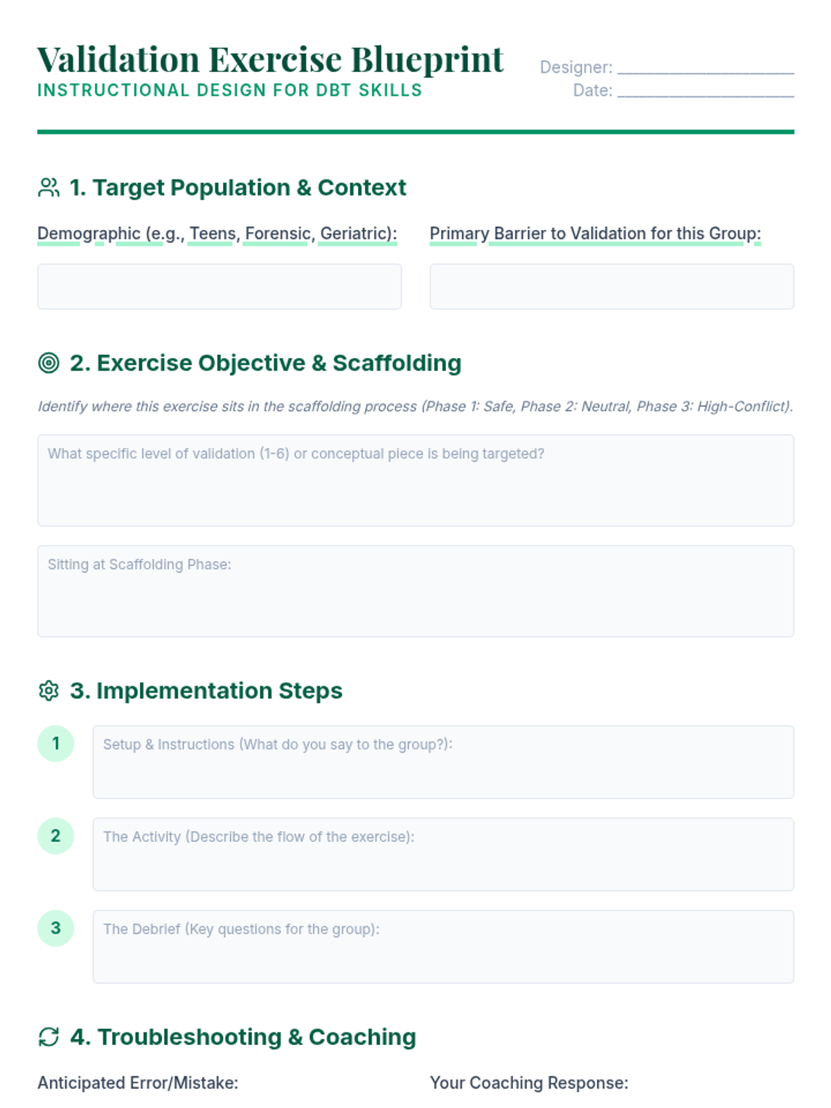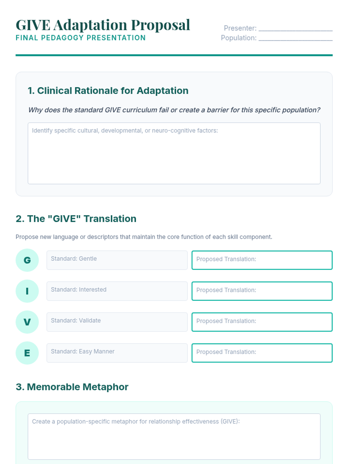 A comprehensive graduate-level course focused on the pedagogy of teaching DBT GIVE skills. This sequence prepares future therapists to facilitate psychoeducation, coach validation, address clinical barriers, and adapt interpersonal effectiveness skills for diverse populations.