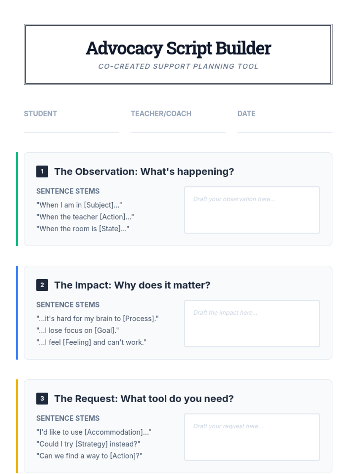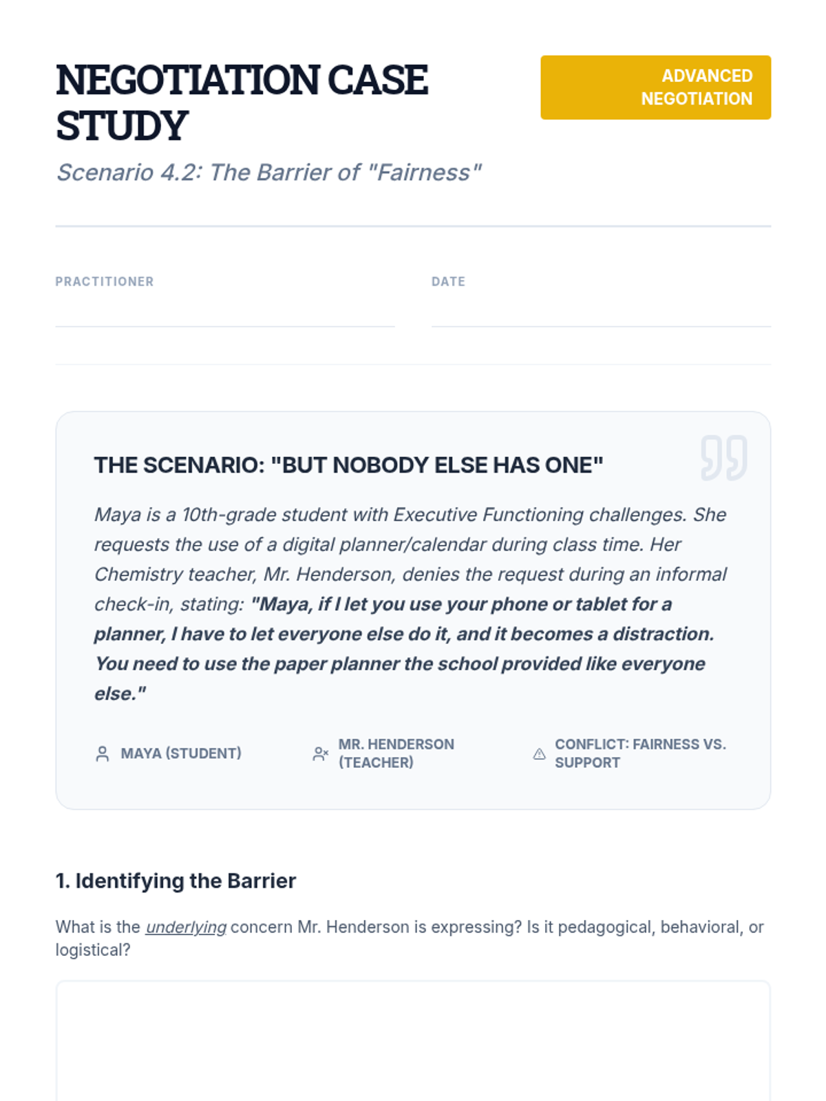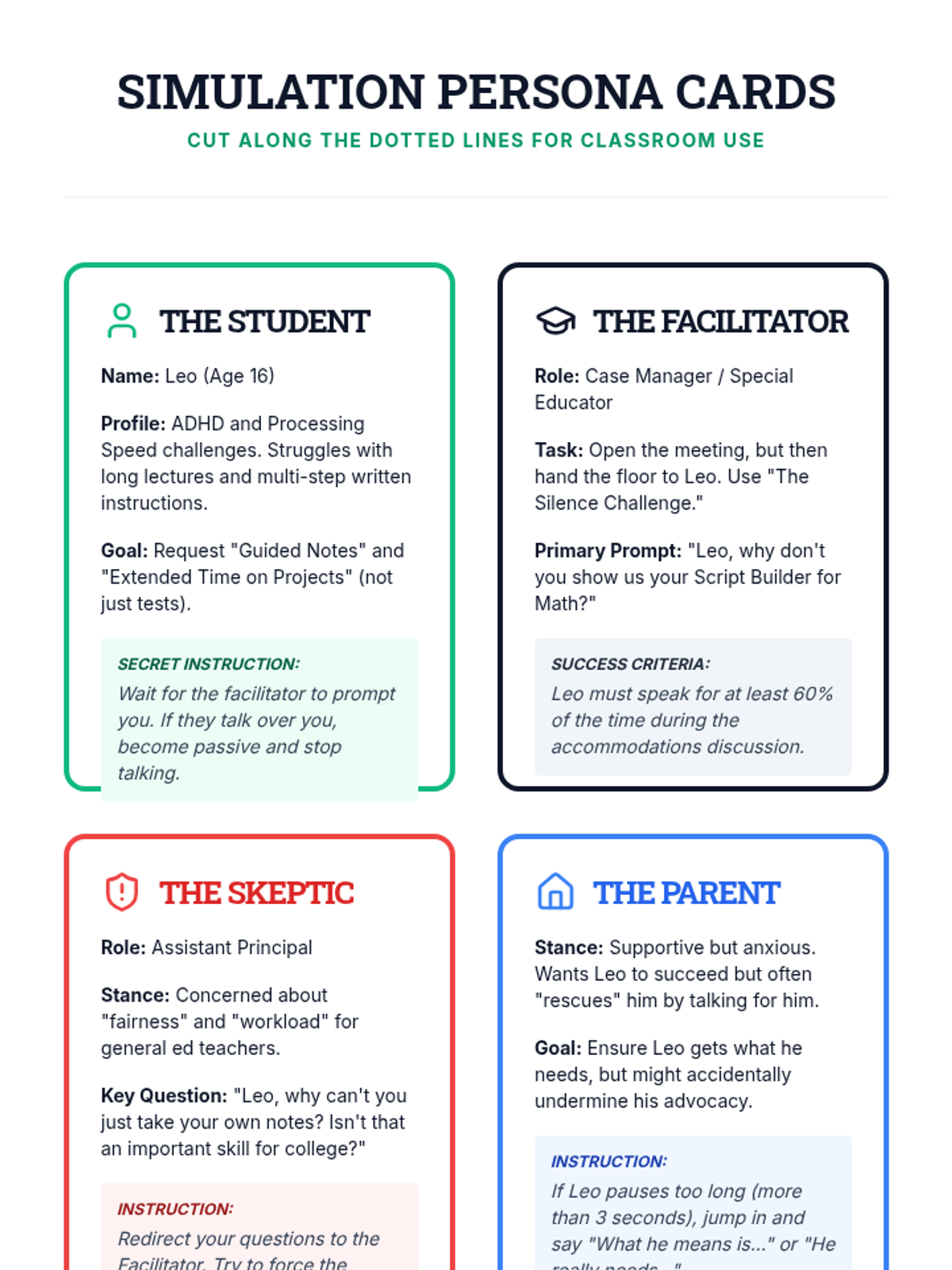 A graduate-level professional development sequence focused on training special educators to coach students in self-advocacy, negotiation, and student-led IEP leadership. The sequence emphasizes pedagogical scaffolding, transition of power, and clinical simulation.