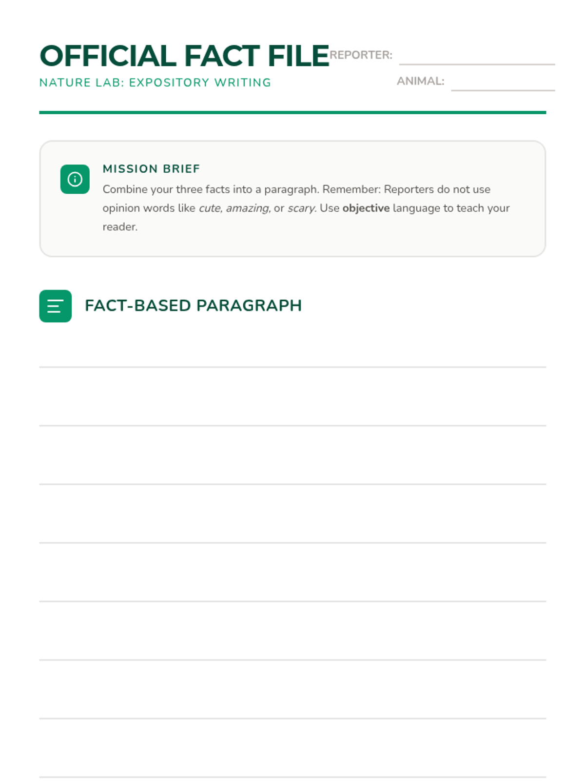 A project-based unit where 2nd graders act as wildlife reporters and storytellers, researching real animals to write expository texts before transforming them into fictional narratives to learn the key differences between fact and fiction.