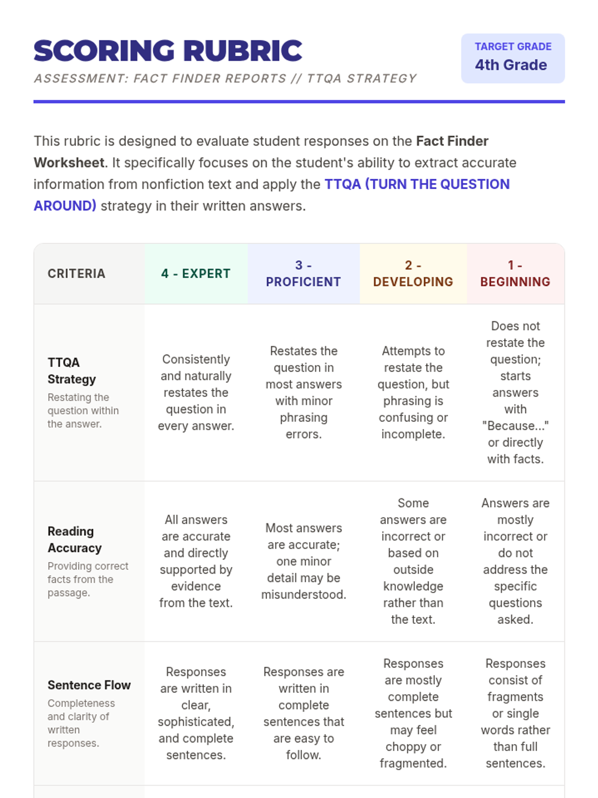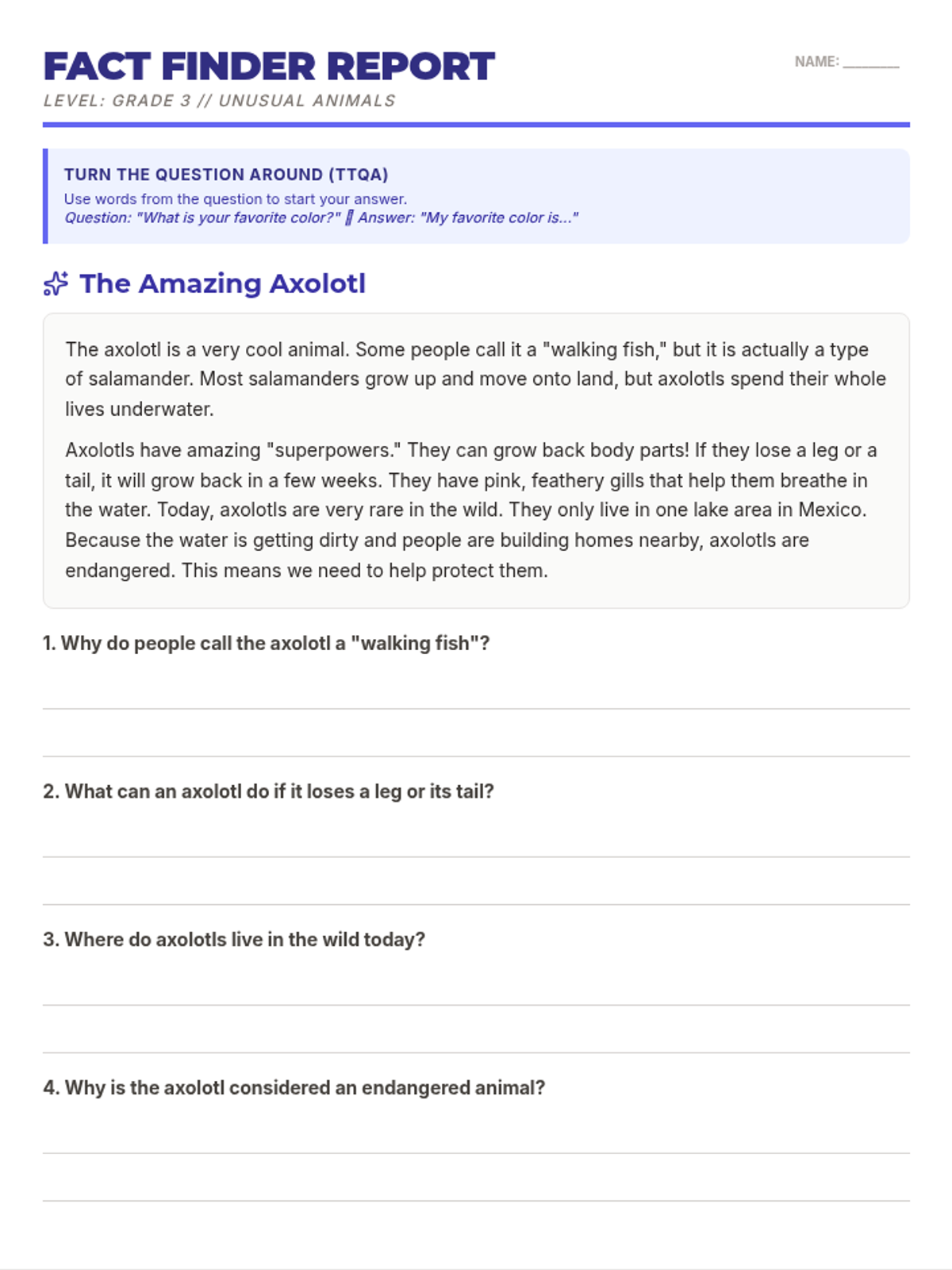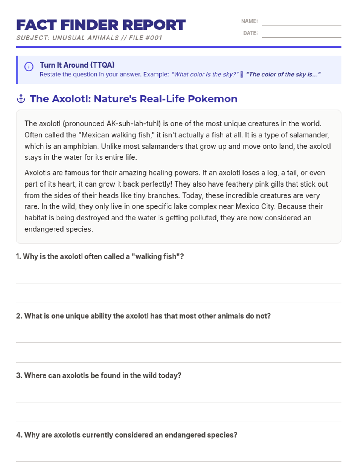 A multi-level collection of reading comprehension materials designed to teach students how to 'Turn The Question Around' (TTQA). Includes high-interest nonfiction passages differentiated for 2nd, 3rd, and 4th grade levels.