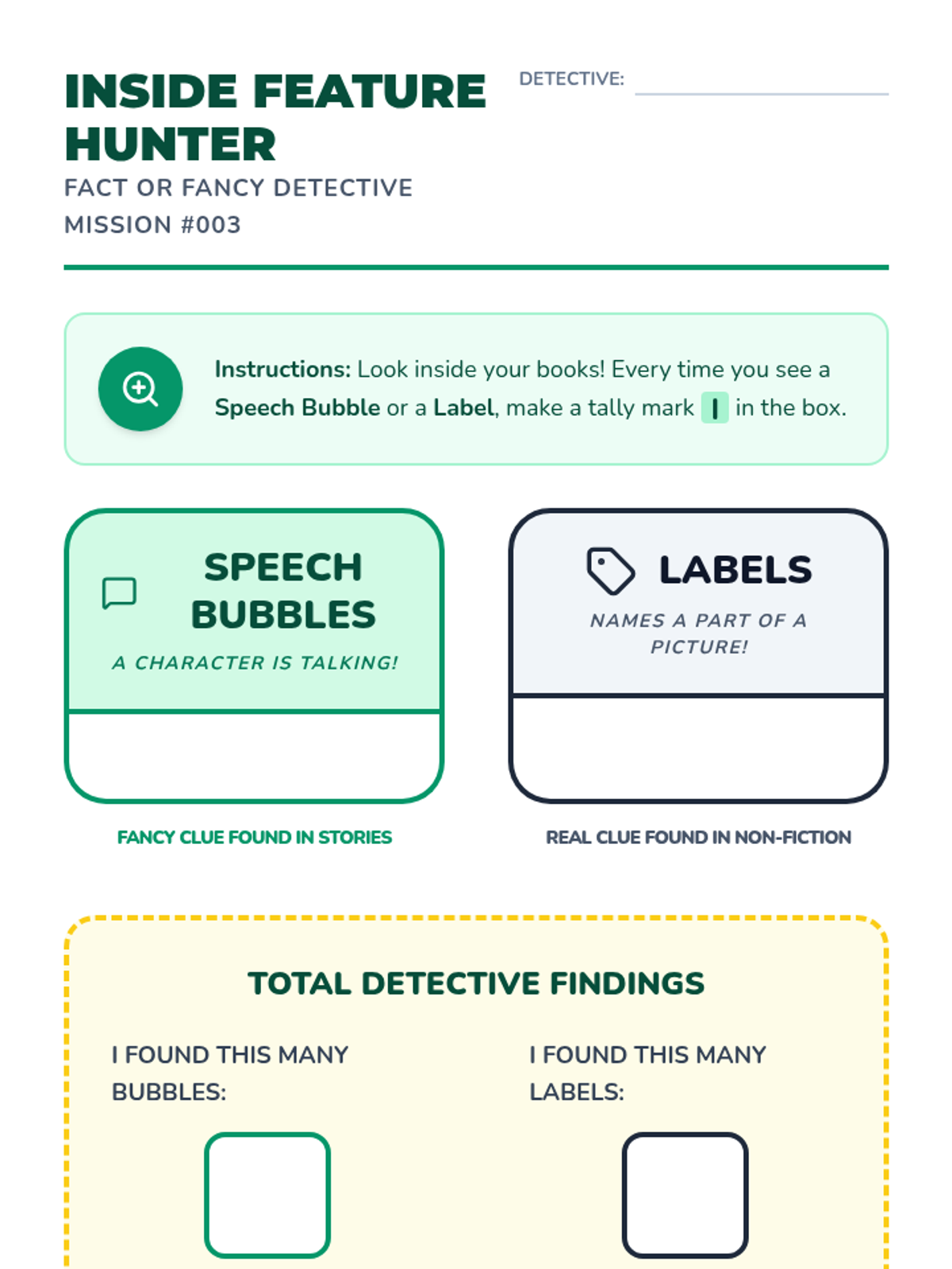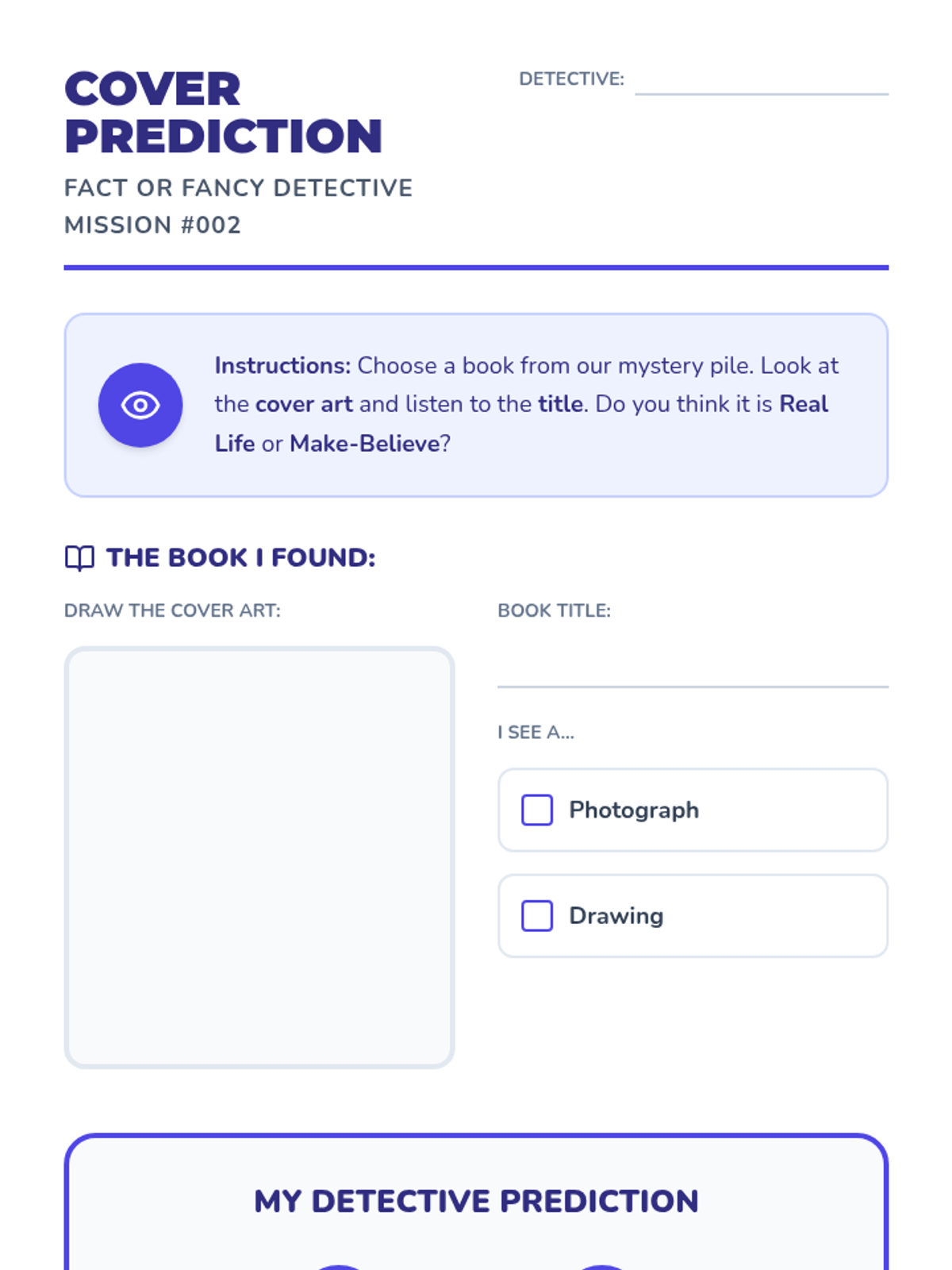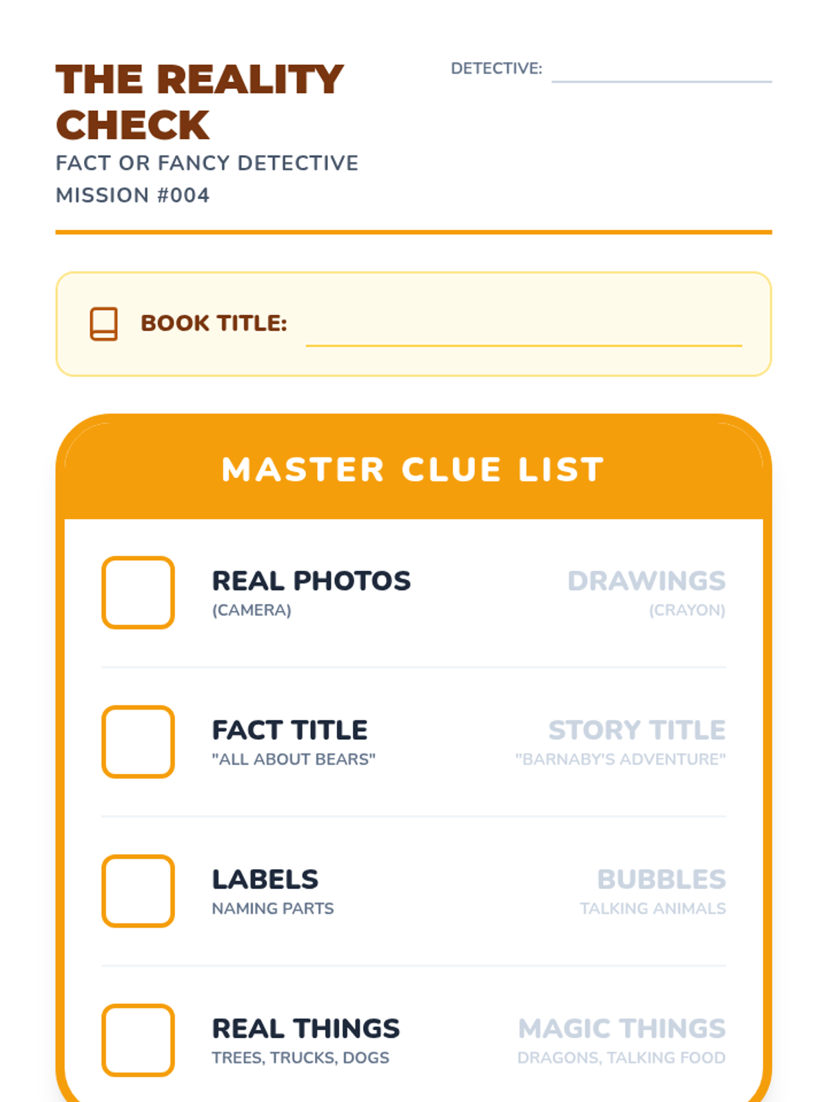 A Kindergarten ELA sequence where students become 'Fact or Fancy Detectives' to distinguish between reality and fiction using visual cues like photographs, illustrations, and text features.