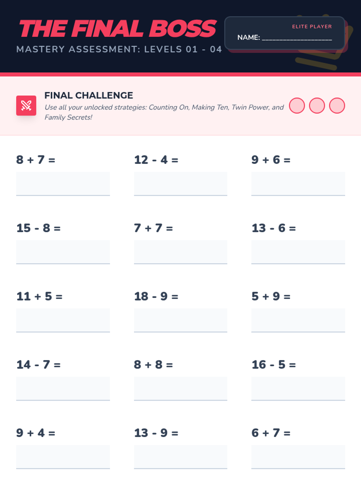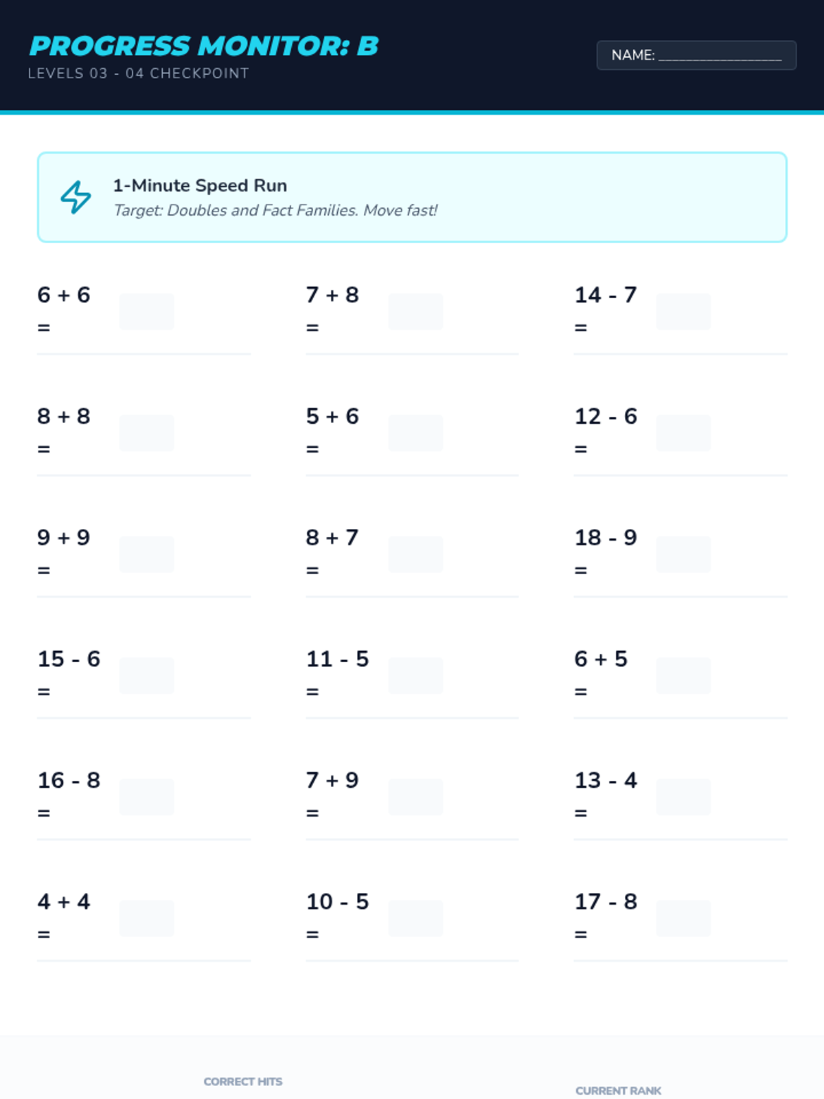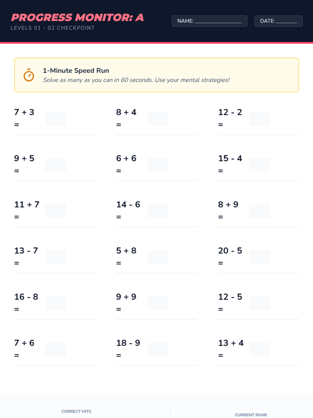 A targeted Tier 2 intervention program for 2nd graders focusing on mental math strategies for addition and subtraction within 20, featuring an arcade-themed progression.