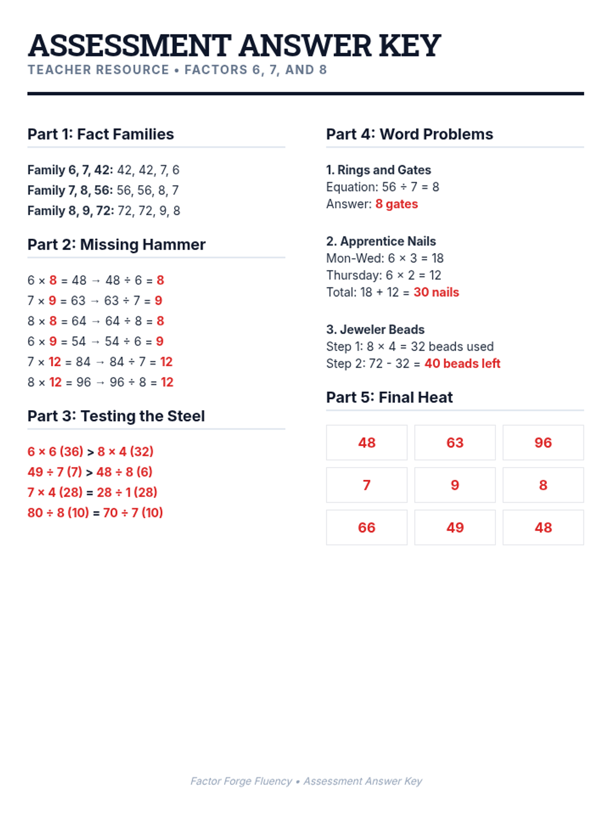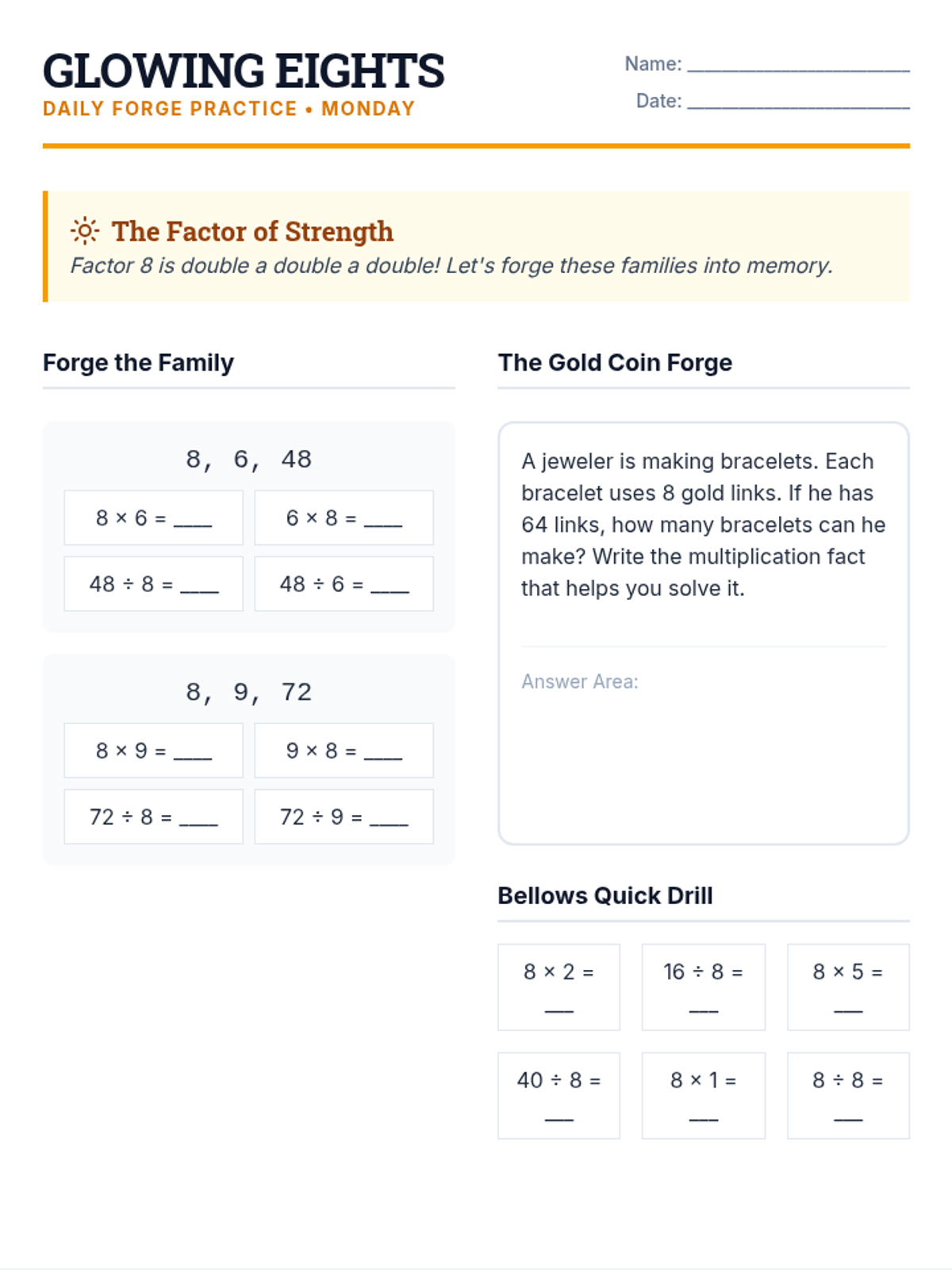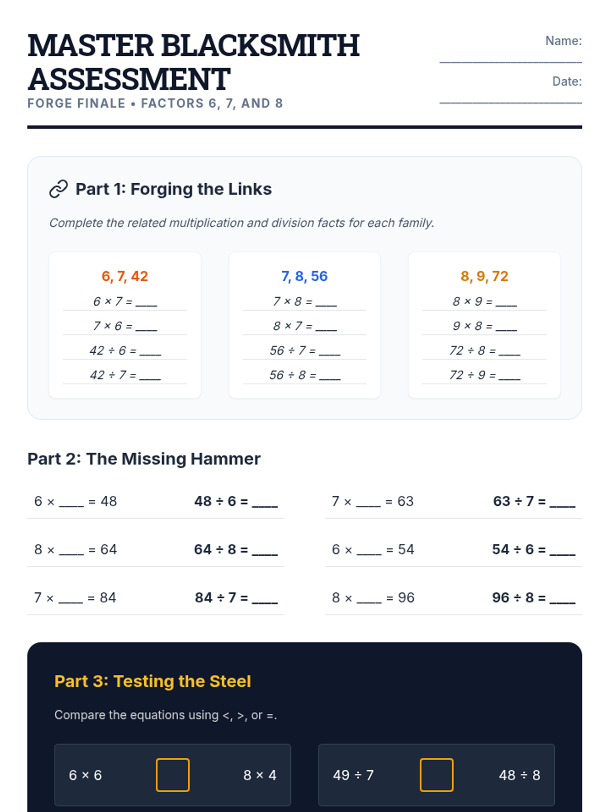 A three-week intensive unit focusing on multiplication and division fact families for factors 6, 7, and 8, using a blacksmith 'Factor Forge' theme to build math fluency and conceptual understanding.