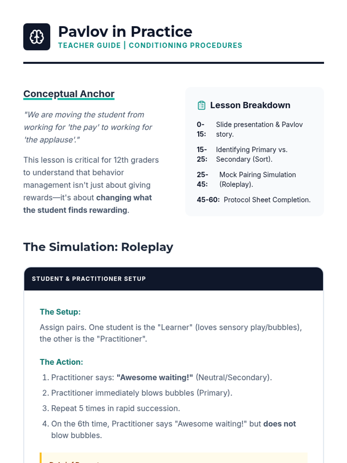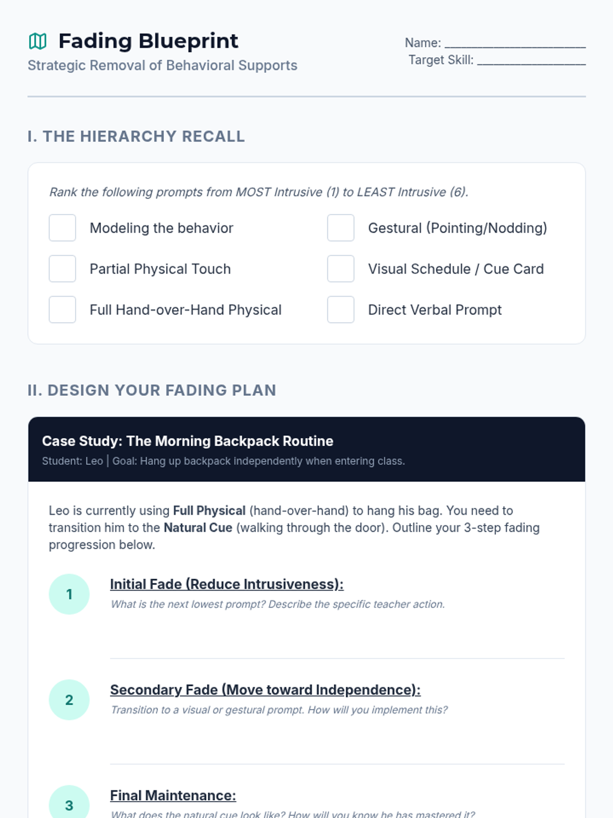 This advanced 12th-grade sequence explores the ethical transition from extrinsic reinforcement to intrinsic motivation and independence. Students learn professional behavioral strategies including prompt fading, conditioning secondary reinforcers, and designing self-management systems to ensure long-term behavioral generalization and maintenance.