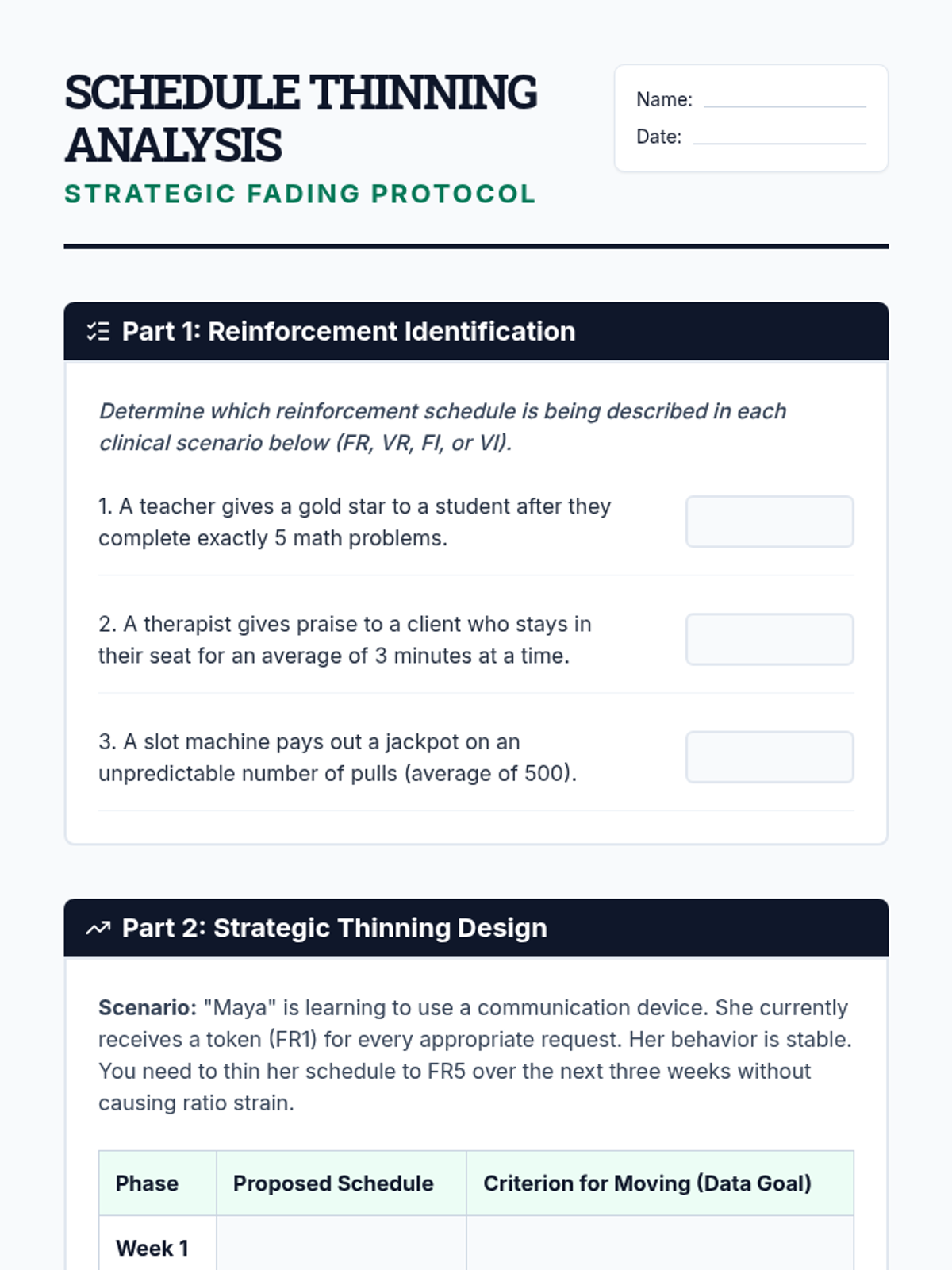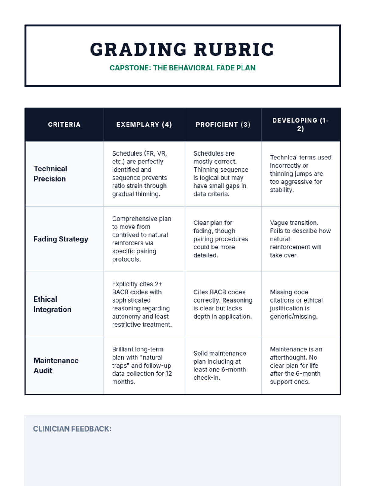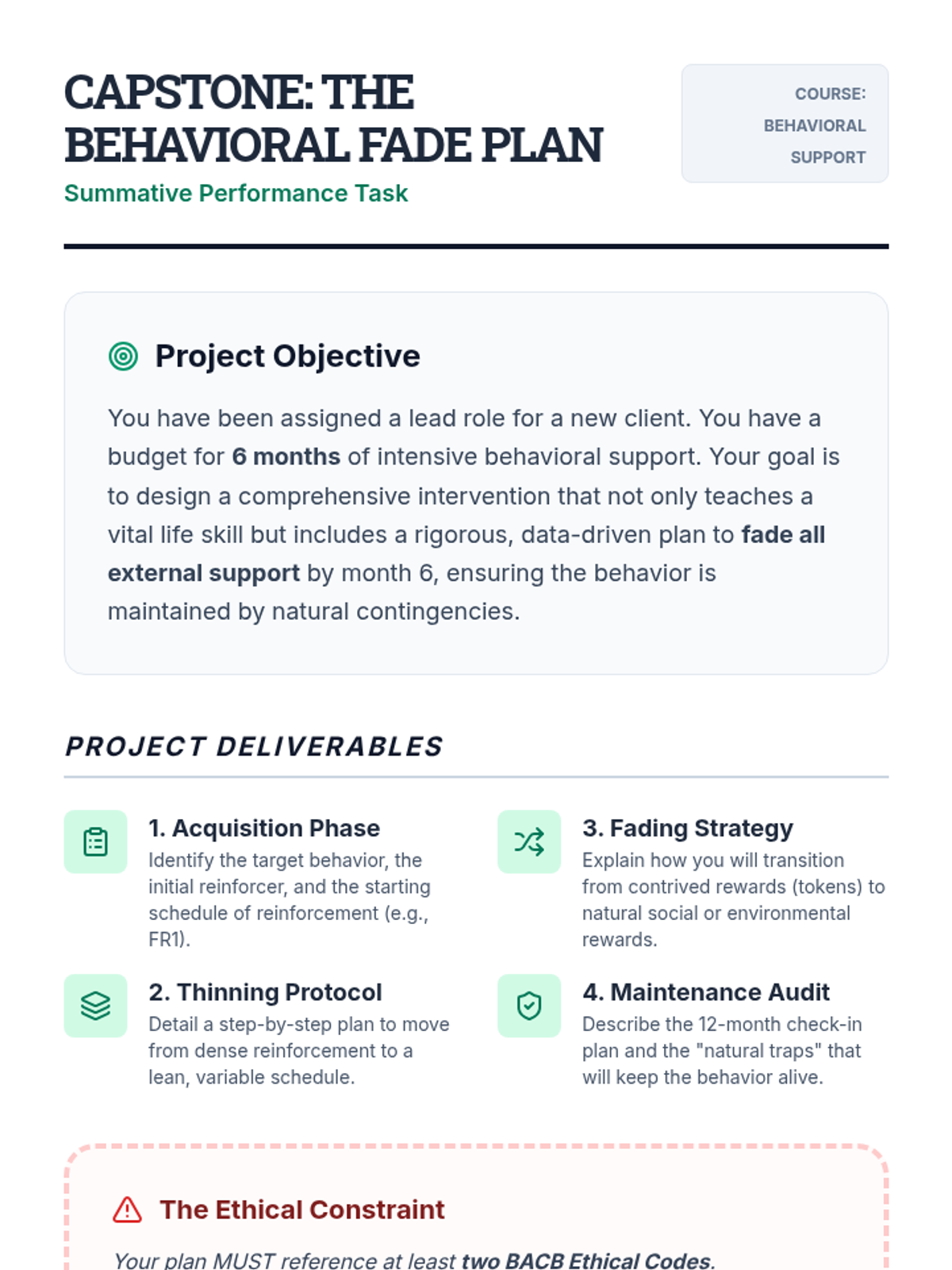 A comprehensive sequence for undergraduate students exploring the ethical transition from external reinforcement to natural contingencies. Students analyze ethics codes, debate motivation theories, and master technical strategies for fading support and ensuring long-term behavior maintenance.