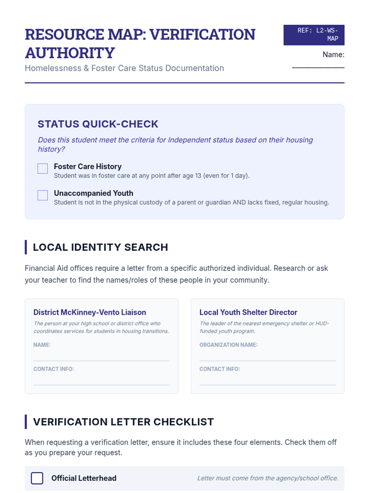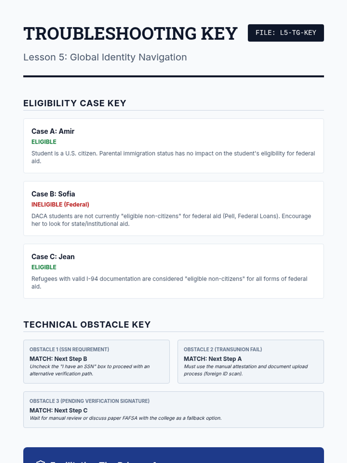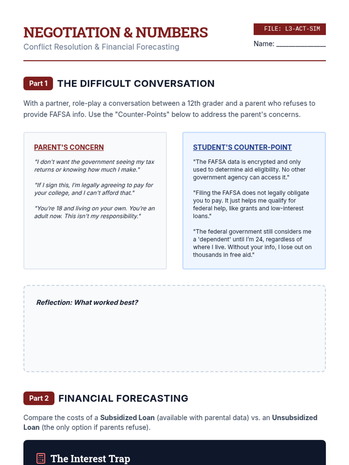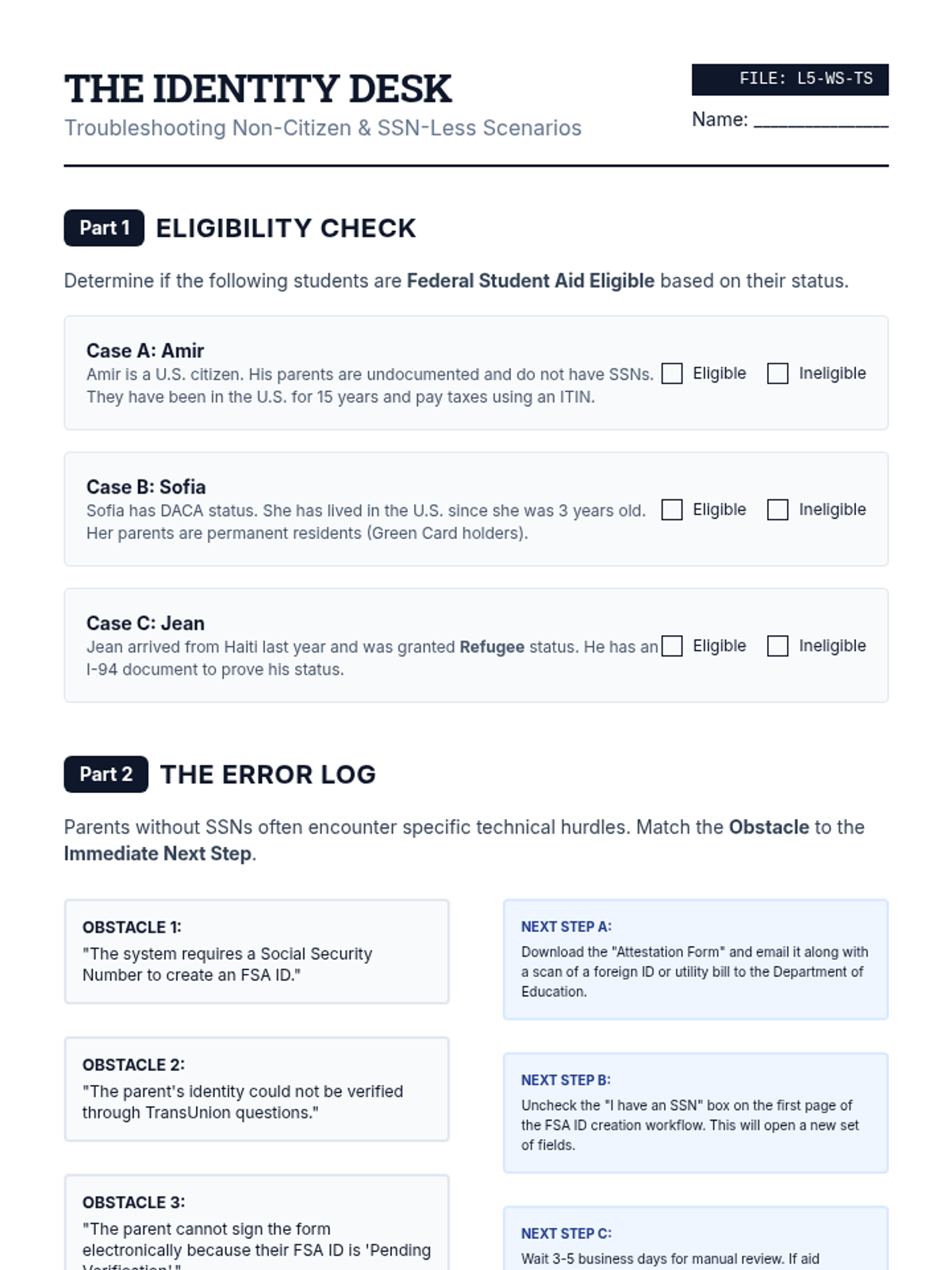 This sequence uses a case study methodology to help 12th-grade students navigate complex FAFSA scenarios, including unusual circumstances, homelessness, parental refusal, and professional judgment appeals. Students develop self-advocacy and technical navigation skills to ensure equitable financial aid assessment.
