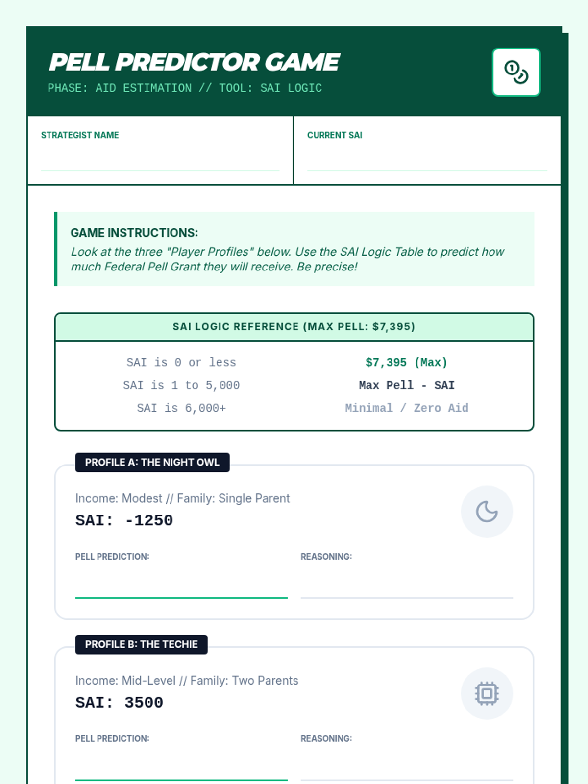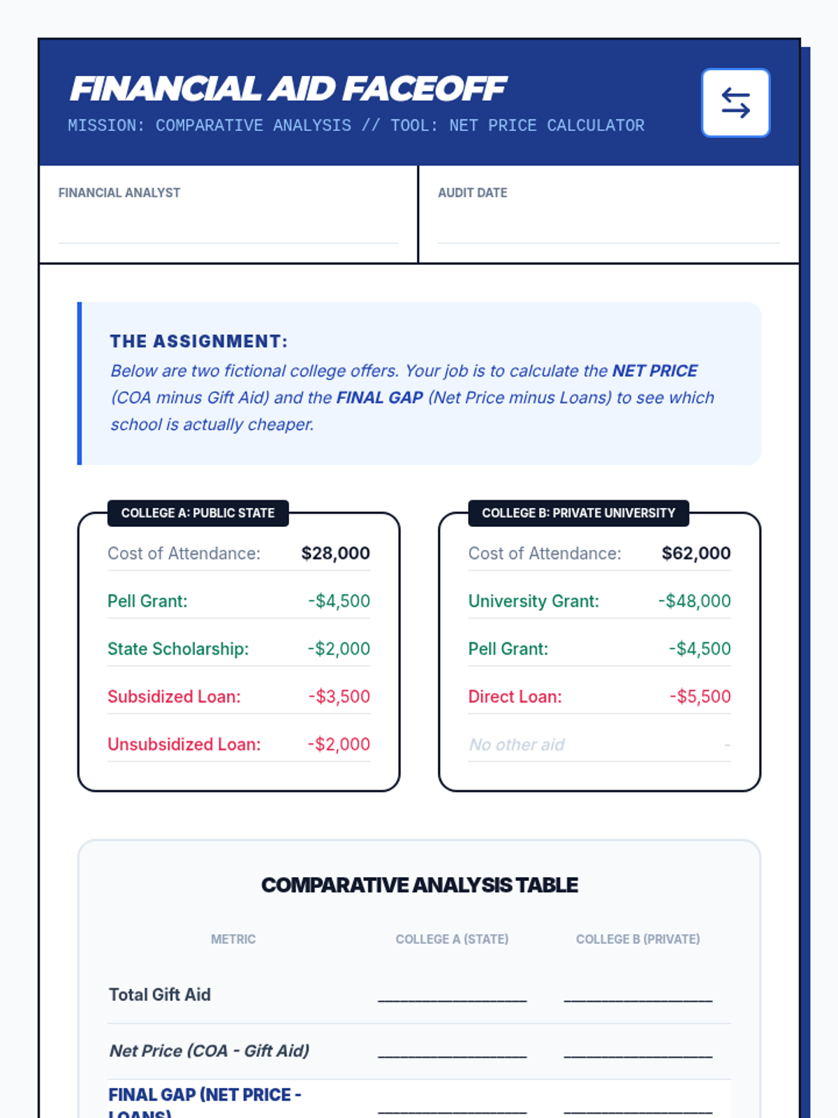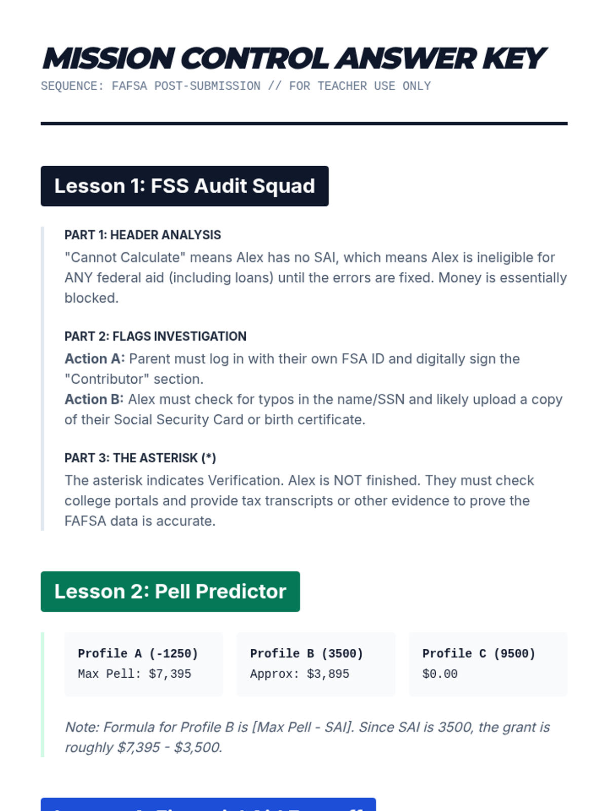This mastery-based sequence guides 12th-grade students through the post-FAFSA submission phase, teaching them to interpret the FAFSA Submission Summary (FSS), understand the Student Aid Index (SAI), navigate verification, and compare financial aid award letters. Students develop critical financial literacy skills to determine the true net price of college and make informed enrollment decisions.