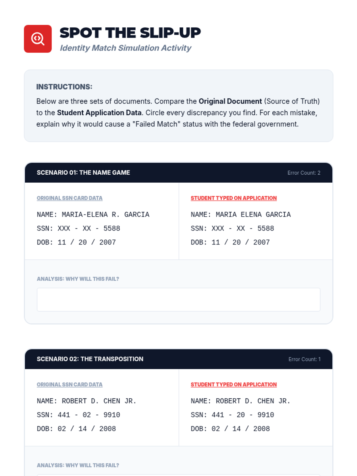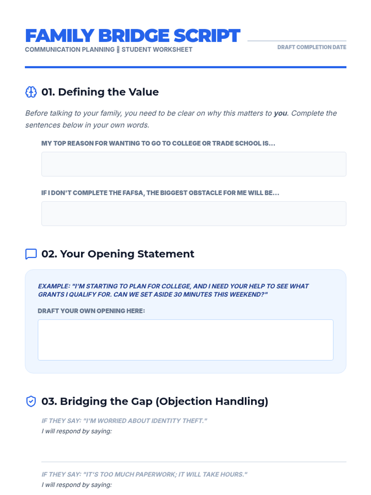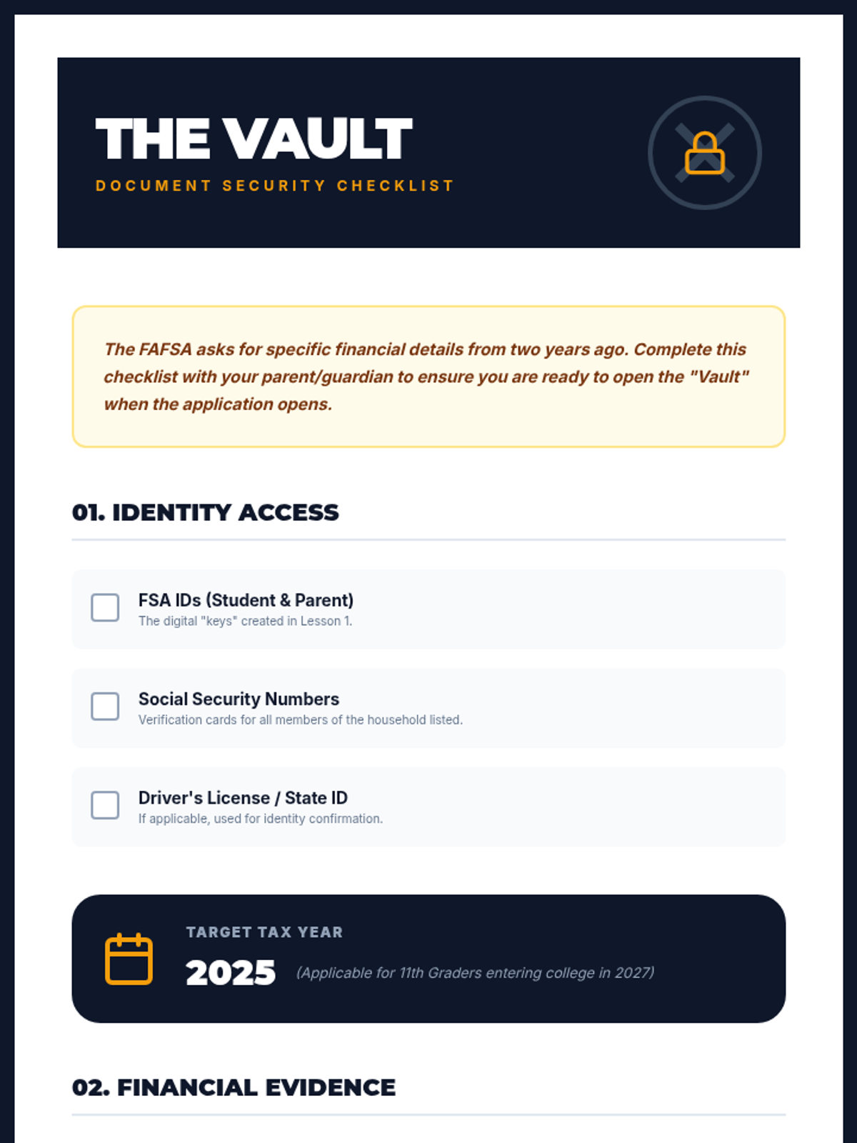 This workshop-style sequence focuses on the logistical preparation required before opening the FAFSA application. Students guide their families through the process of gathering necessary tax documents and successfully creating an FSA ID, emphasizing digital security and communication.
