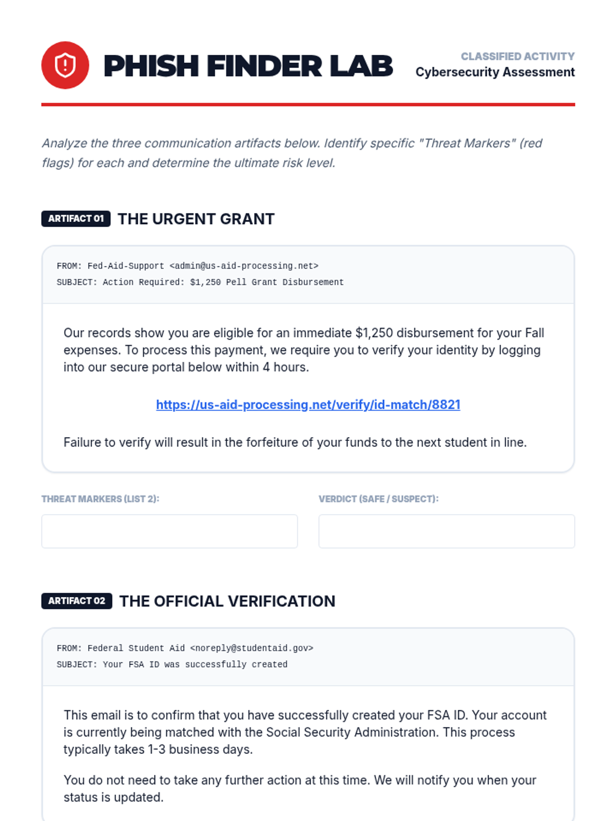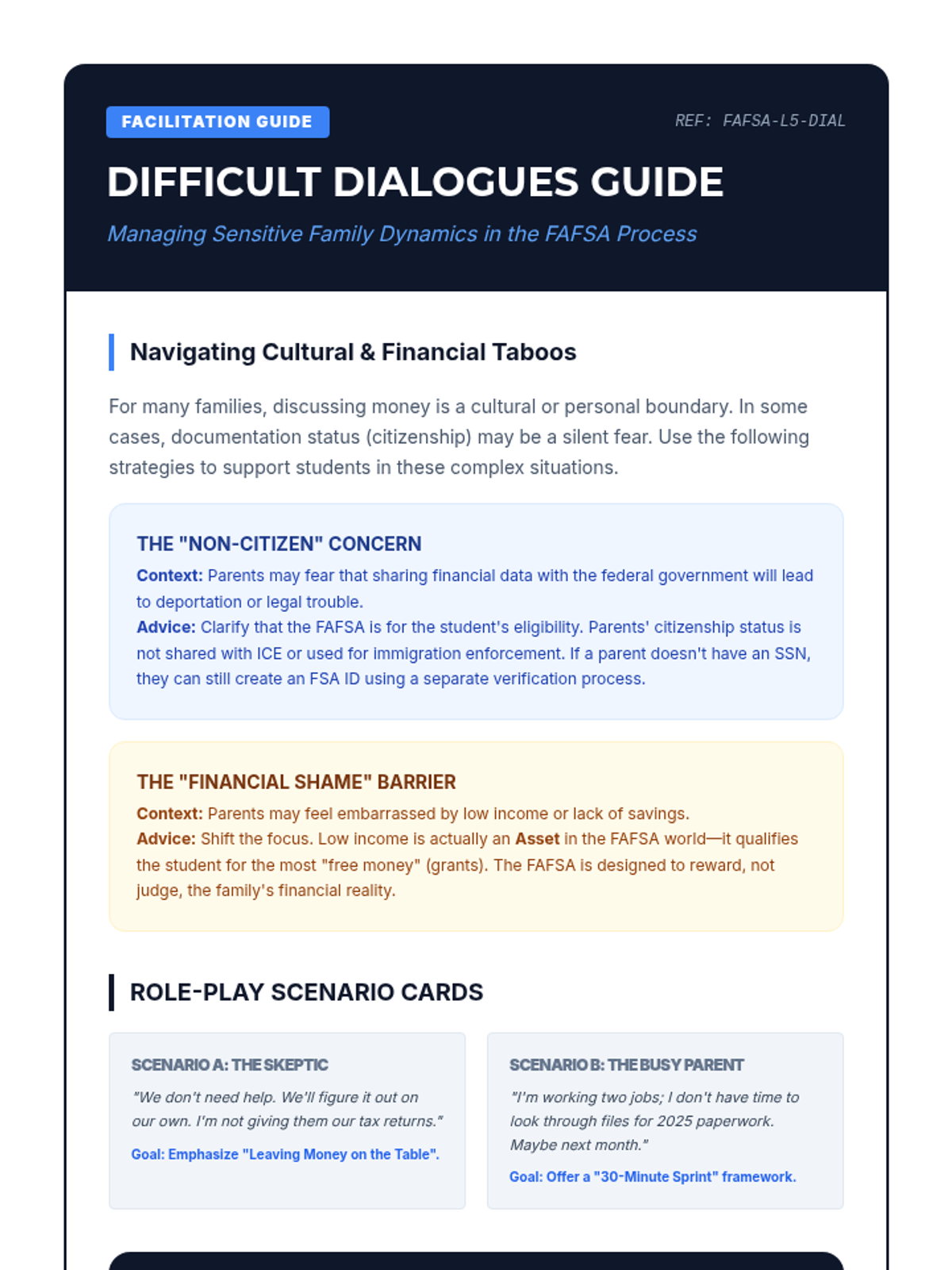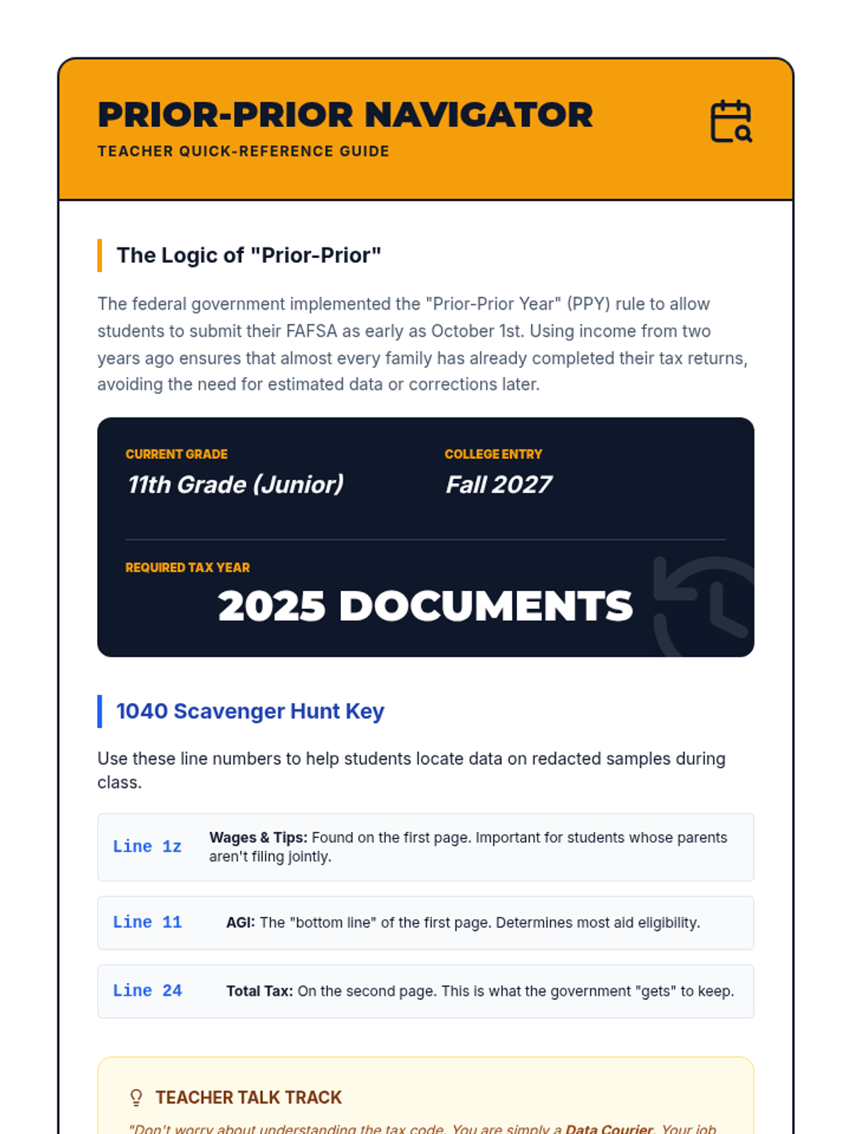 This workshop-style sequence focuses on the logistical preparation required before opening the FAFSA application. Students guide their families through the process of gathering necessary tax documents and successfully creating an FSA ID, emphasizing digital security and communication.
