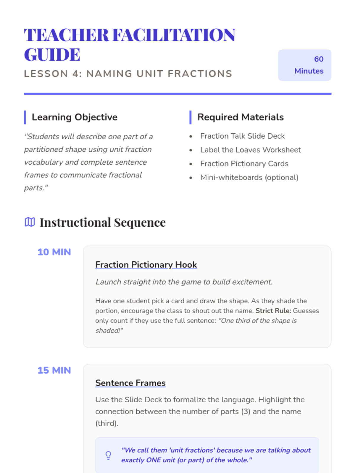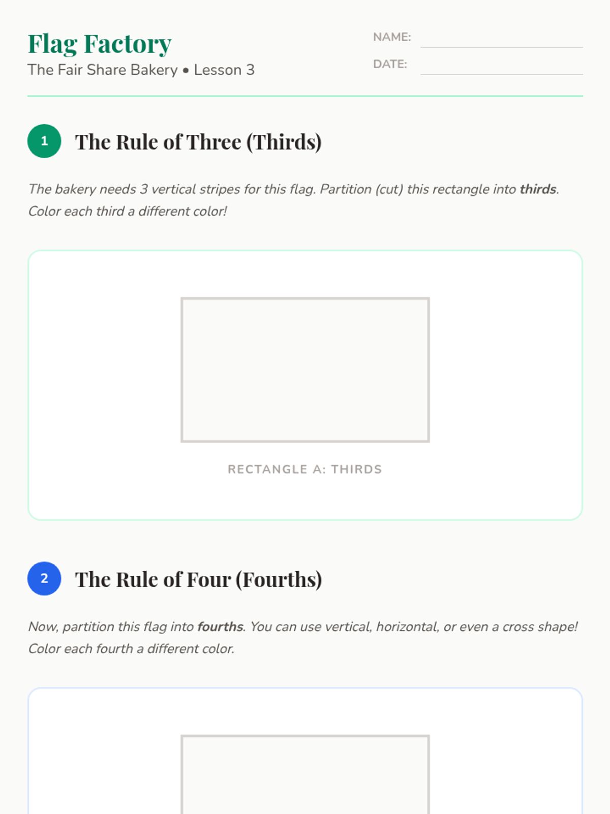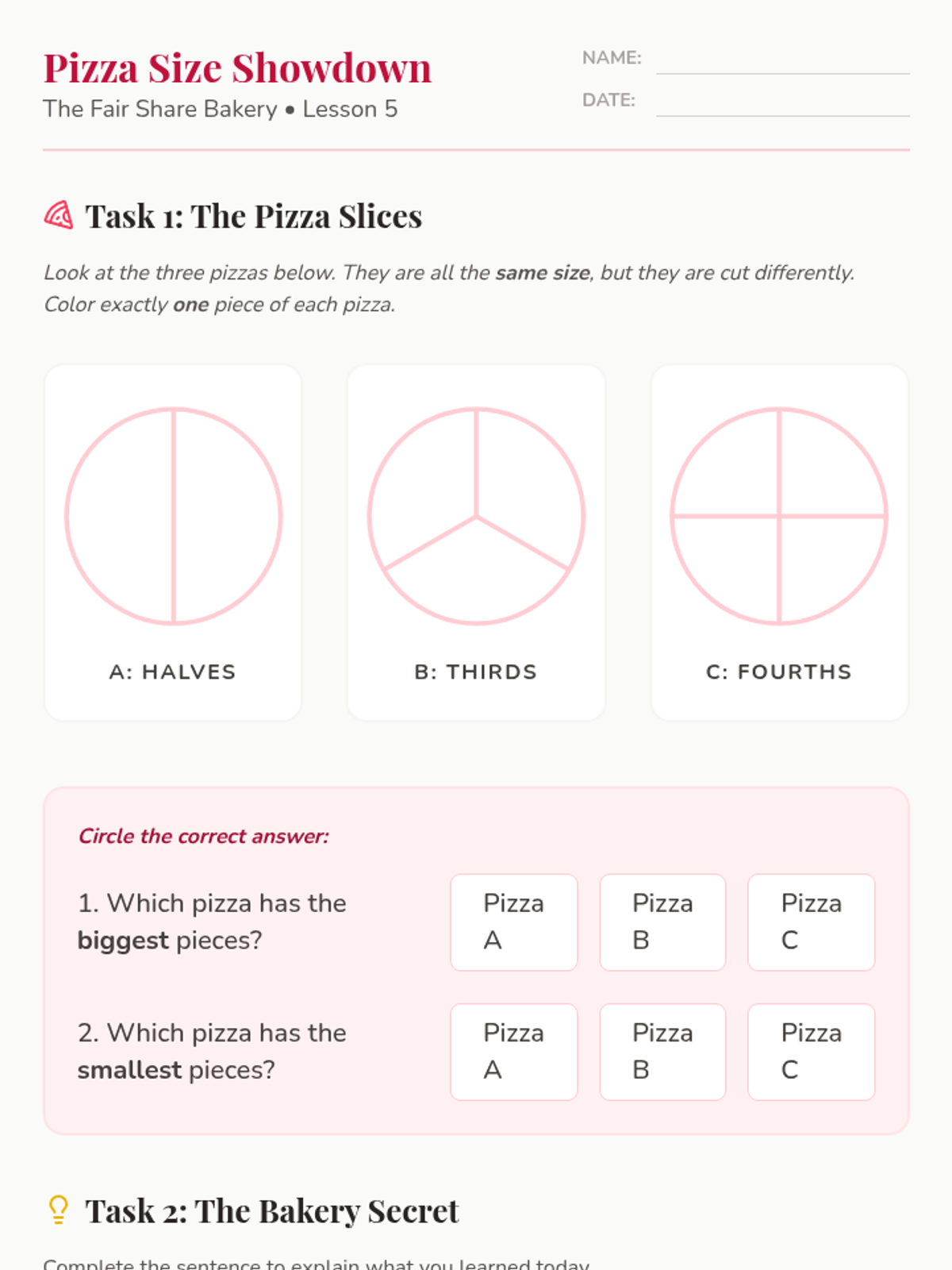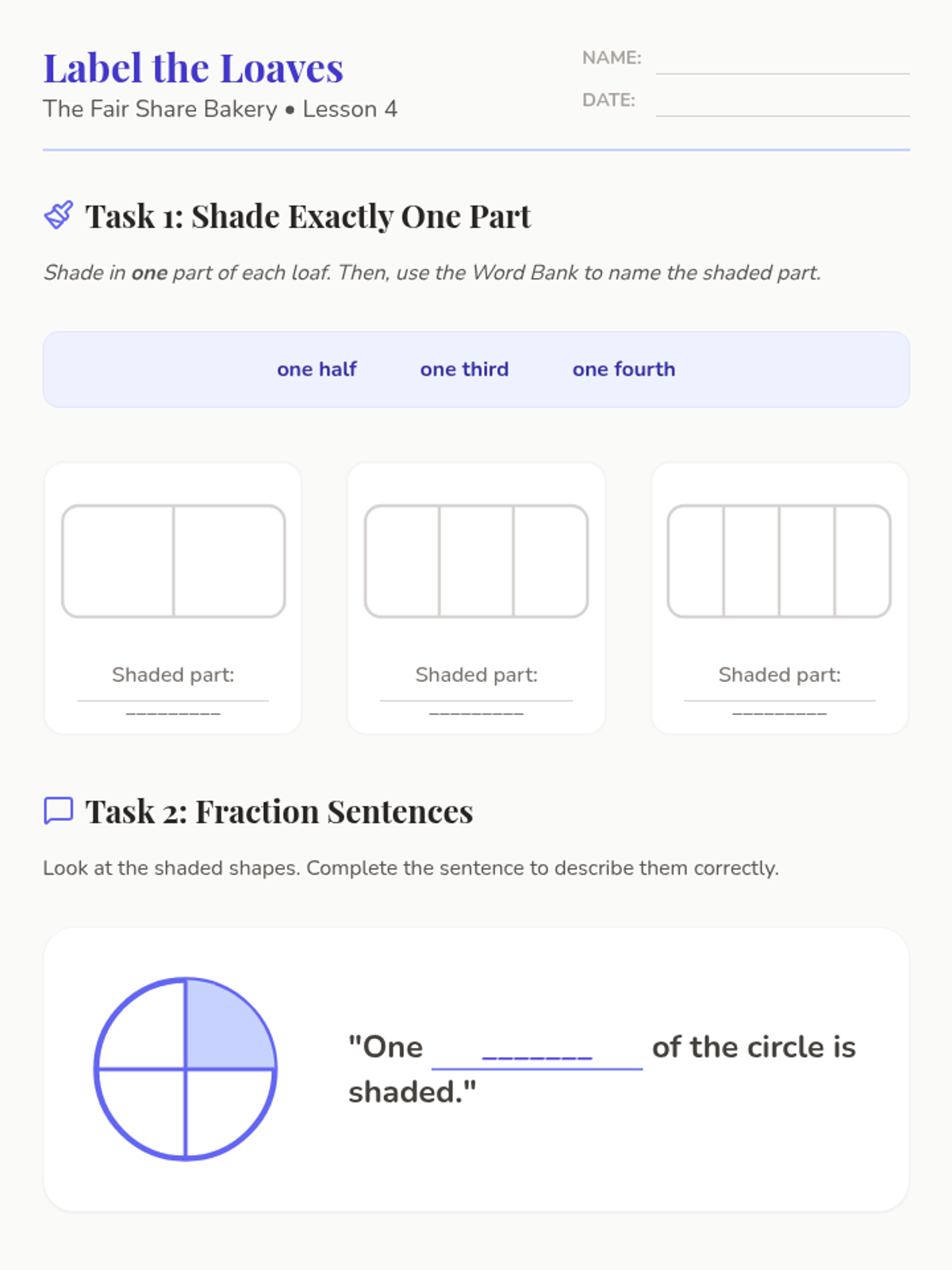 A 5-lesson 2nd Grade math unit exploring fractions through the lens of a bakery theme. Students learn to distinguish equal shares, partition shapes into halves, thirds, and fourths, name unit fractions, and understand that more shares result in smaller pieces.