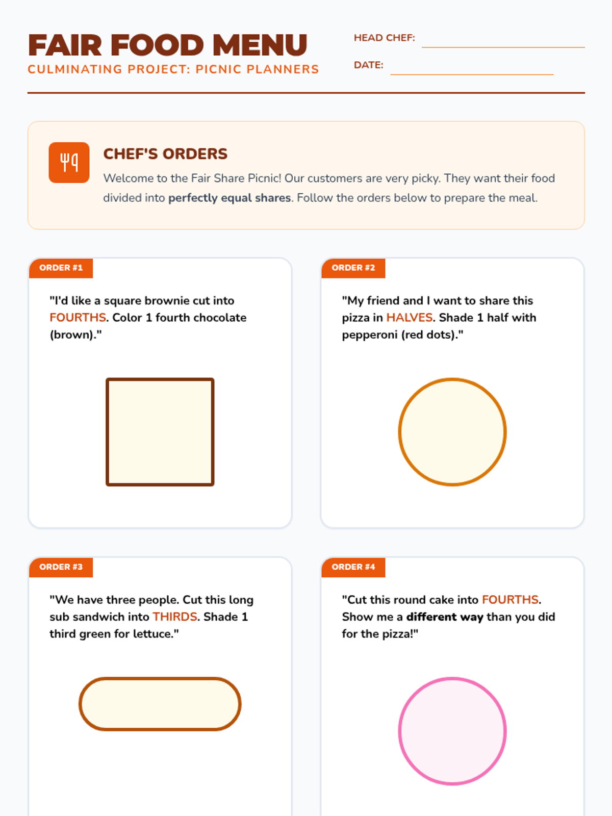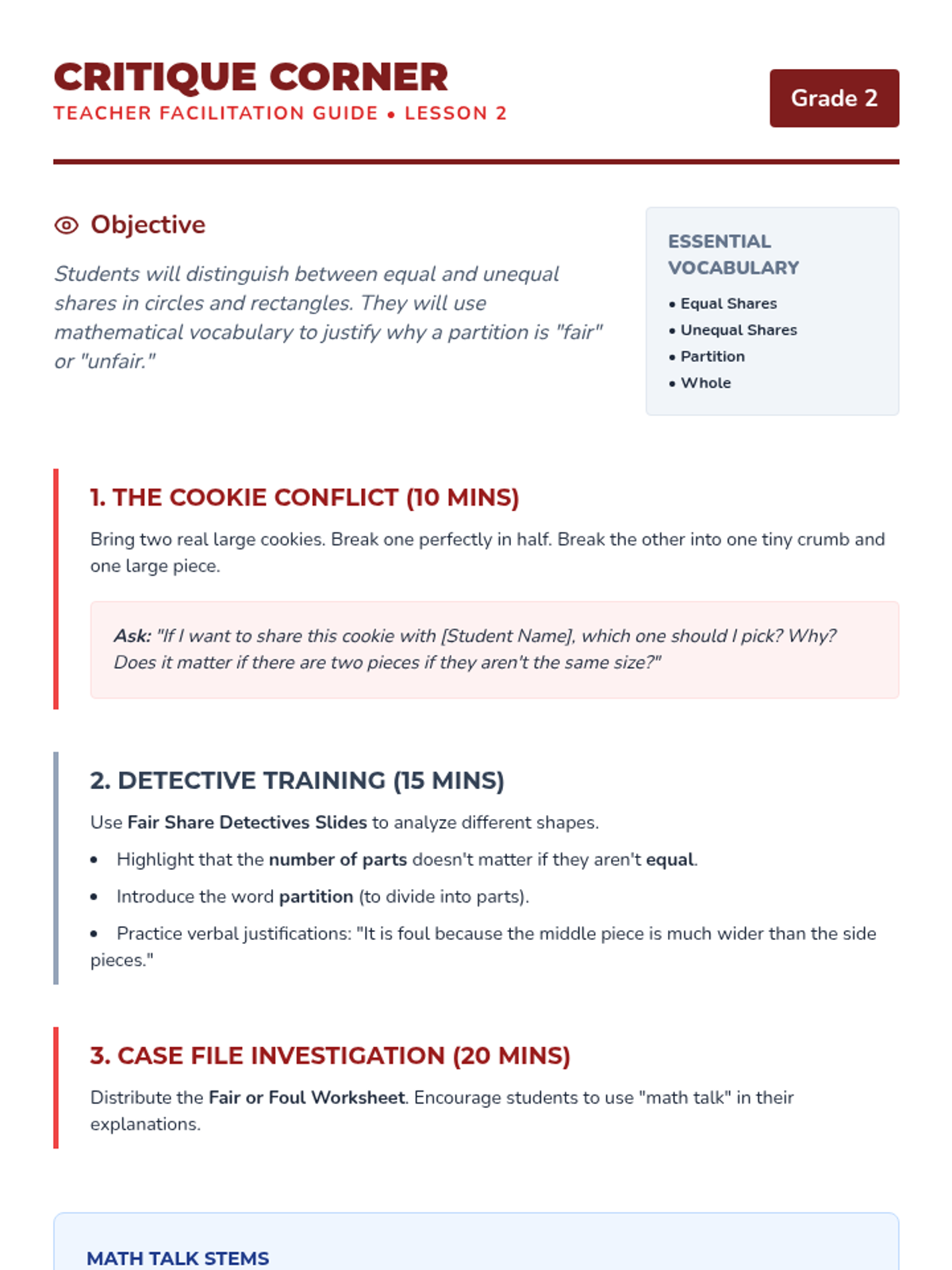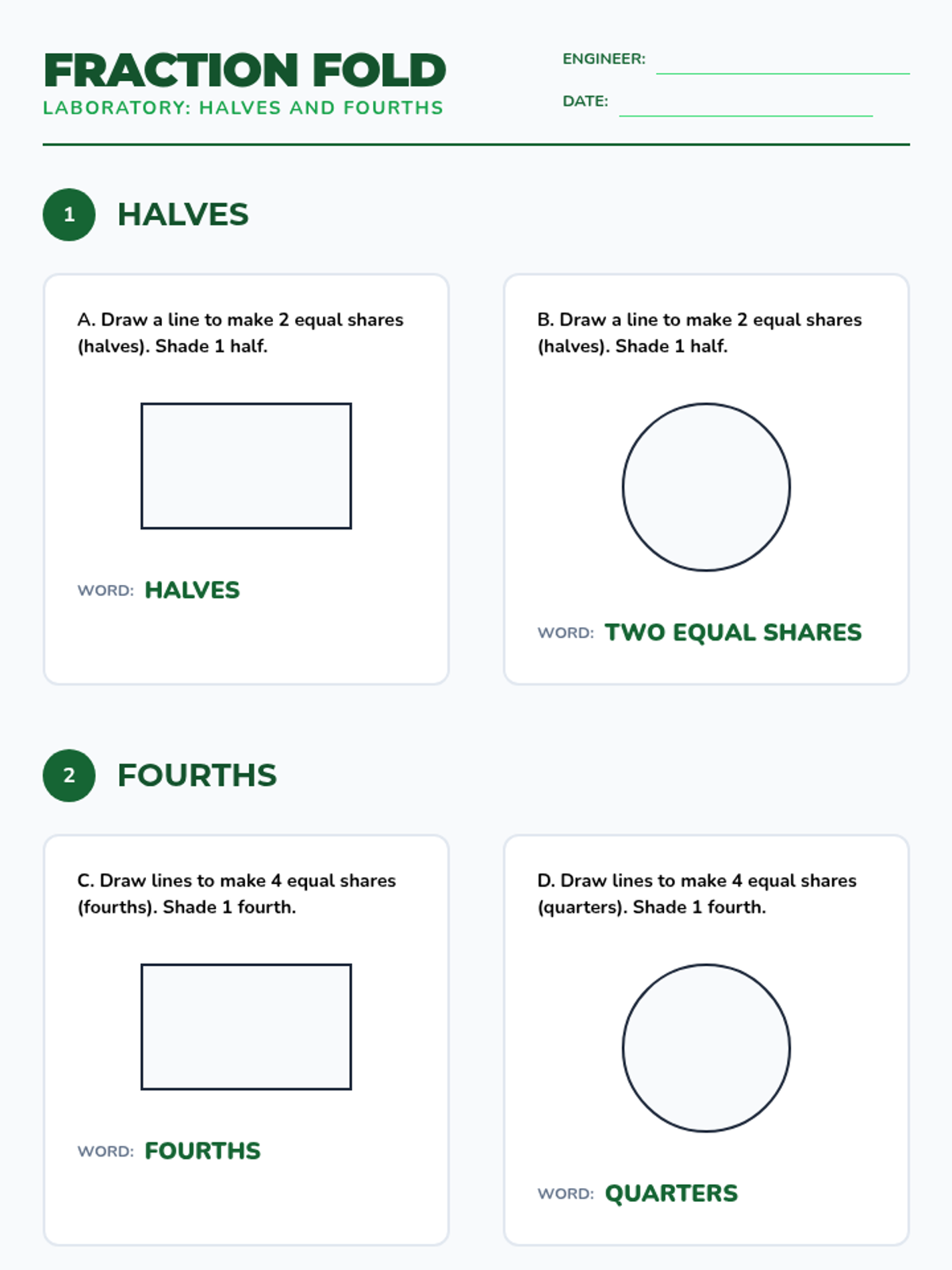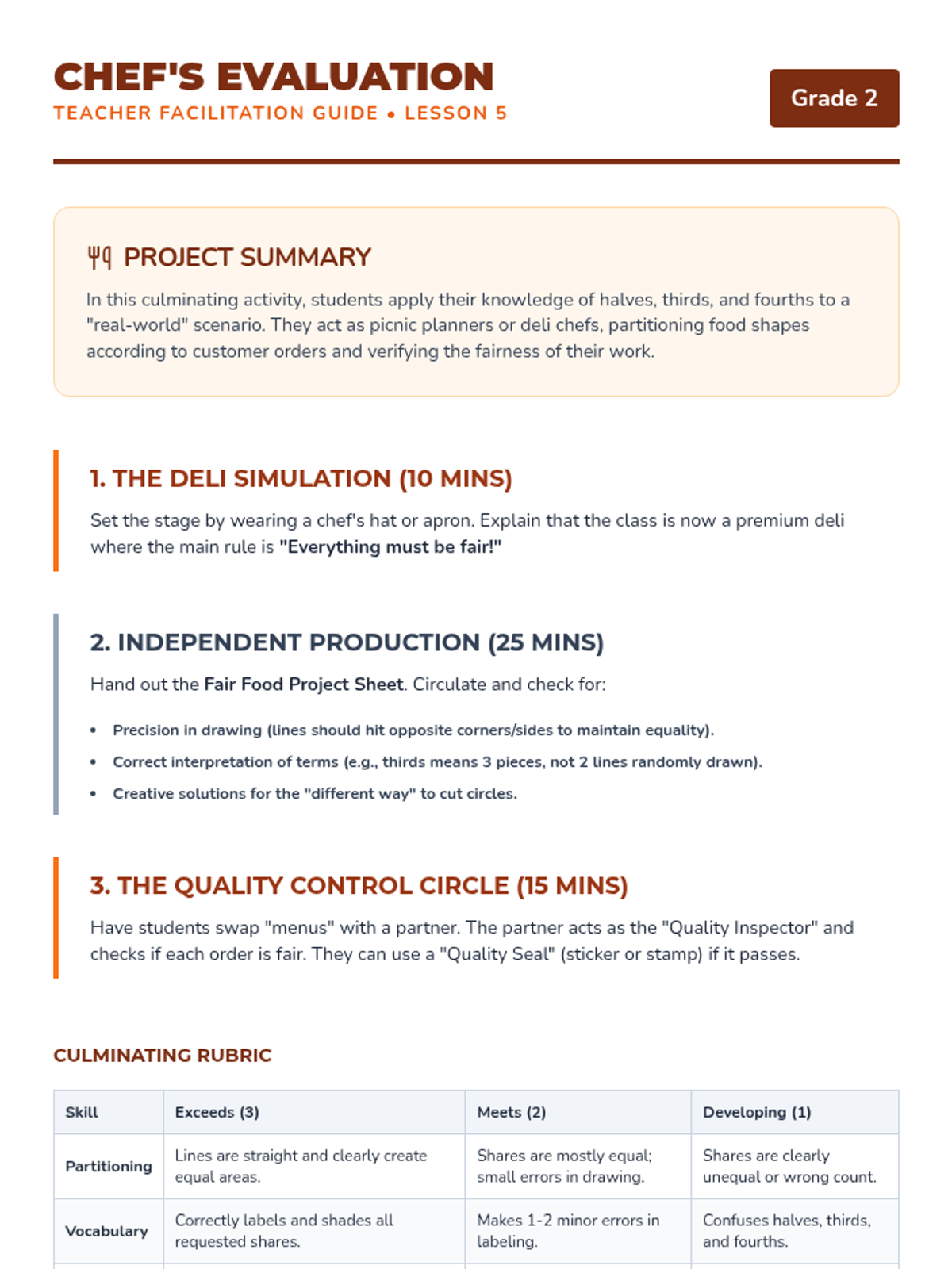A 2nd-grade geometry unit that transitions from tiling rectangles with square units to partitioning shapes into halves, thirds, and fourths. Students develop spatial reasoning and foundational fraction concepts through hands-on construction and 'fair share' scenarios.