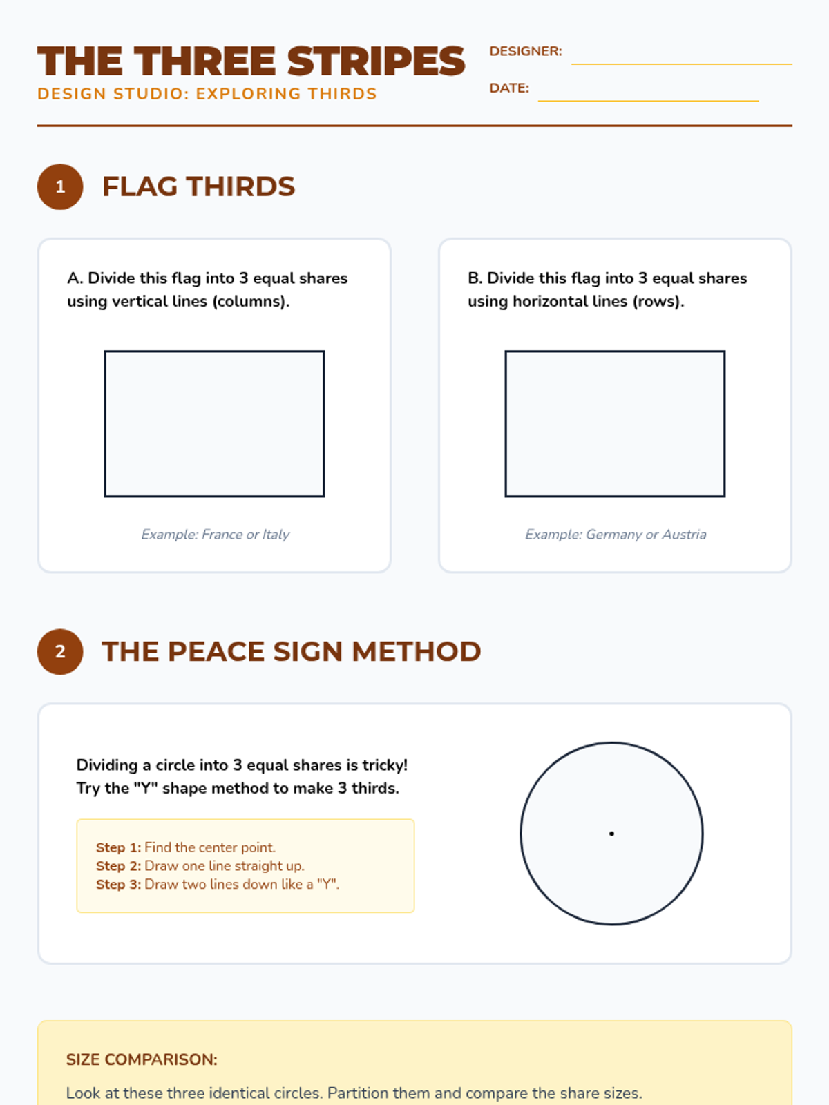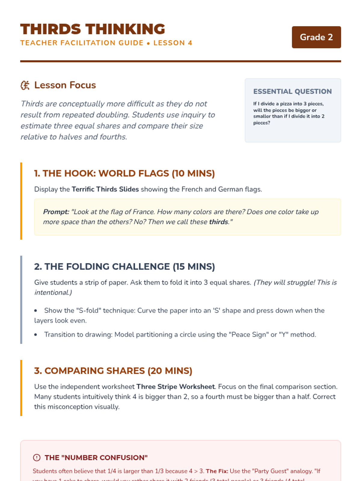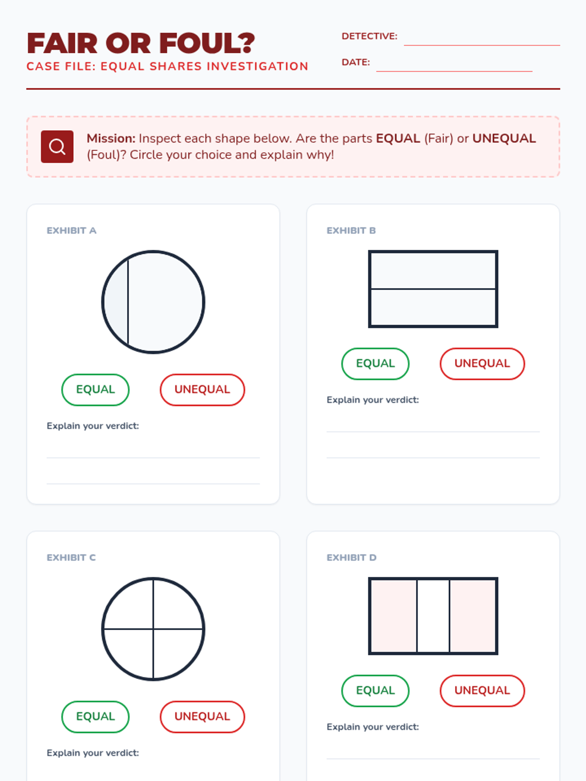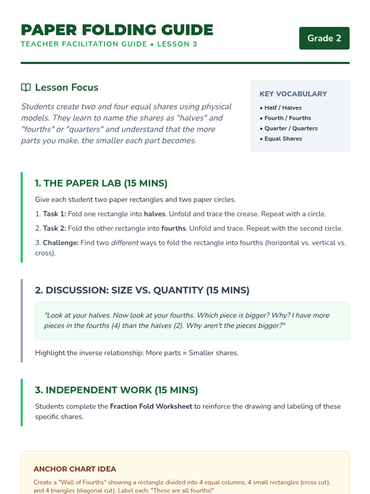 A 2nd-grade geometry unit that transitions from tiling rectangles with square units to partitioning shapes into halves, thirds, and fourths. Students develop spatial reasoning and foundational fraction concepts through hands-on construction and 'fair share' scenarios.