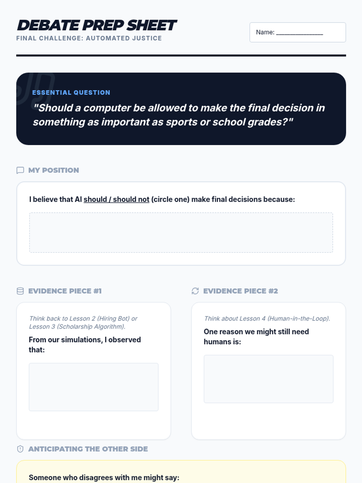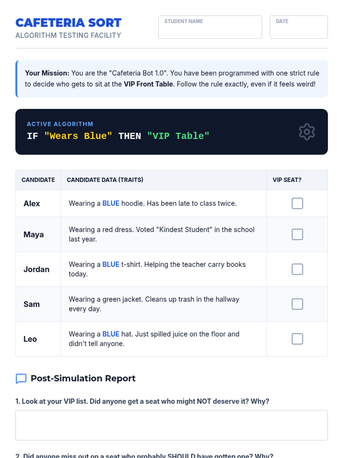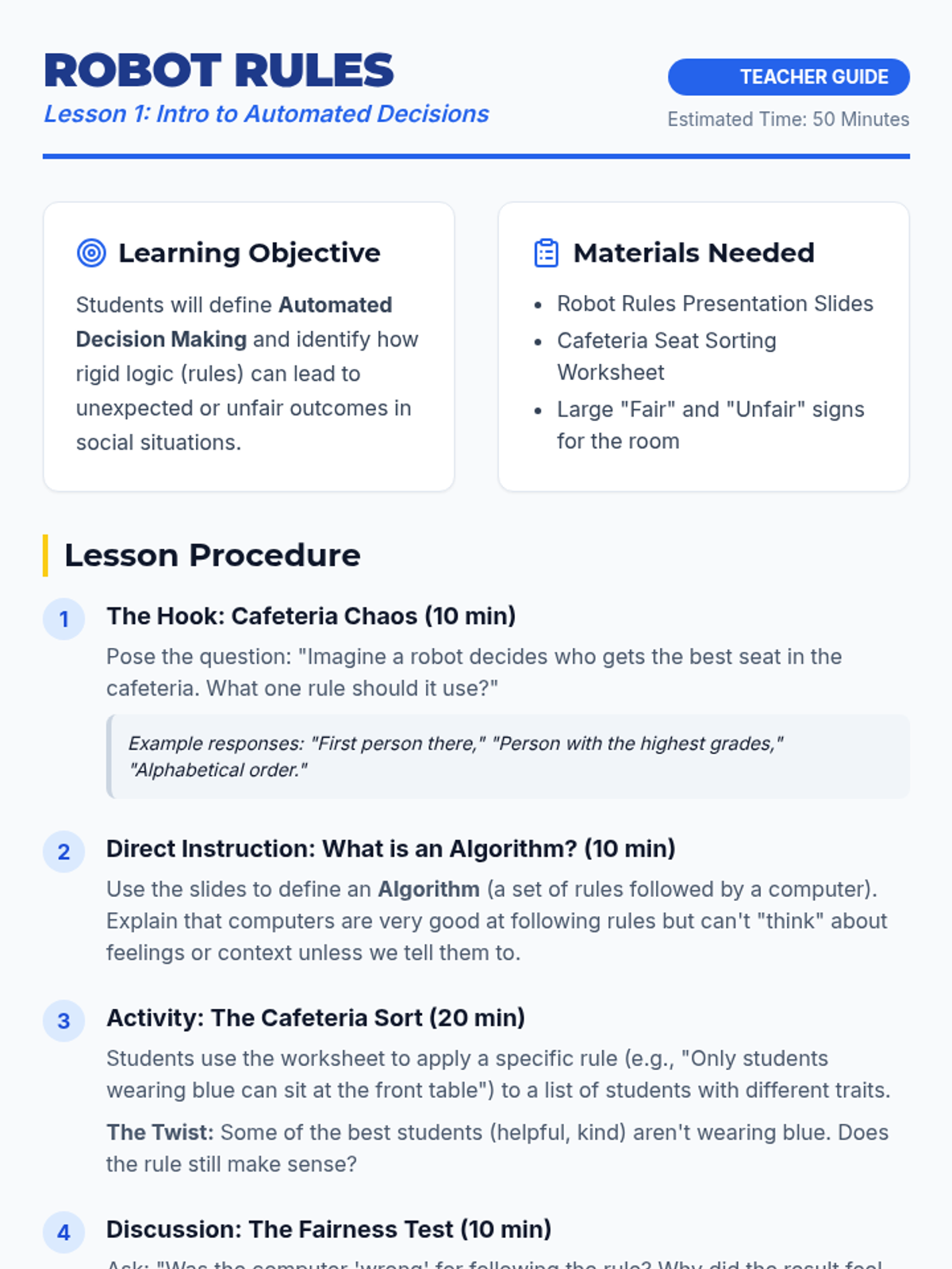 A 5-lesson exploration for 5th graders on how AI systems make decisions and the ethical implications of automated fairness. Students participate in simulations to understand the necessity of human oversight and the subjective nature of 'fairness'.