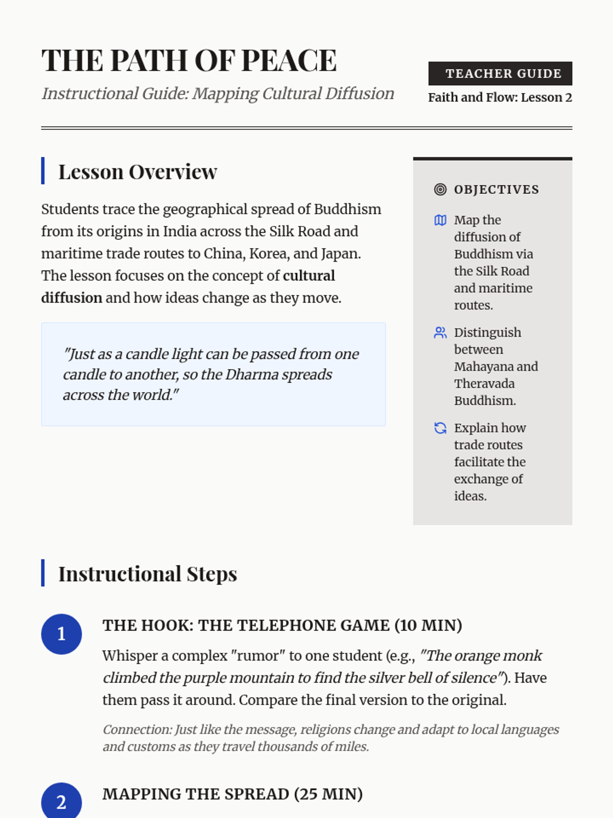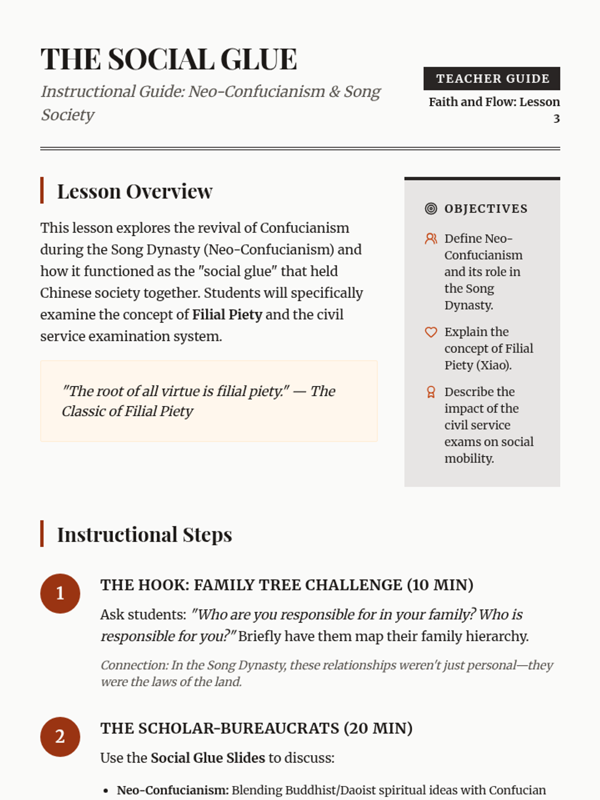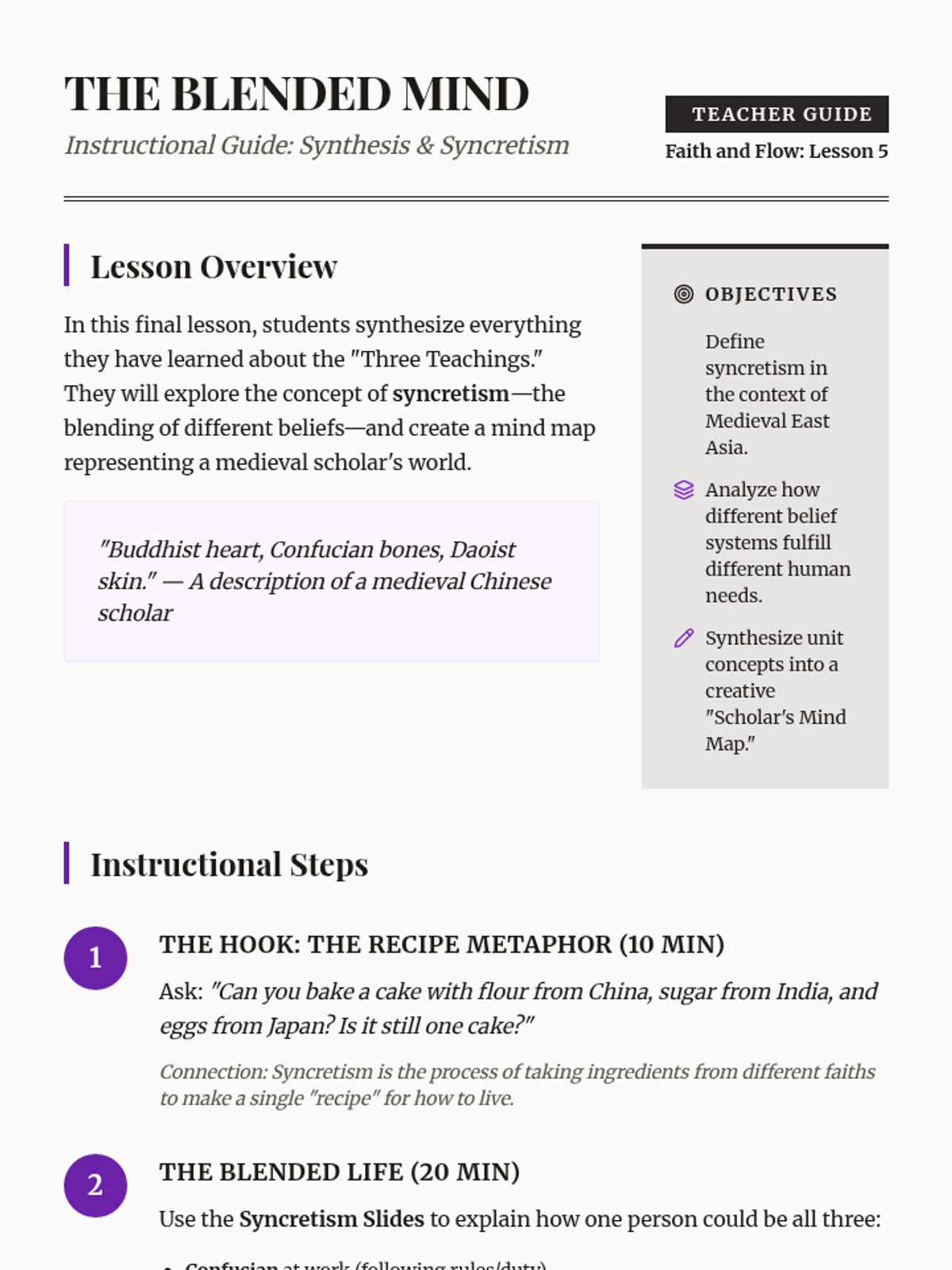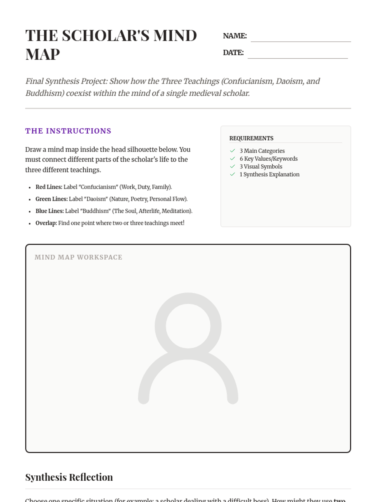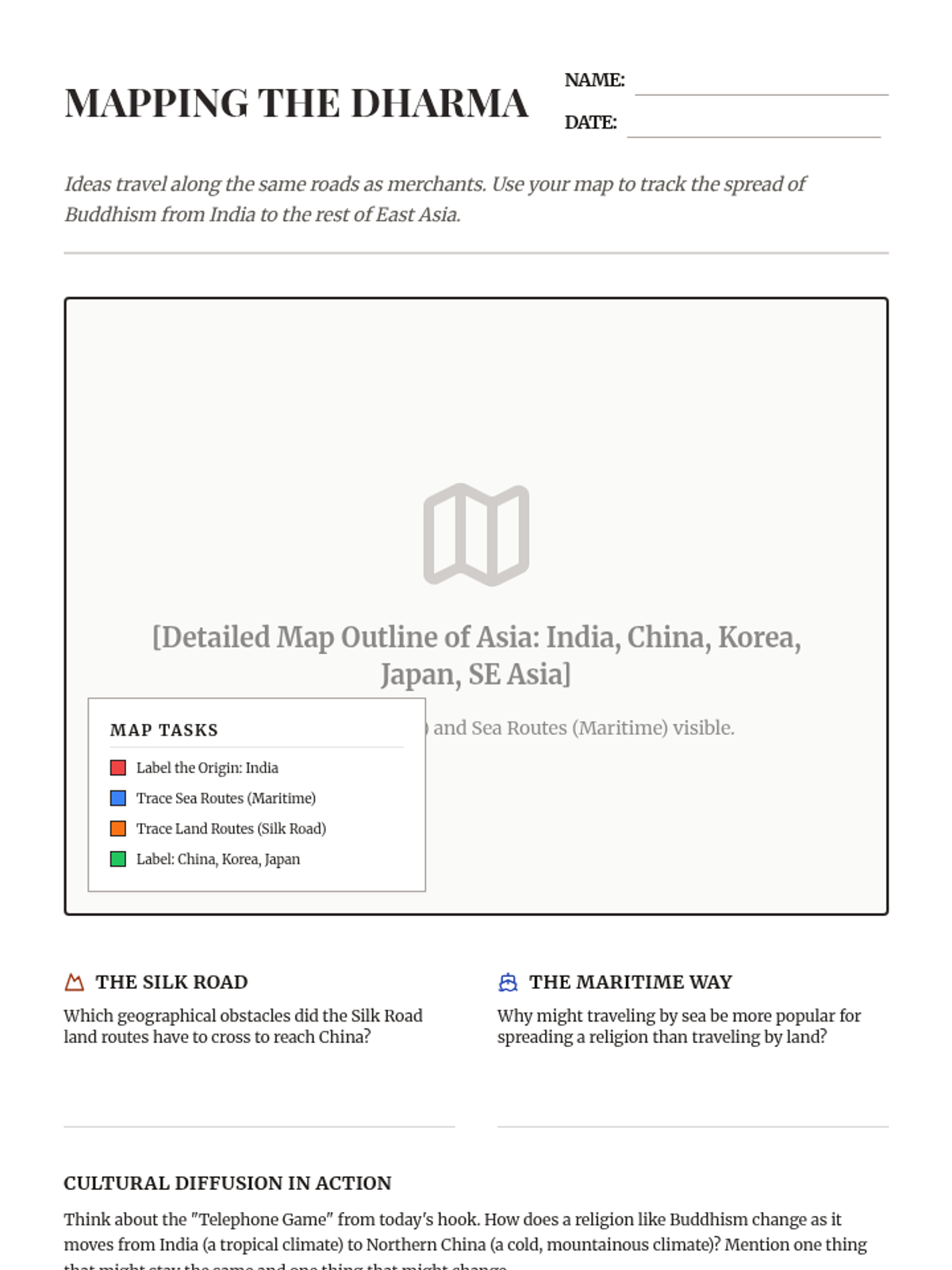 This sequence tracks the movement and transformation of belief systems across Medieval Asia. Students map the spread of Buddhism from India to China, Korea, and Japan, and examine the foundational role of Confucianism in Chinese society. Through case studies of specific monks and scholars, students see how religions adapt to local cultures. The sequence builds toward an understanding of how Neo-Confucianism blended these philosophies, shaping the social fabric of the Ming and Song dynasties.