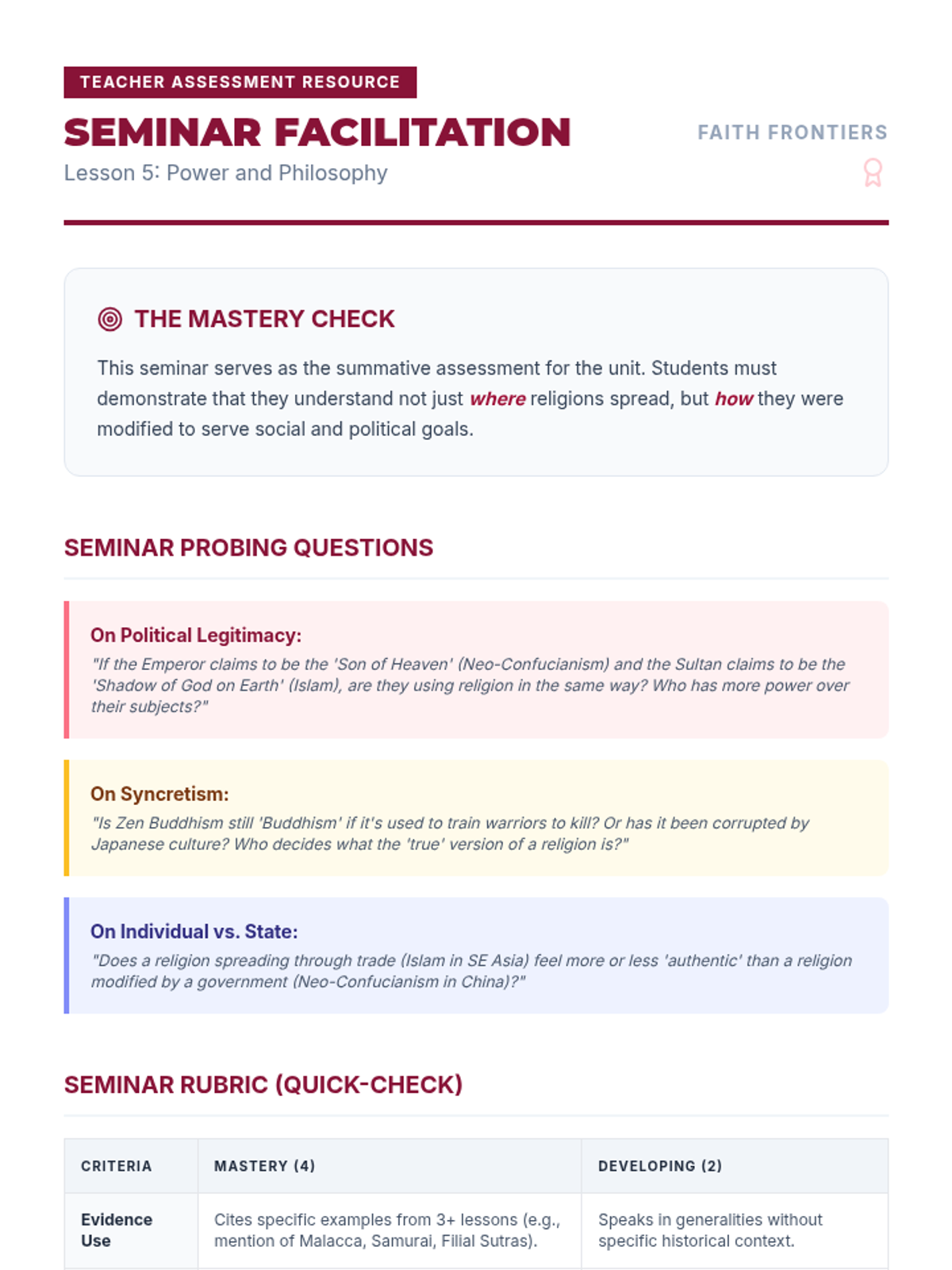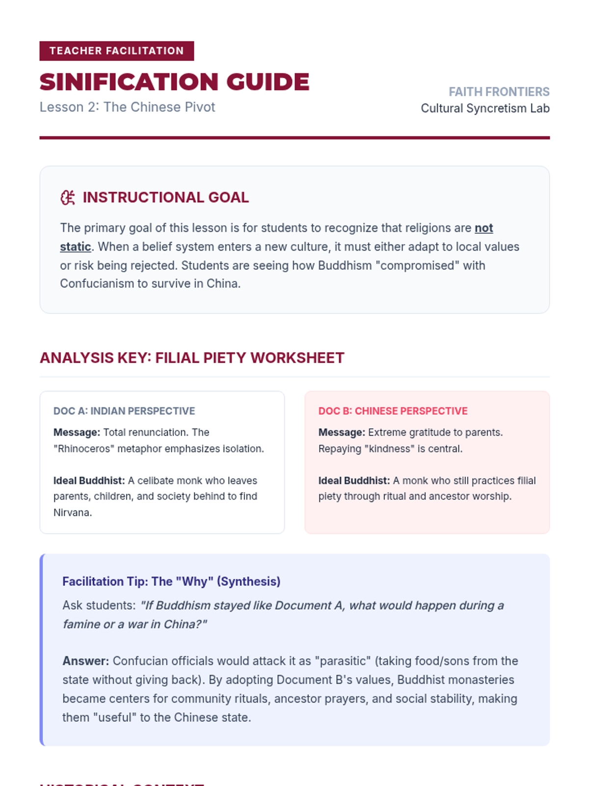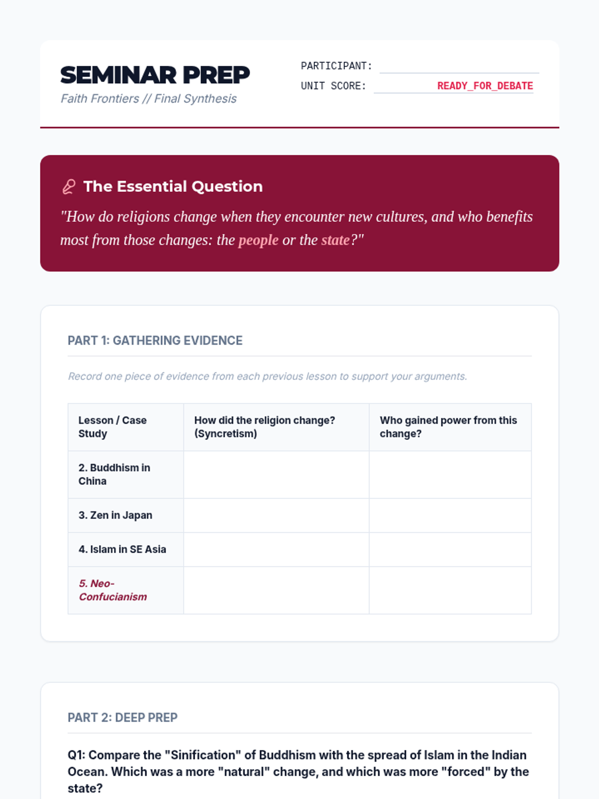 A high school history sequence investigating the diffusion and syncretism of Buddhism, Islam, and Neo-Confucianism across Medieval Asia, focusing on how religions adapt to local cultures.