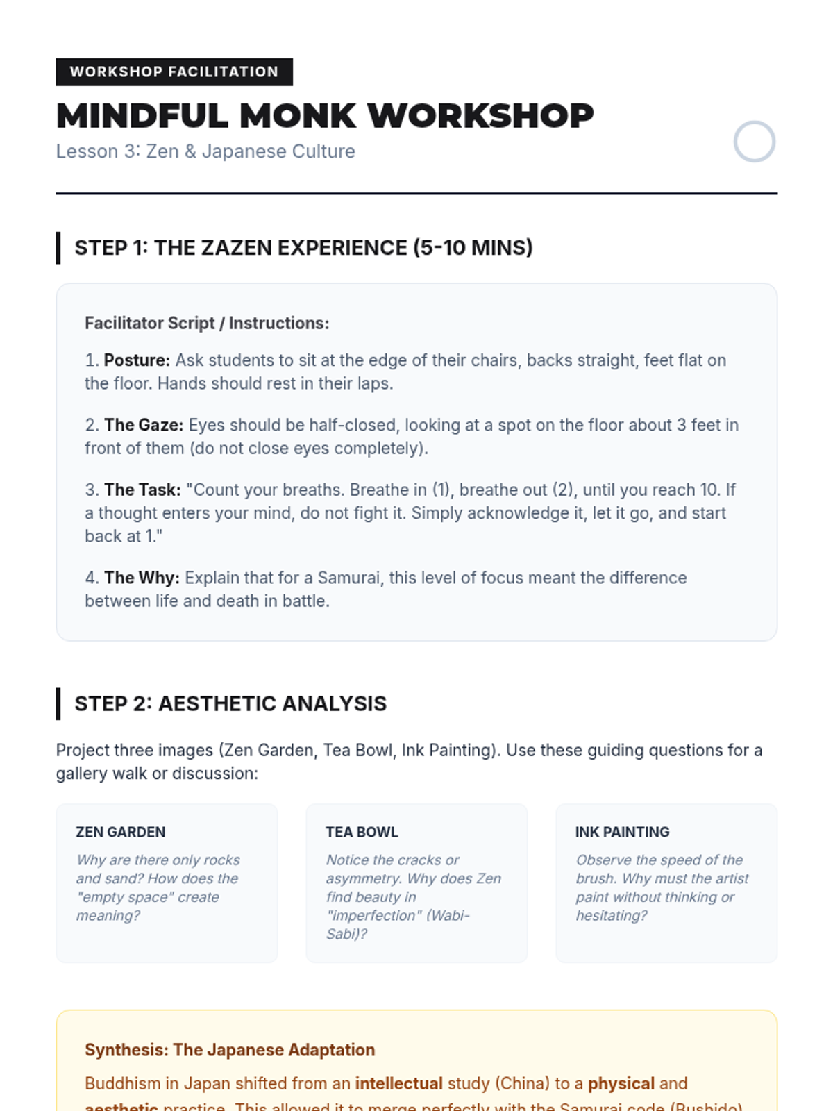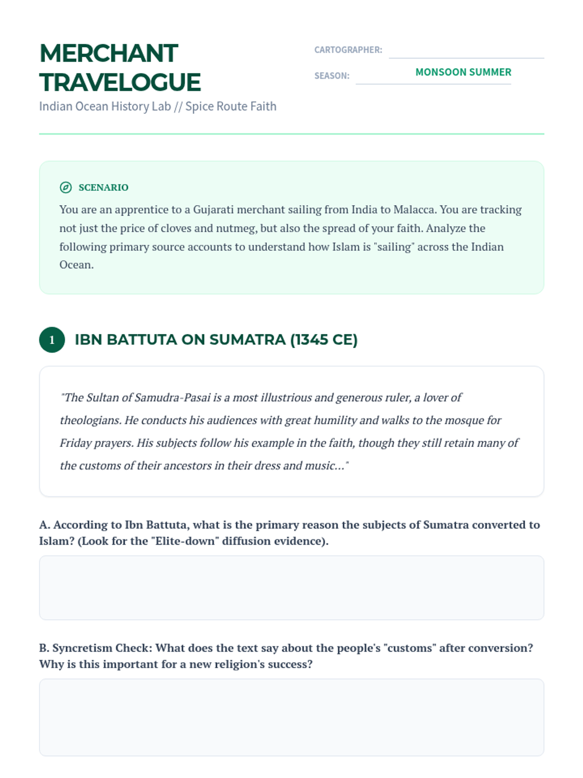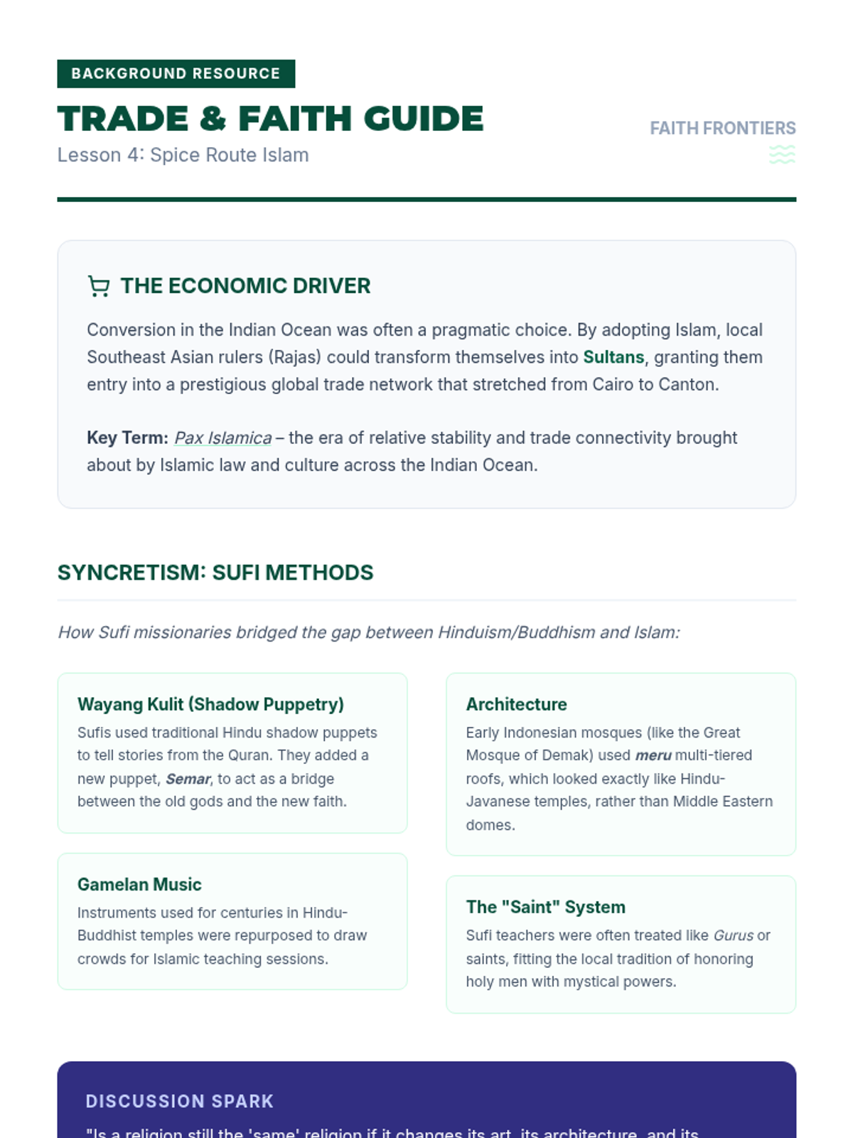 A high school history sequence investigating the diffusion and syncretism of Buddhism, Islam, and Neo-Confucianism across Medieval Asia, focusing on how religions adapt to local cultures.