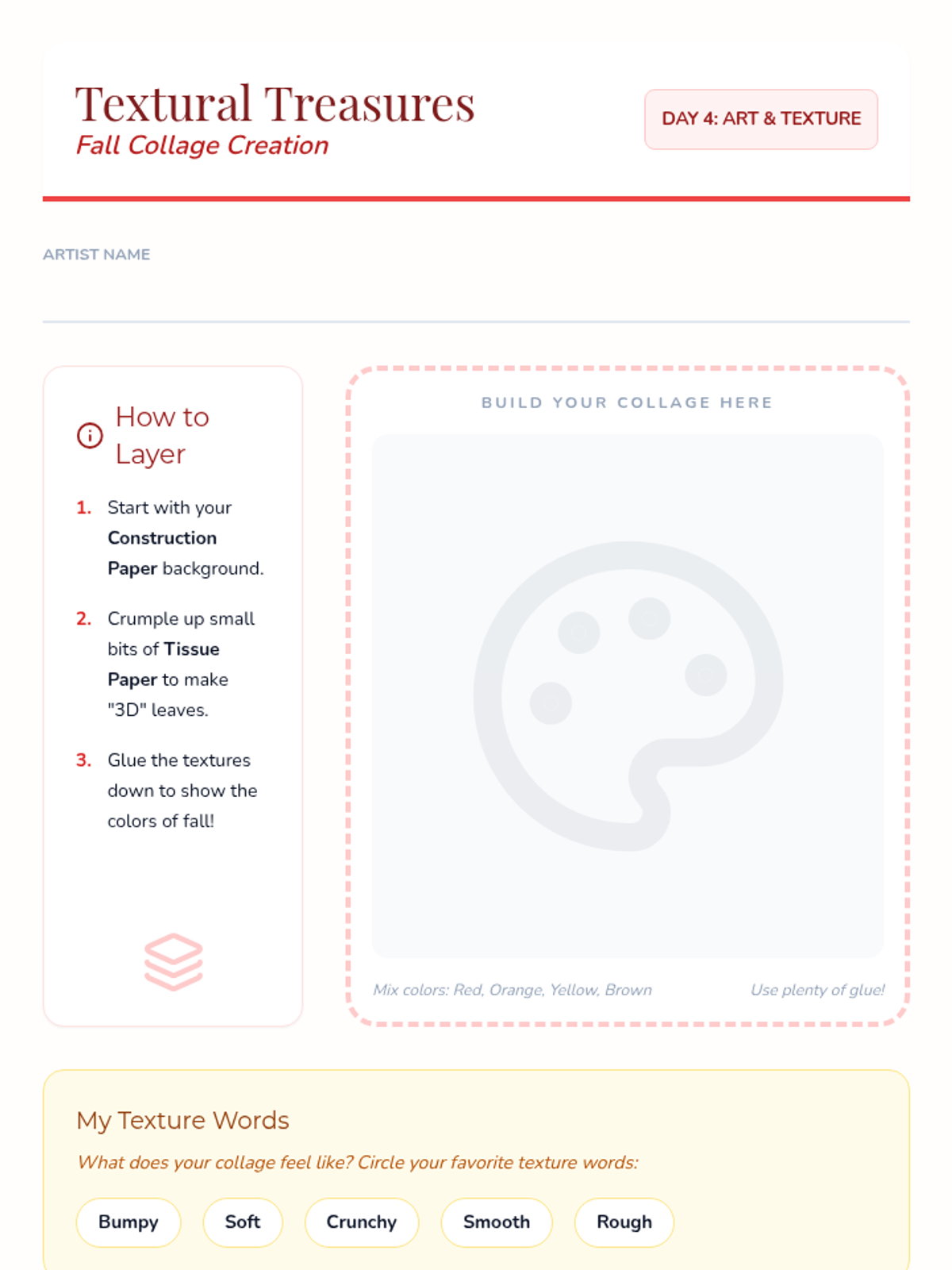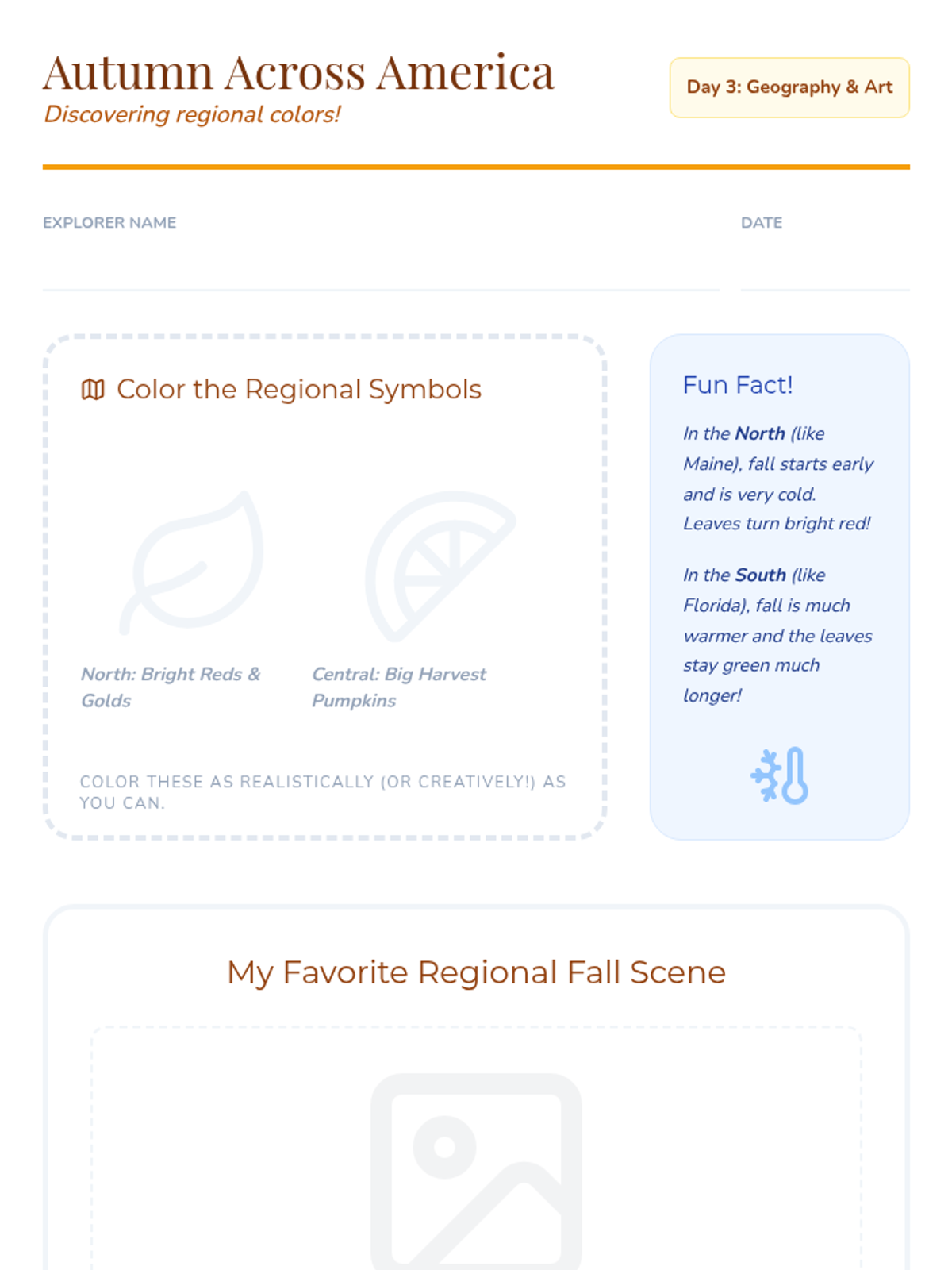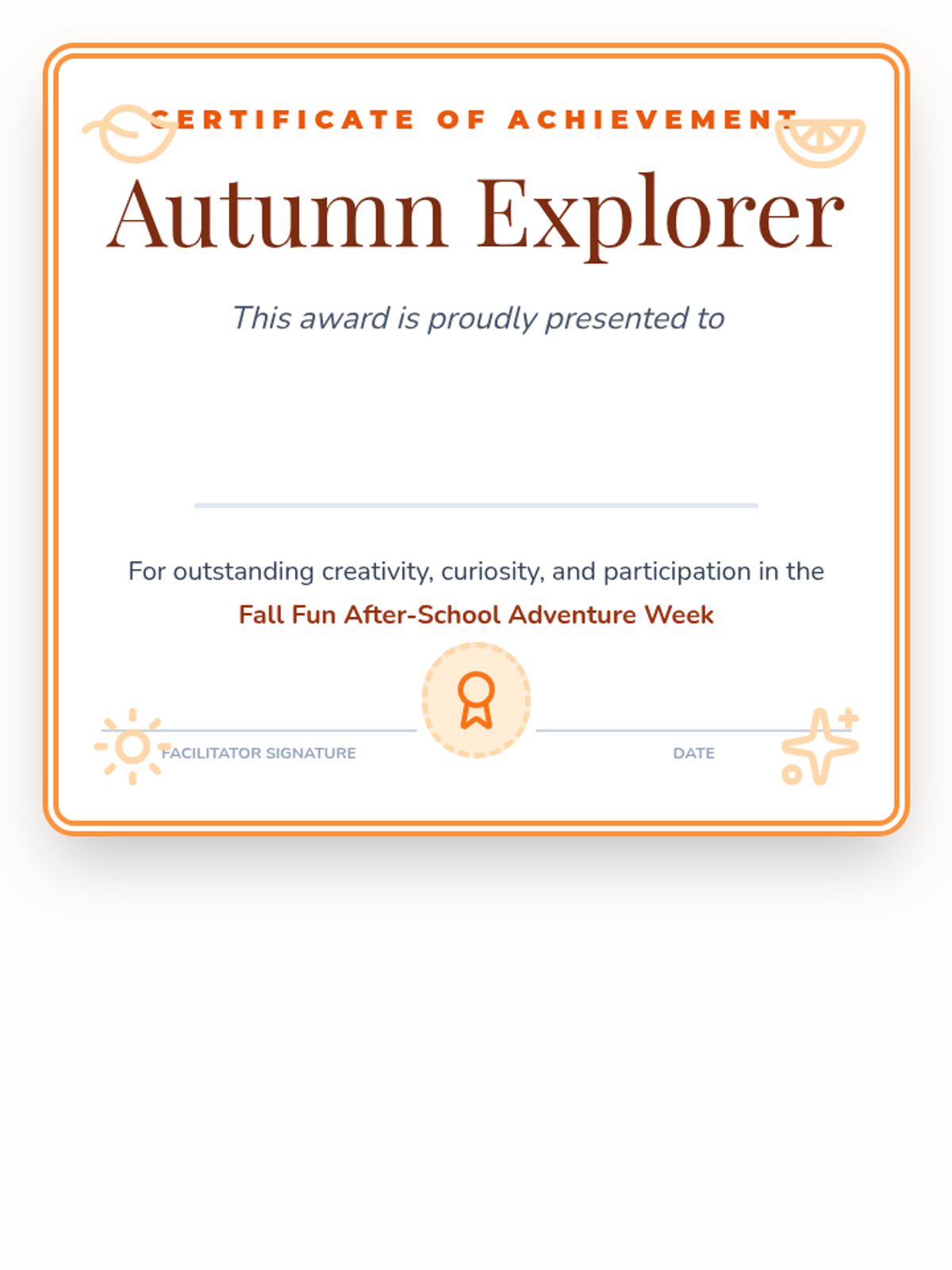 A week-long after-school program for K-3 students focusing on seasonal changes, hands-on crafts, and creative exploration of autumn through game-based and project-based learning.