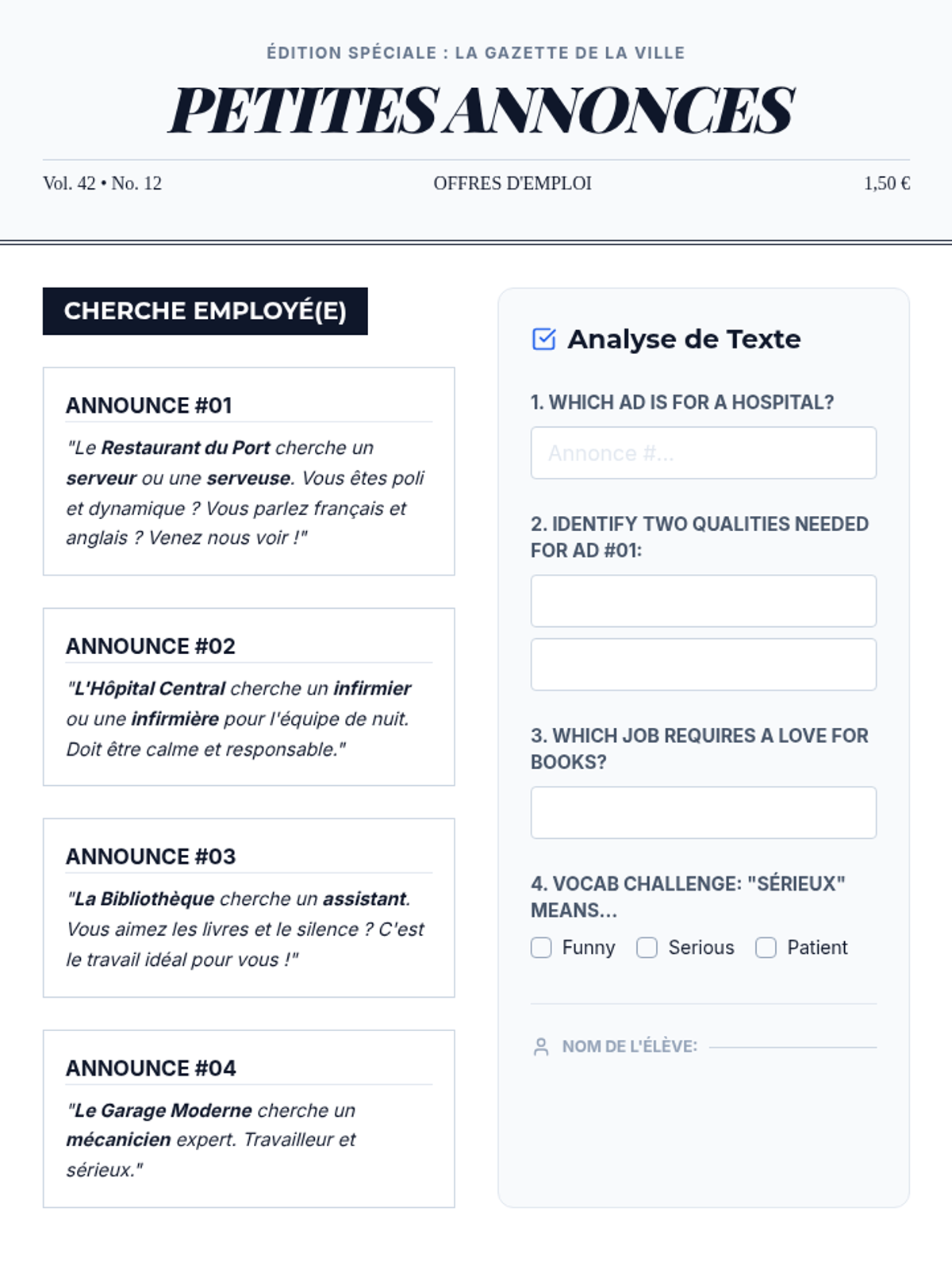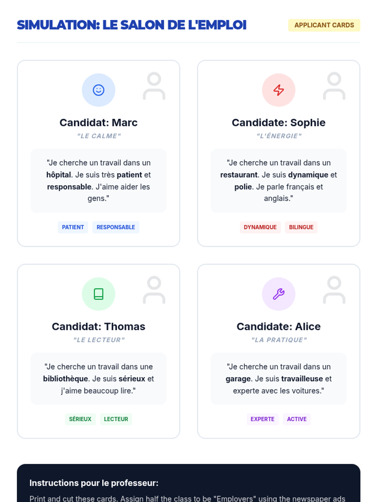 An immersive sequence where 8th-grade students master intermediate French professional vocabulary, formal communication strategies, and cultural workplace etiquette through simulated career scenarios.