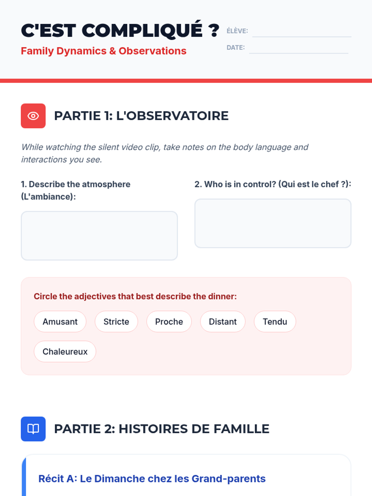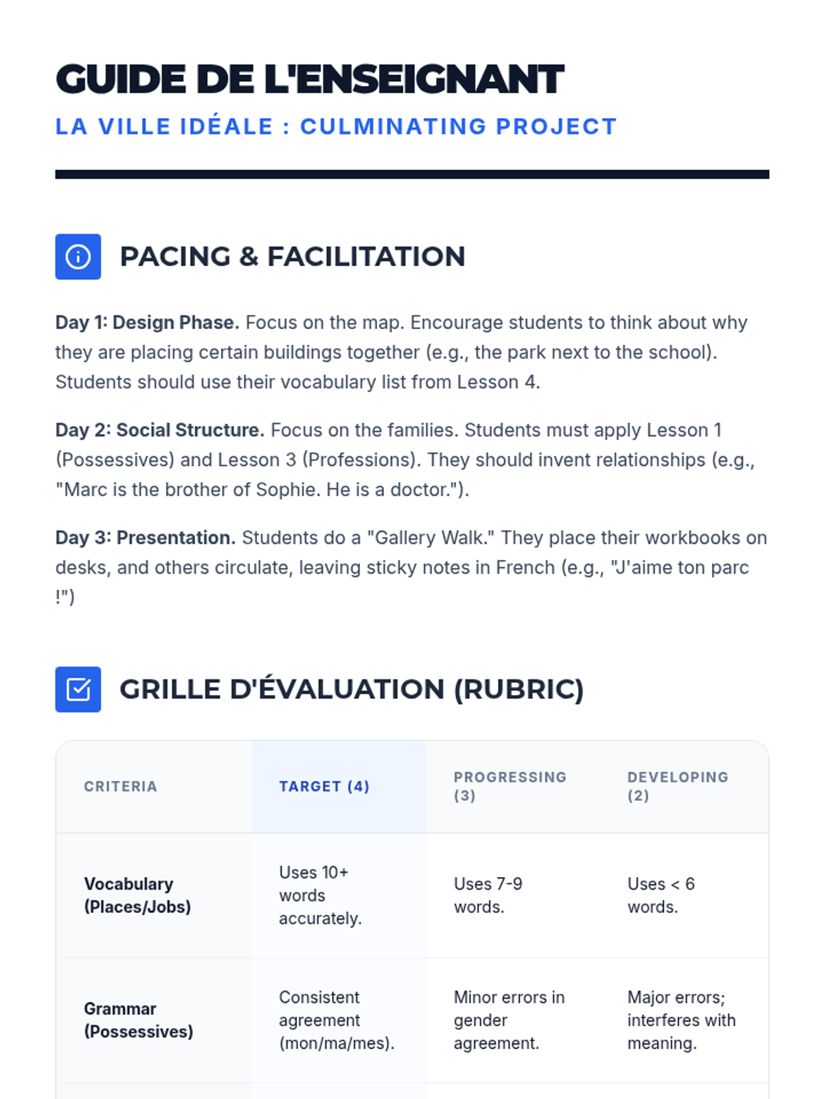 A comprehensive unit exploring French family structures, possessive adjectives, and community roles. Students progress from identifying family members to designing an ideal community, using authentic-feeling French texts and interactive simulations.