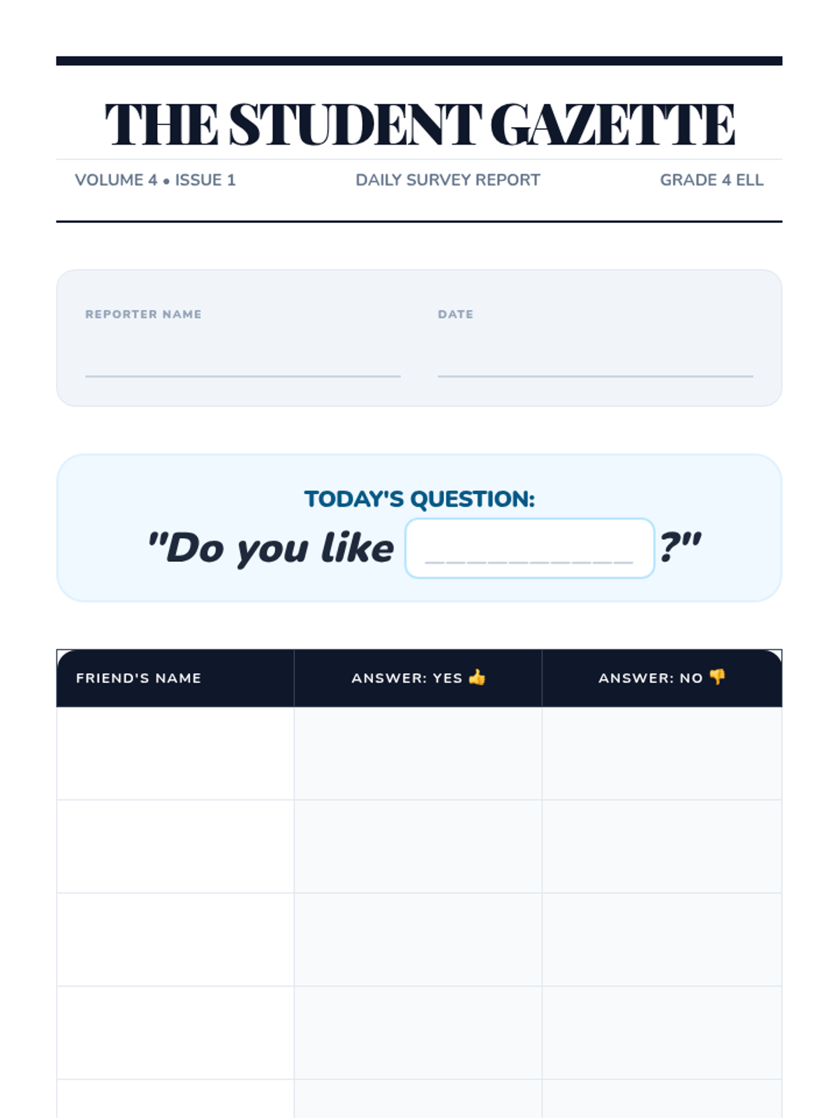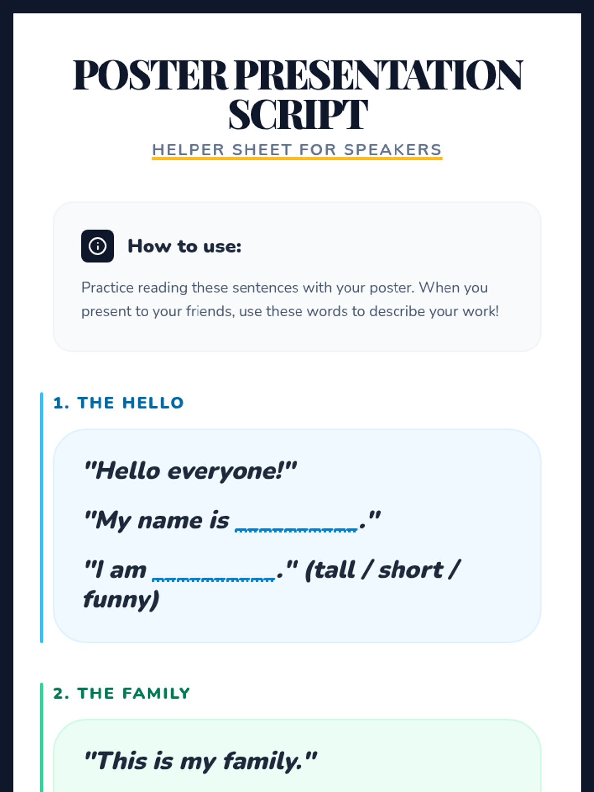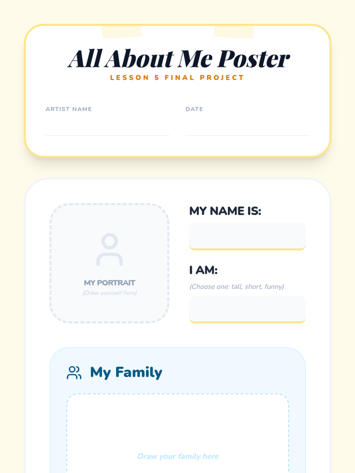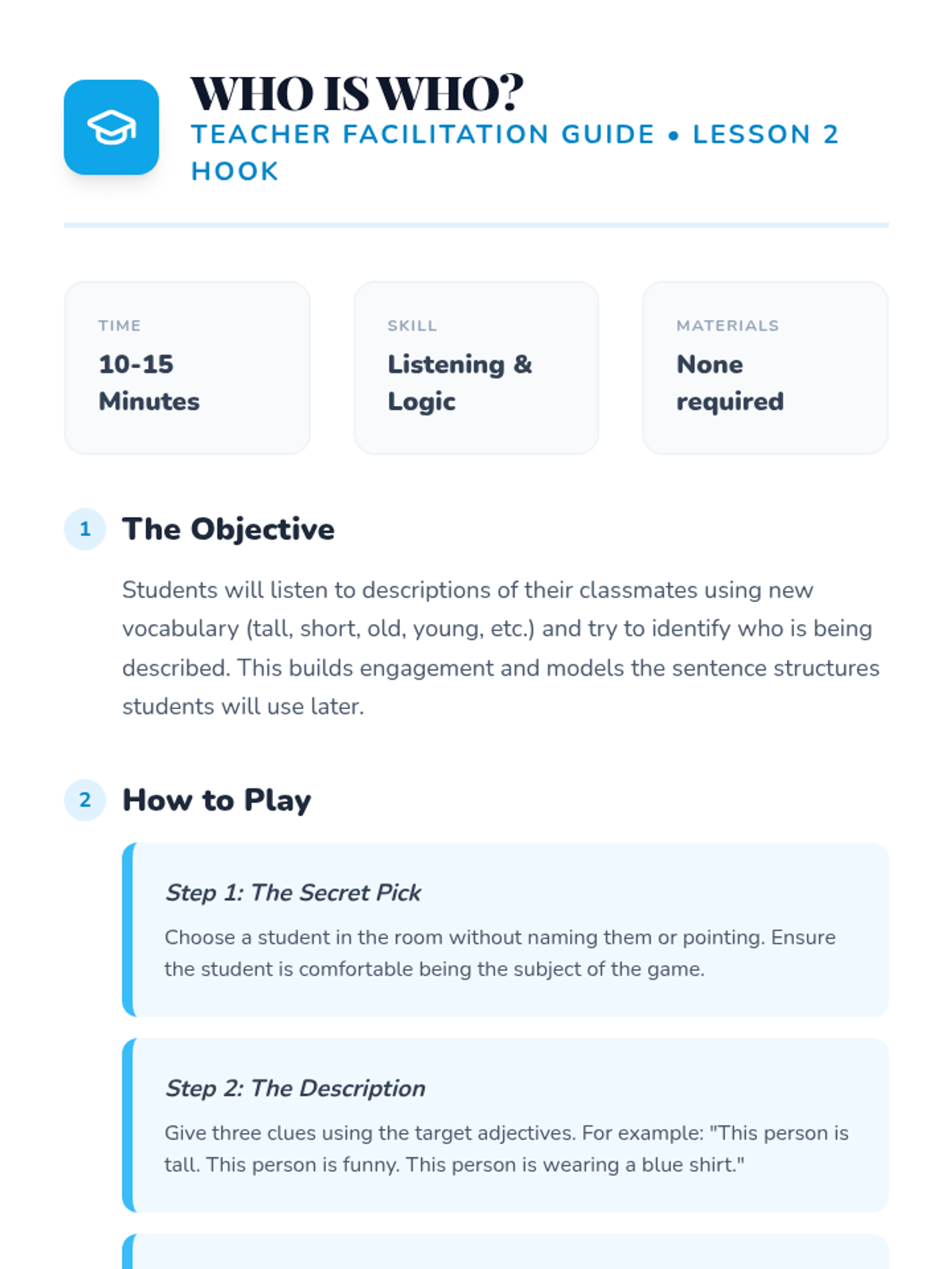 This beginner ELL sequence helps 4th-grade students build vocabulary for family members, physical descriptions, and personal preferences. Through interactive games, surveys, and a final poster project, students learn to share their identities and connect with their peers in English.