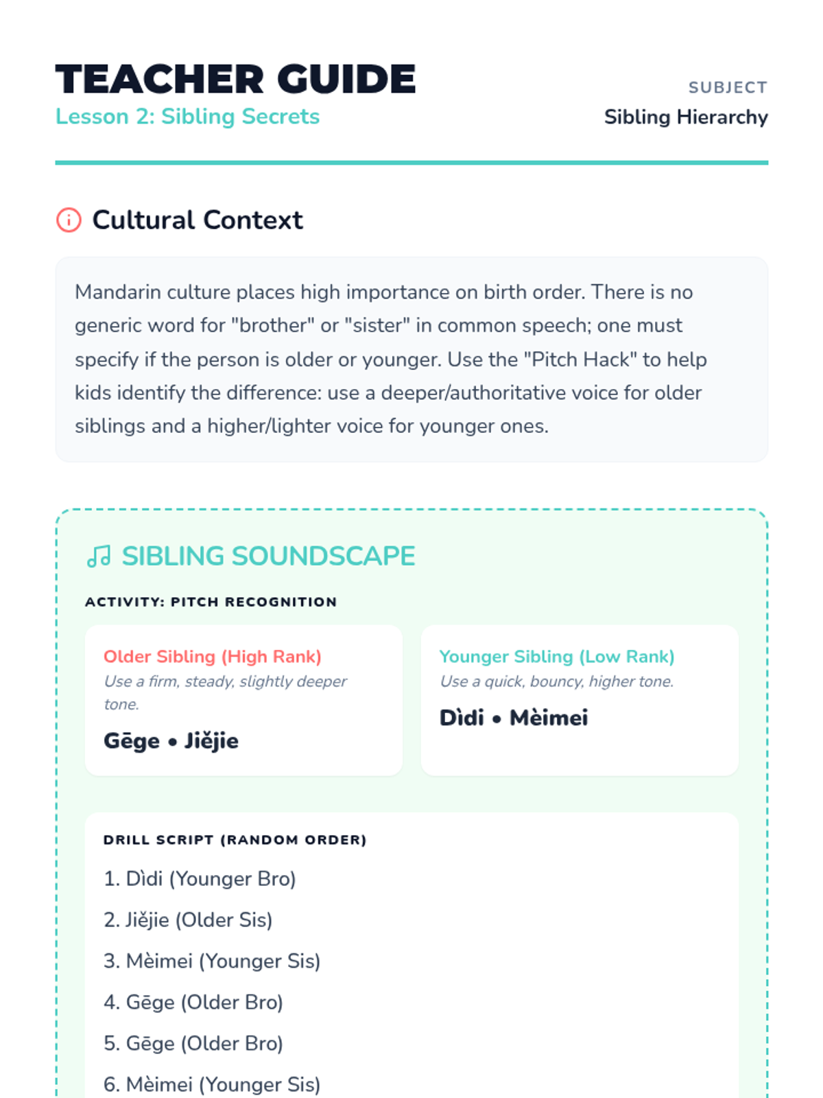 A foundational sequence for Pre-K learners to explore the four tones of Mandarin Chinese through auditory play, physical movement, and vocal exploration. Students learn to associate pitch changes with meaning using relatable sounds like questioning 'Huh?' or firm 'No!' gestures.