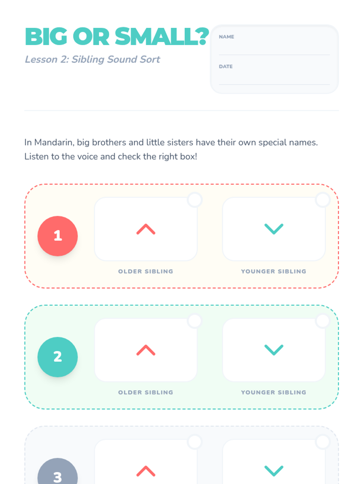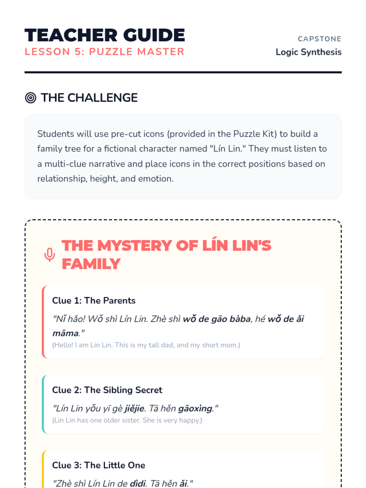 A foundational Mandarin Chinese listening sequence for 2nd graders focusing on family vocabulary, sibling hierarchy, possessive pronouns, and descriptive adjectives through auditory-visual association and logic puzzles.