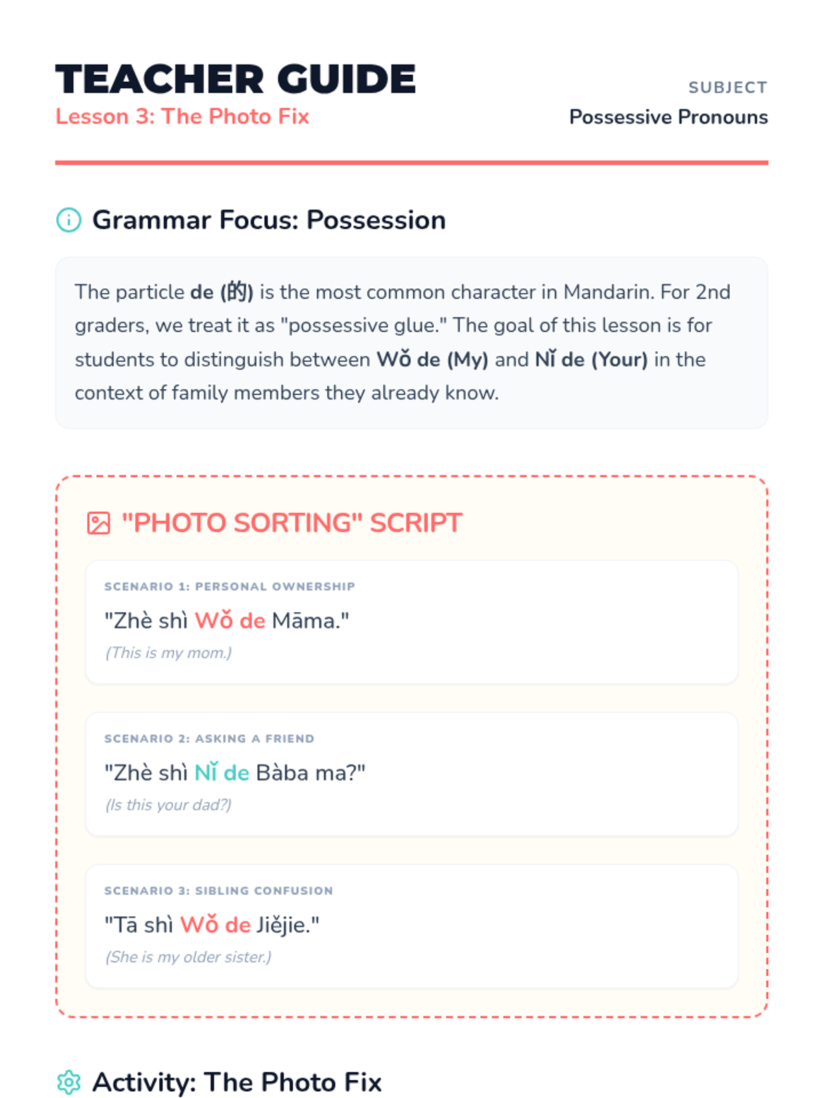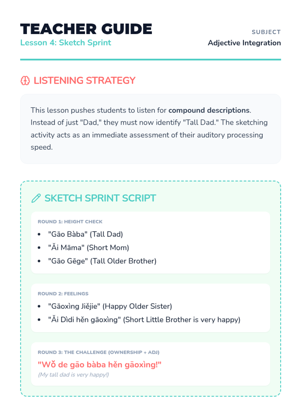 A foundational Mandarin Chinese sequence for Pre-K students focused on identifying family members. Students learn vocabulary for parents, siblings, and grandparents through interactive games, songs, and visual inquiry.