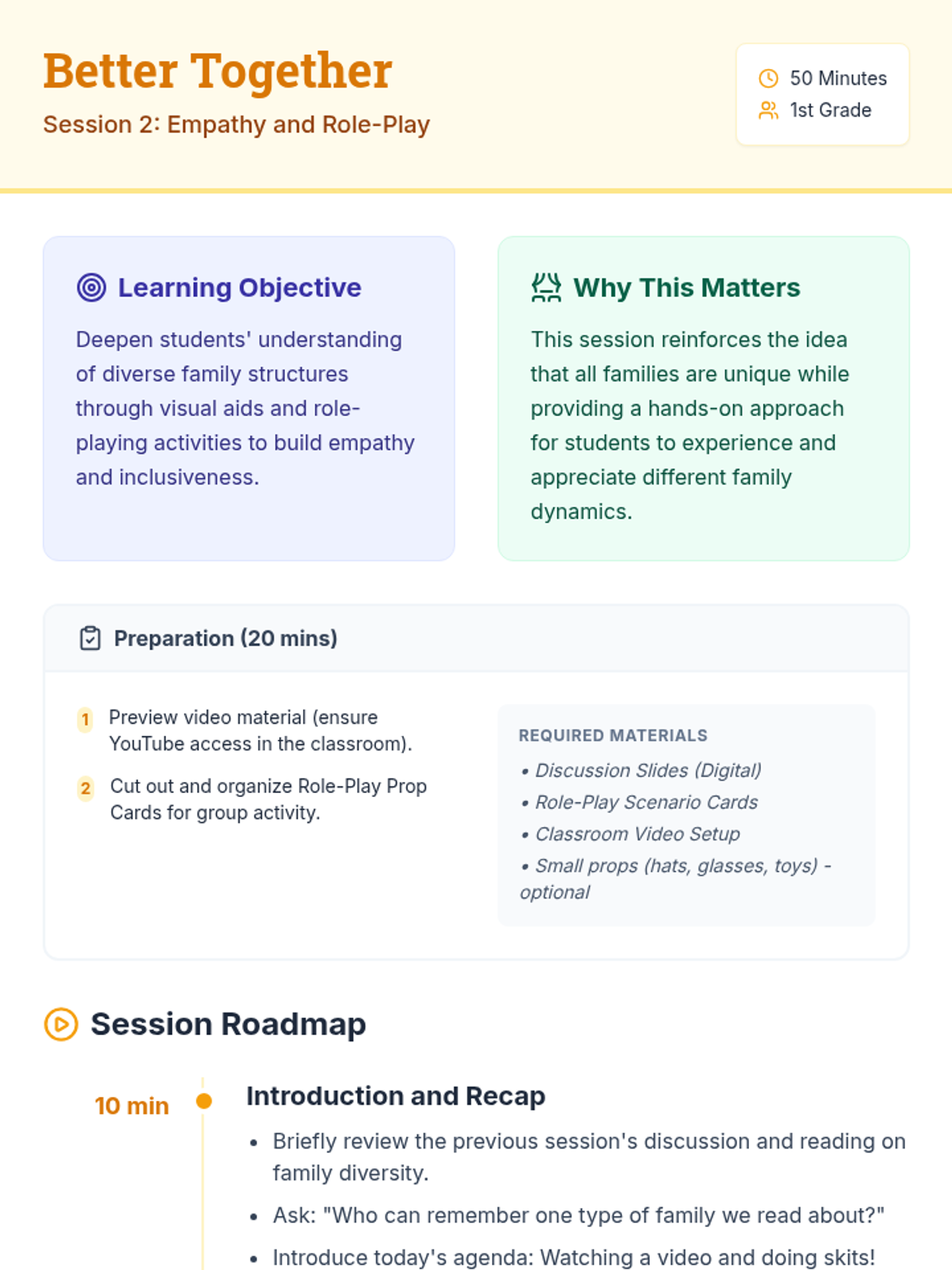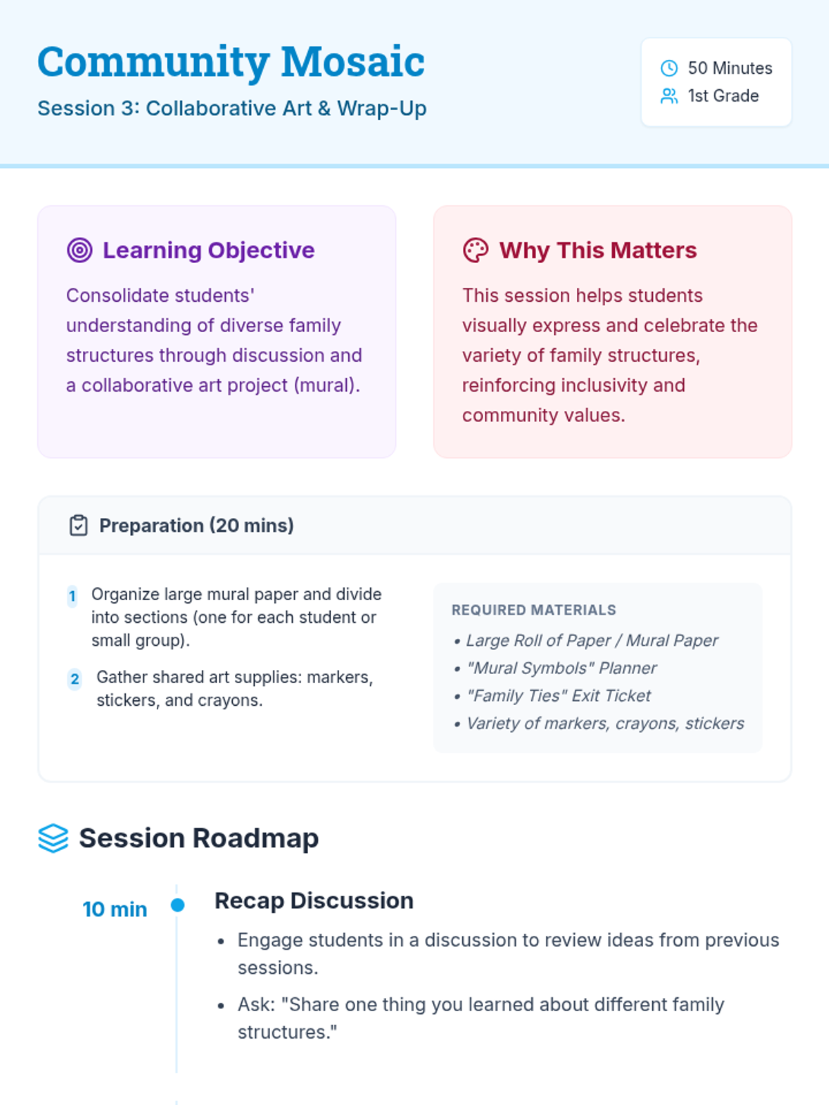 A three-session sequence for 1st graders focused on exploring and celebrating diverse family structures through stories, role-play, and collaborative art. Students learn that while every family is unique, they are all built on foundations of love and care.