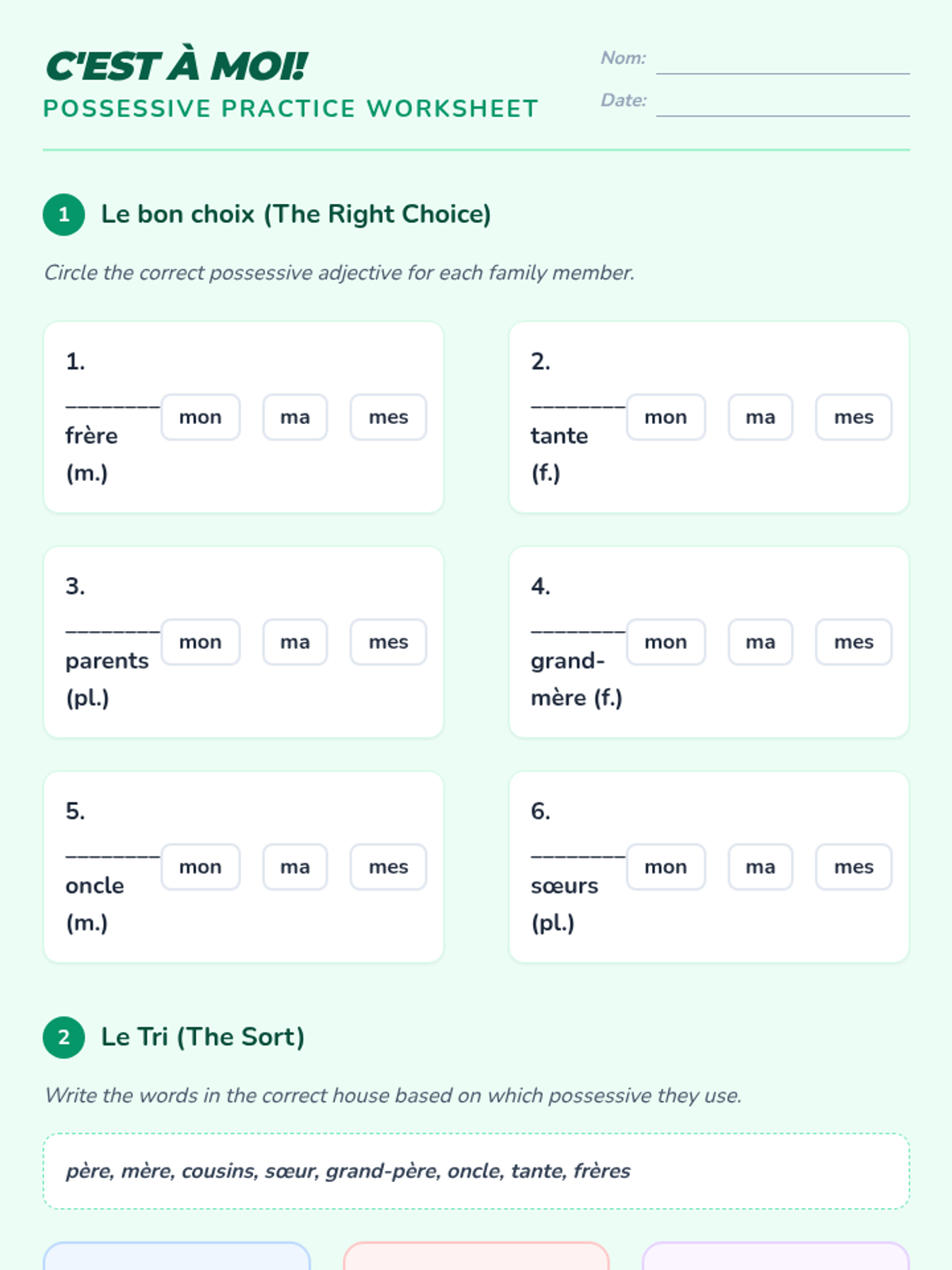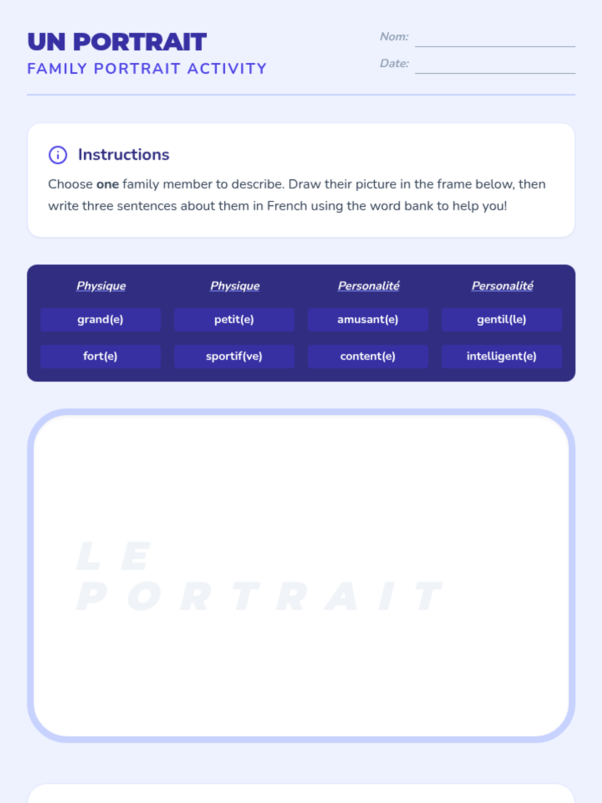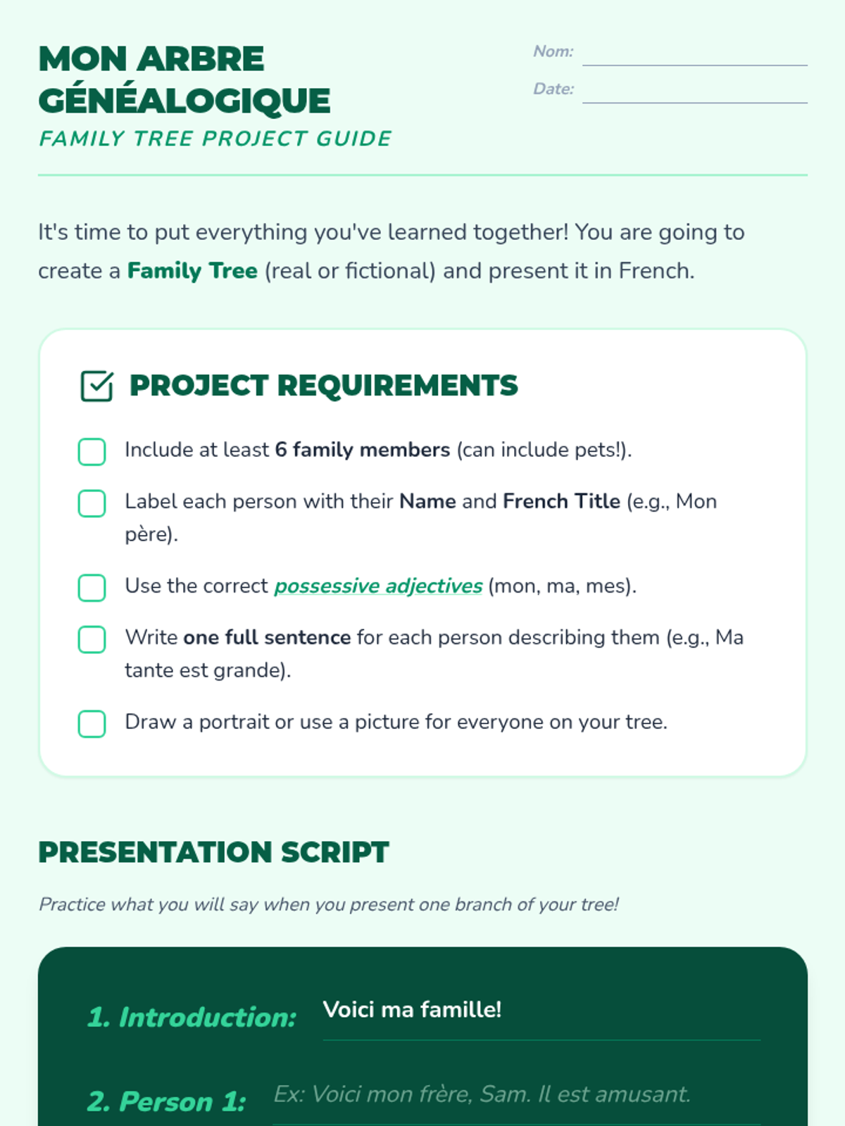 This sequence introduces 4th-grade students to French family vocabulary and possessive adjectives. Students will learn to describe their family members and pets, ending with the creation of a personalized family tree project.