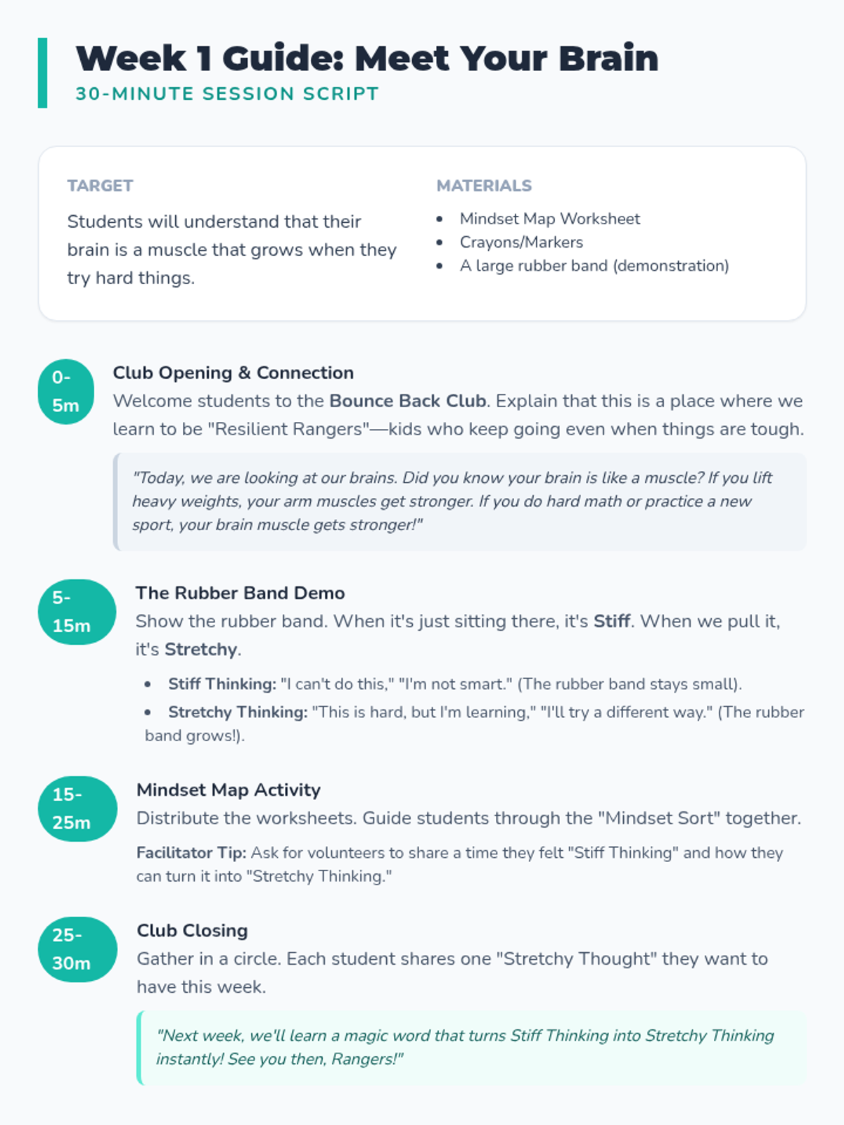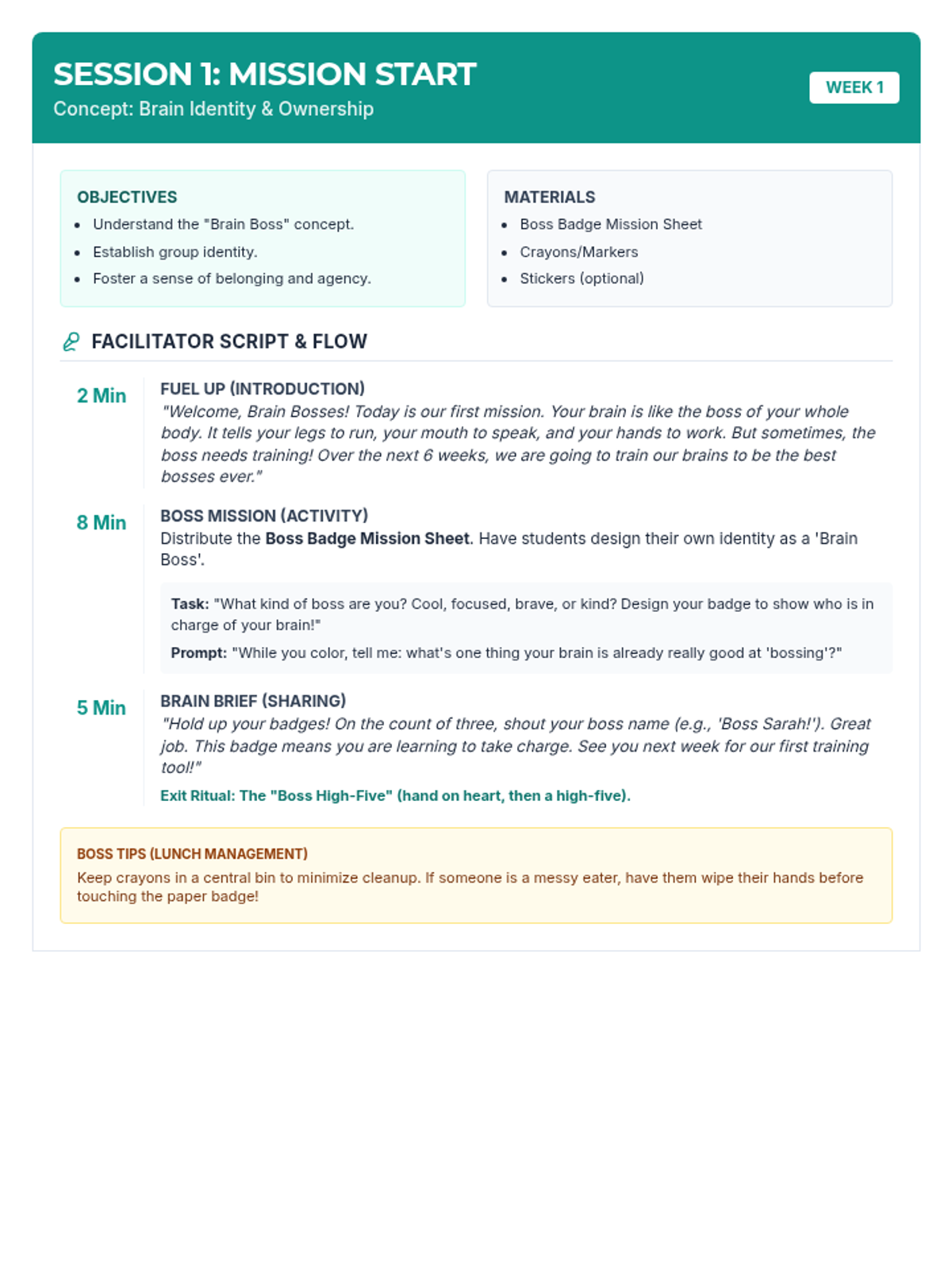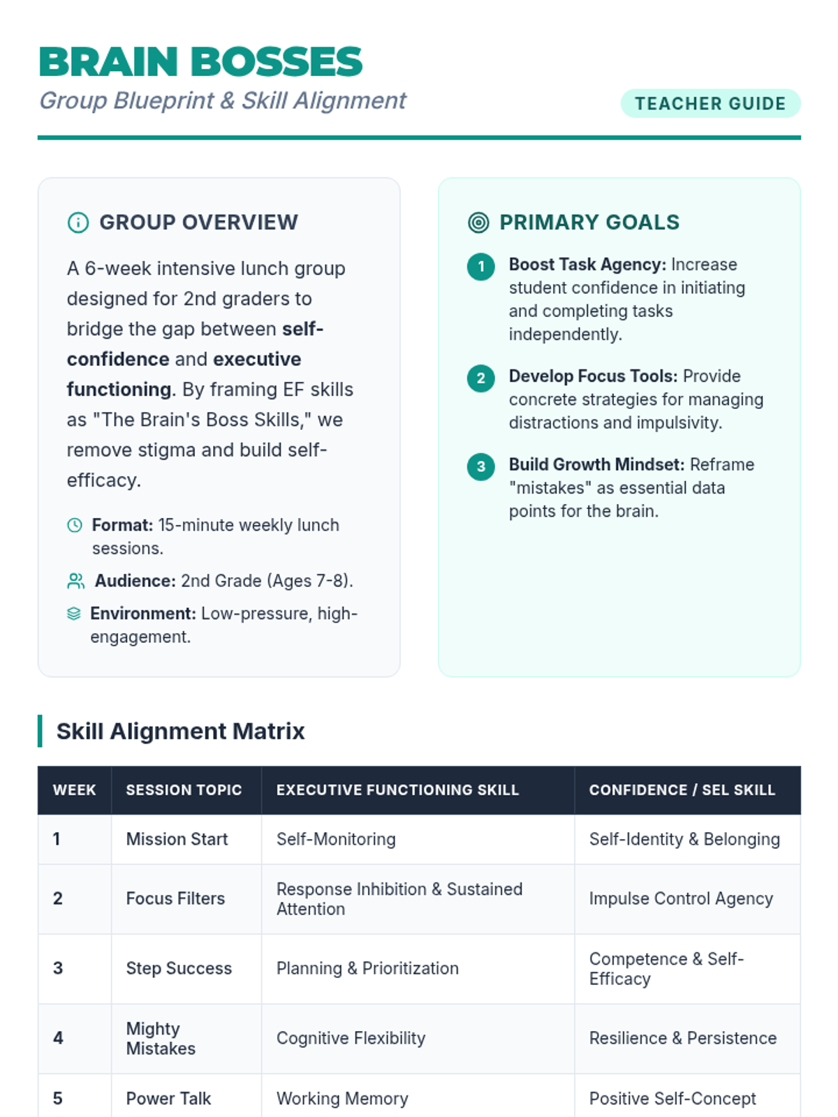 A 6-week lunch-time group for 2nd graders focused on building executive functioning skills (planning, focus, organization) and self-confidence (resilience, growth mindset) through quick 15-minute active sessions.