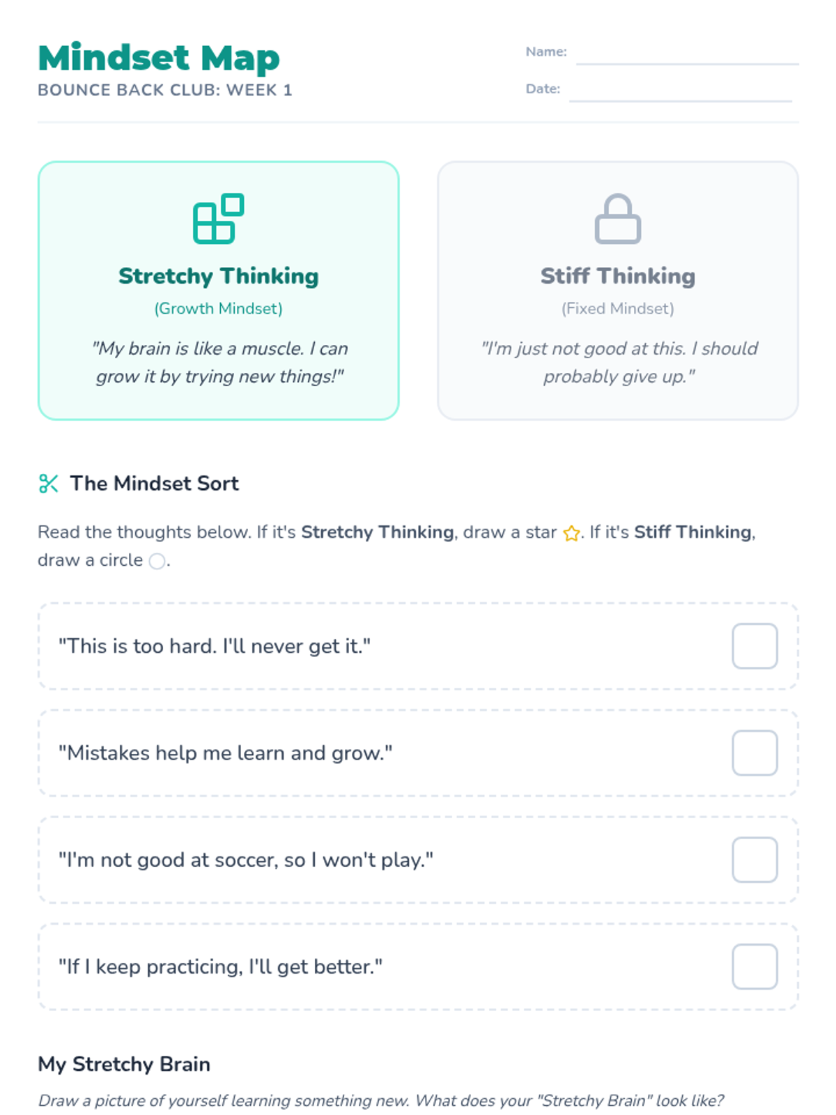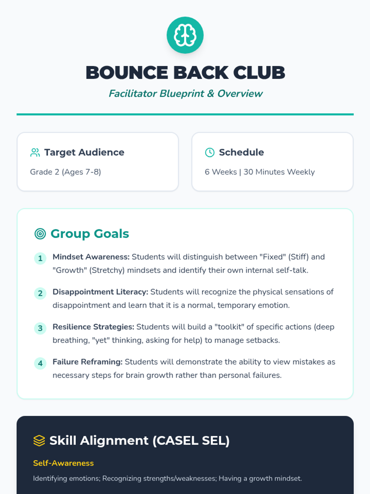 A 6-week social-emotional learning group for 2nd graders focused on developing a growth mindset and learning to navigate disappointment through hands-on activities and discussion.