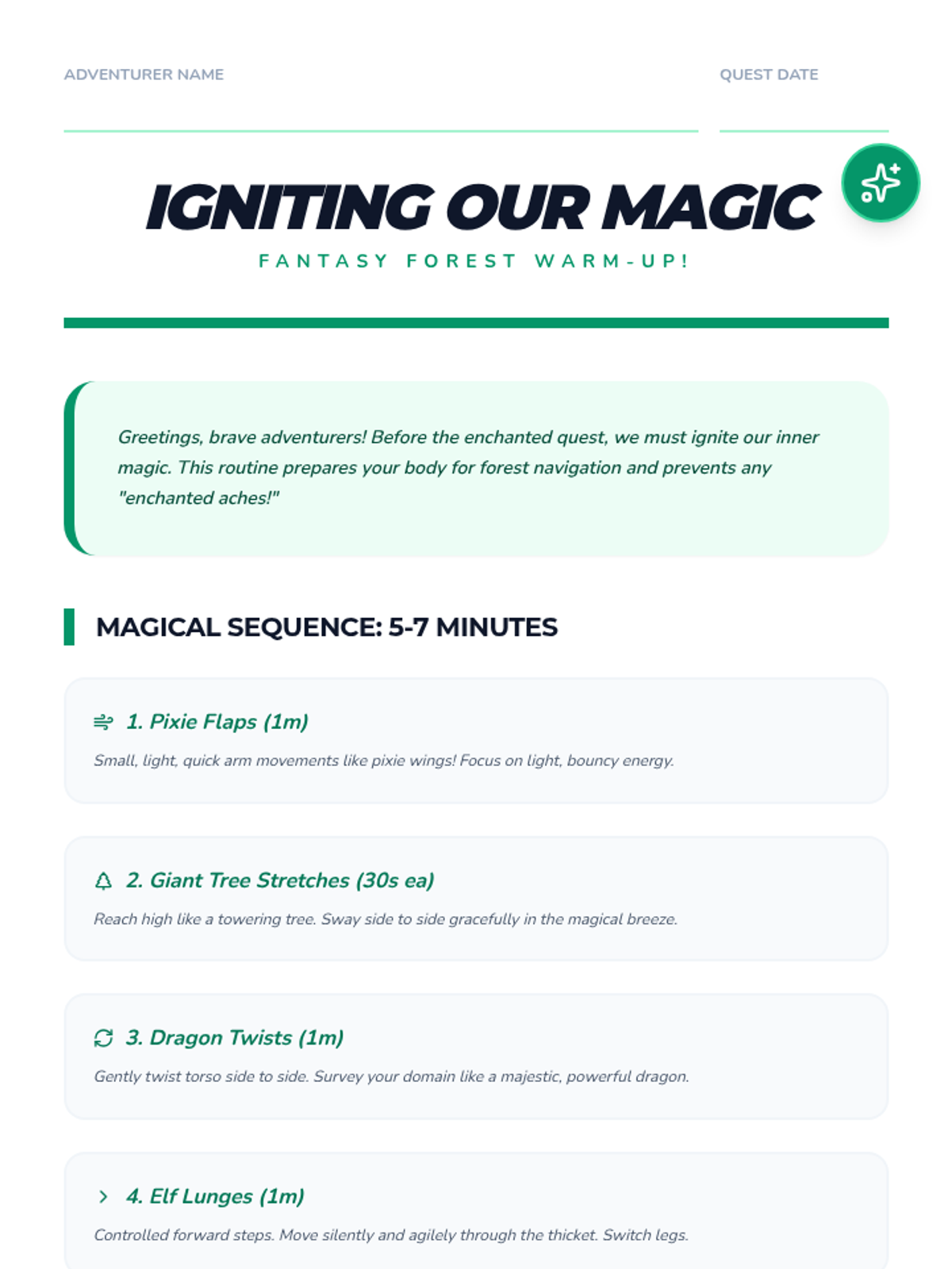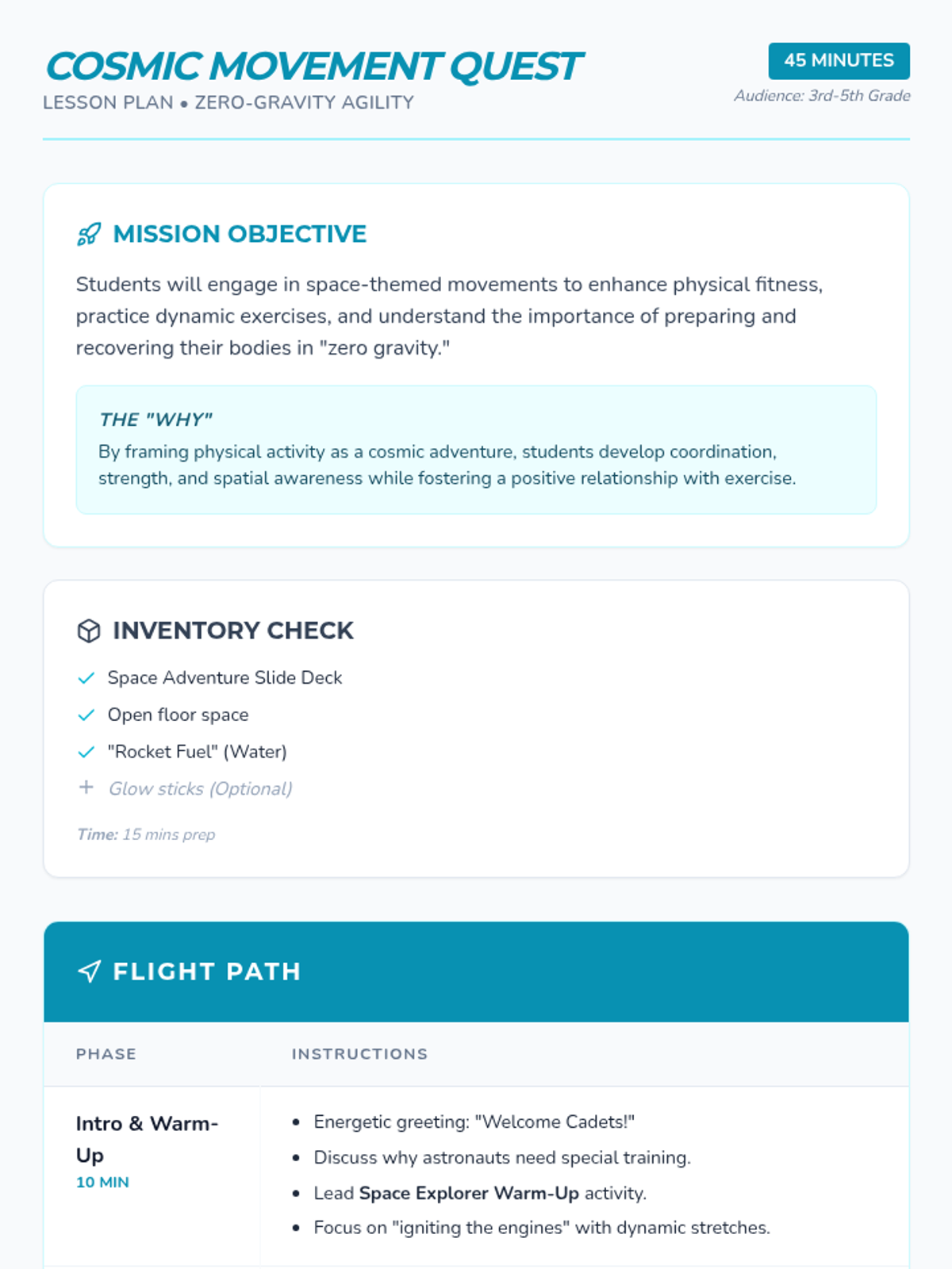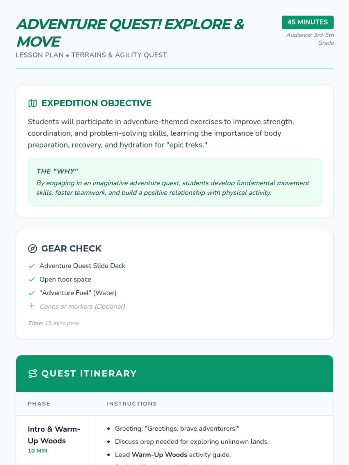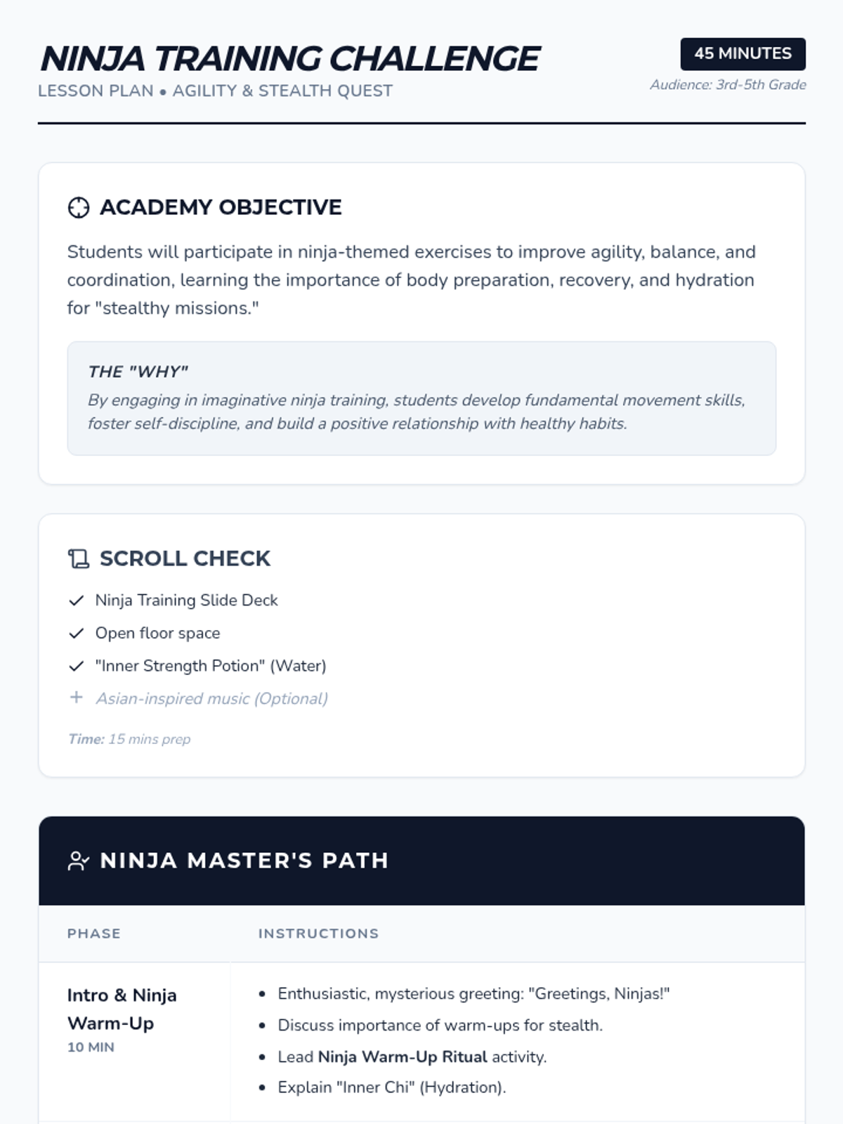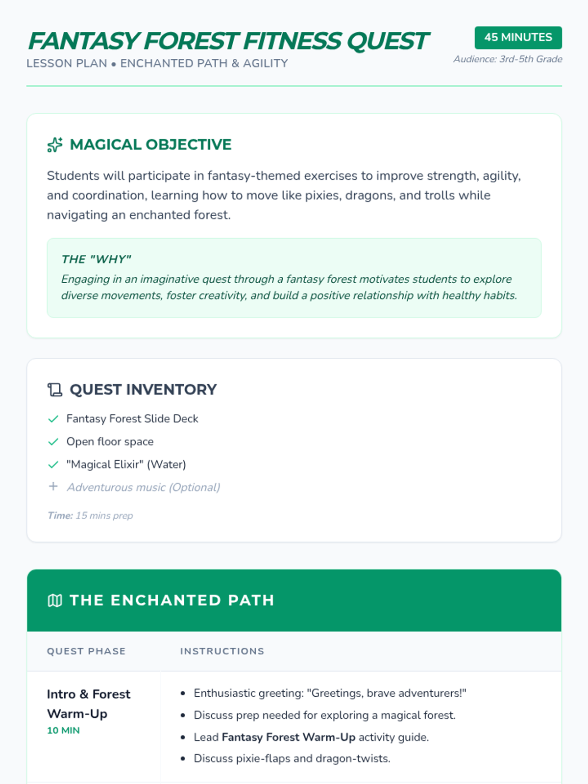 A comprehensive physical education curriculum for grades 3-5 that transforms fitness into imaginative adventures. Students develop strength, agility, and coordination through themed quests ranging from ninjas and superheroes to space exploration and magical forests.