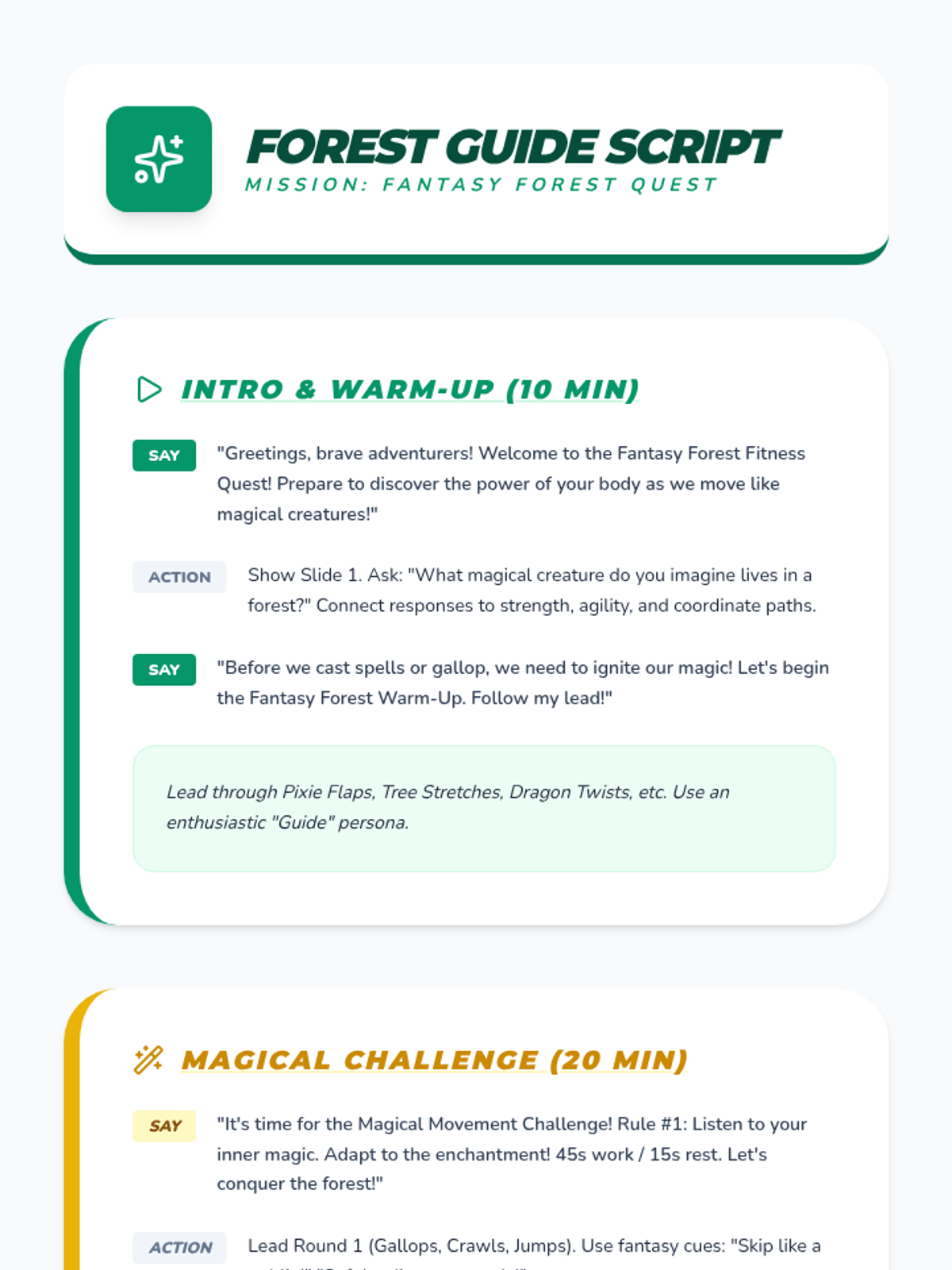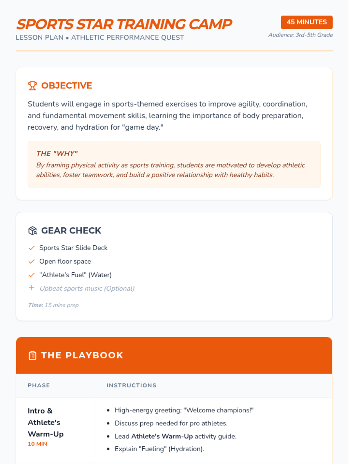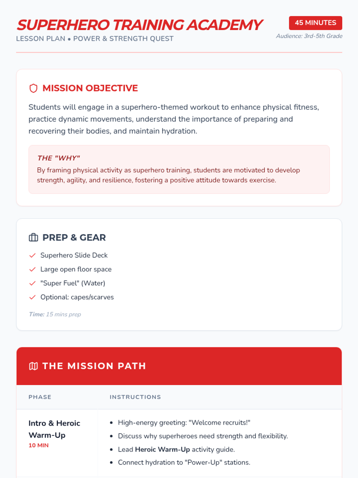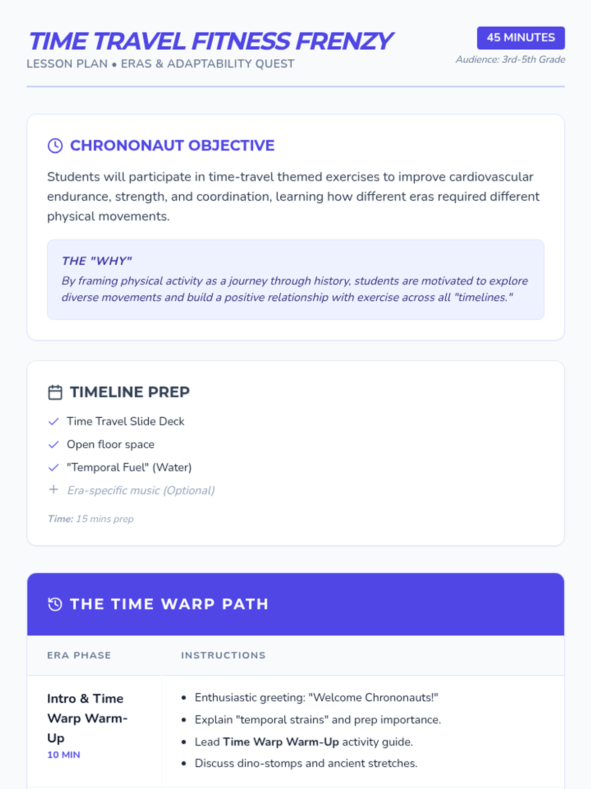 A comprehensive physical education curriculum for grades 3-5 that transforms fitness into imaginative adventures. Students develop strength, agility, and coordination through themed quests ranging from ninjas and superheroes to space exploration and magical forests.