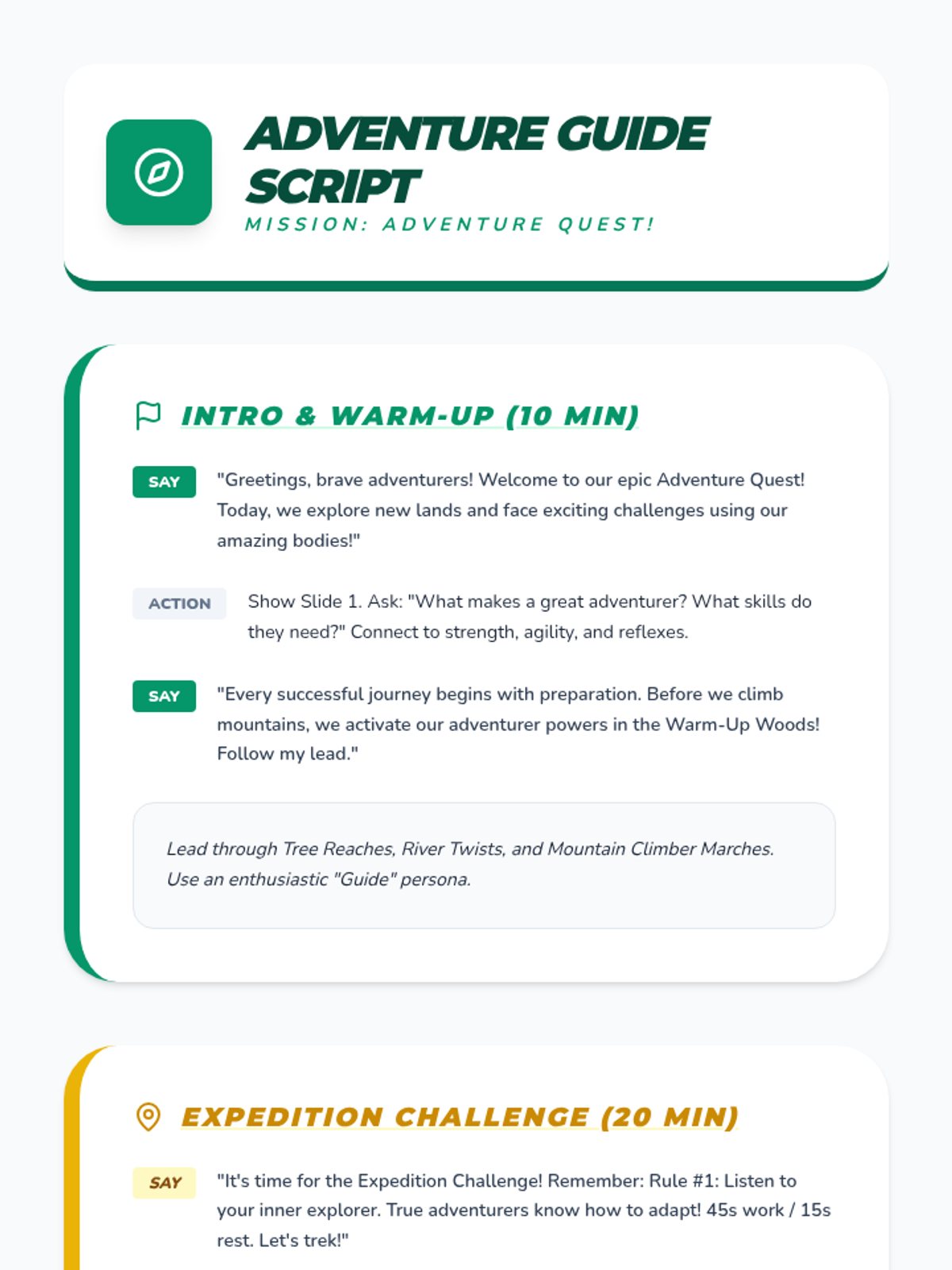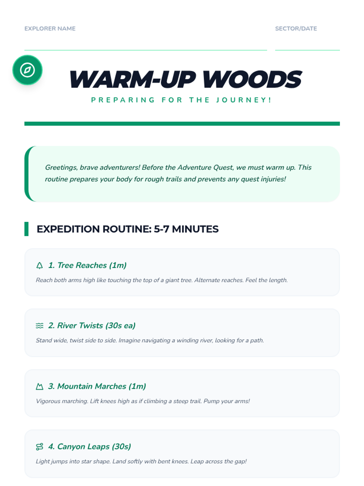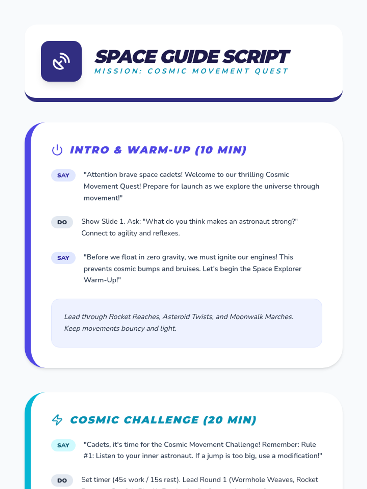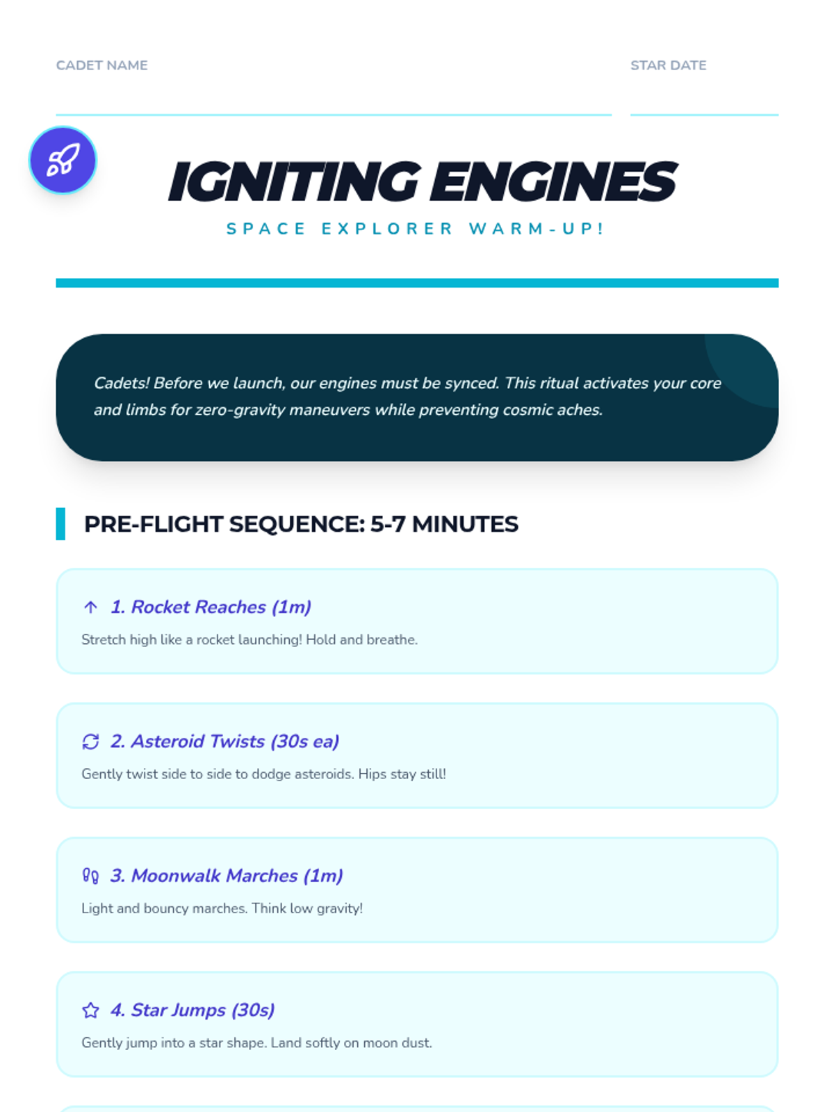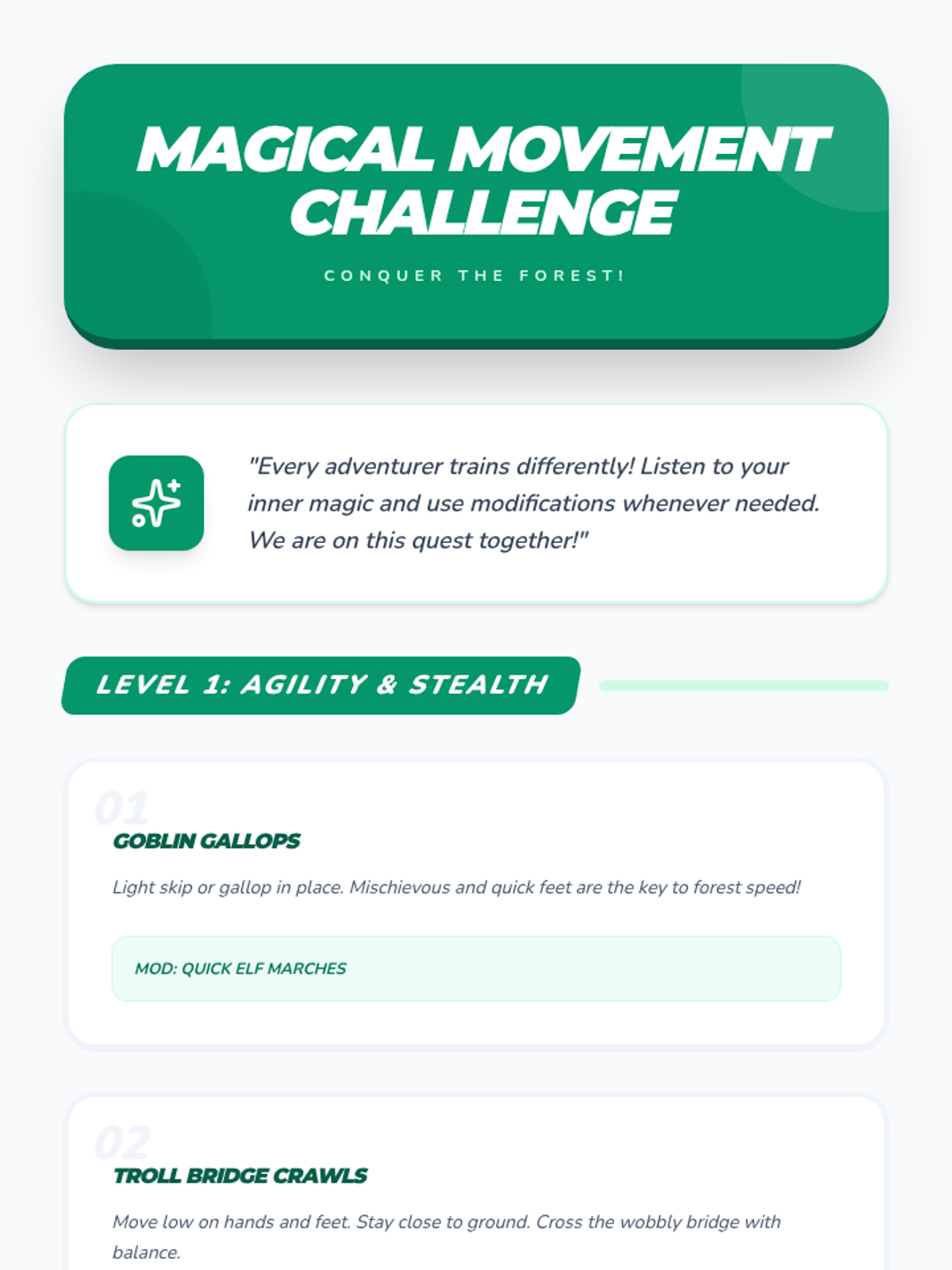 A comprehensive physical education curriculum for grades 3-5 that transforms fitness into imaginative adventures. Students develop strength, agility, and coordination through themed quests ranging from ninjas and superheroes to space exploration and magical forests.