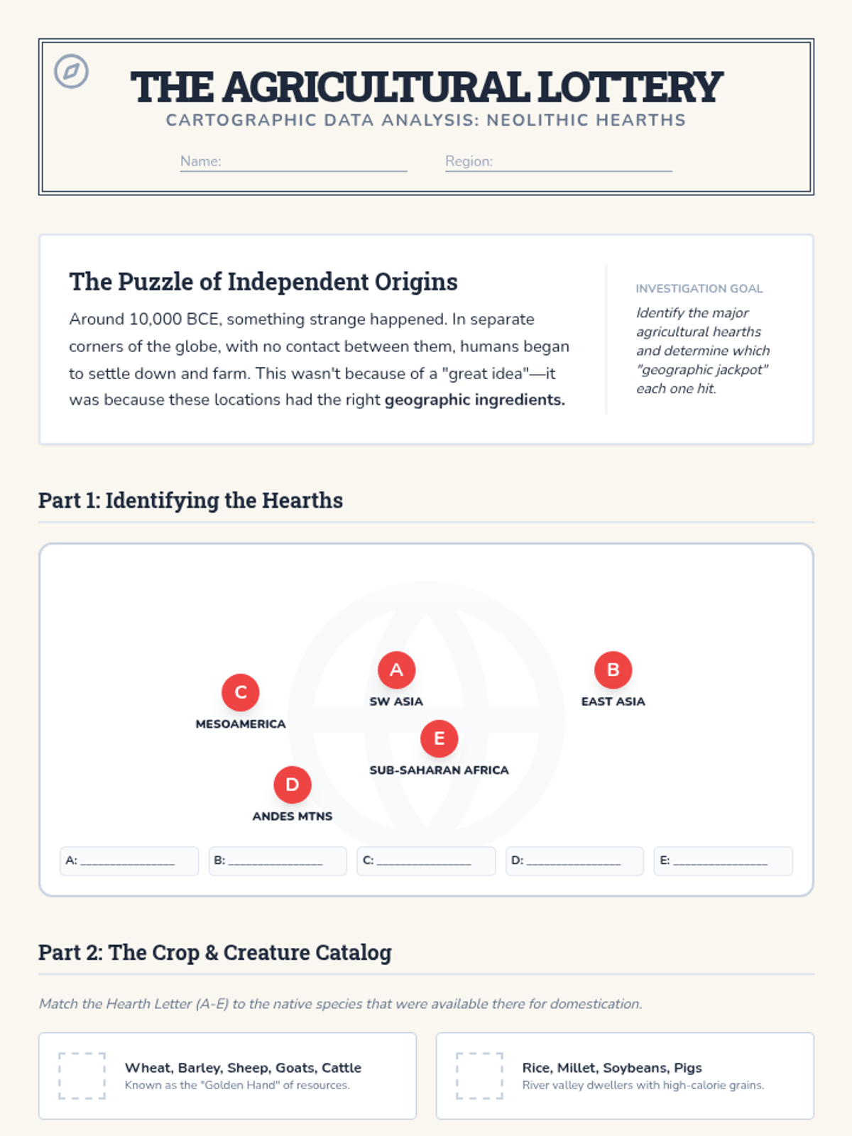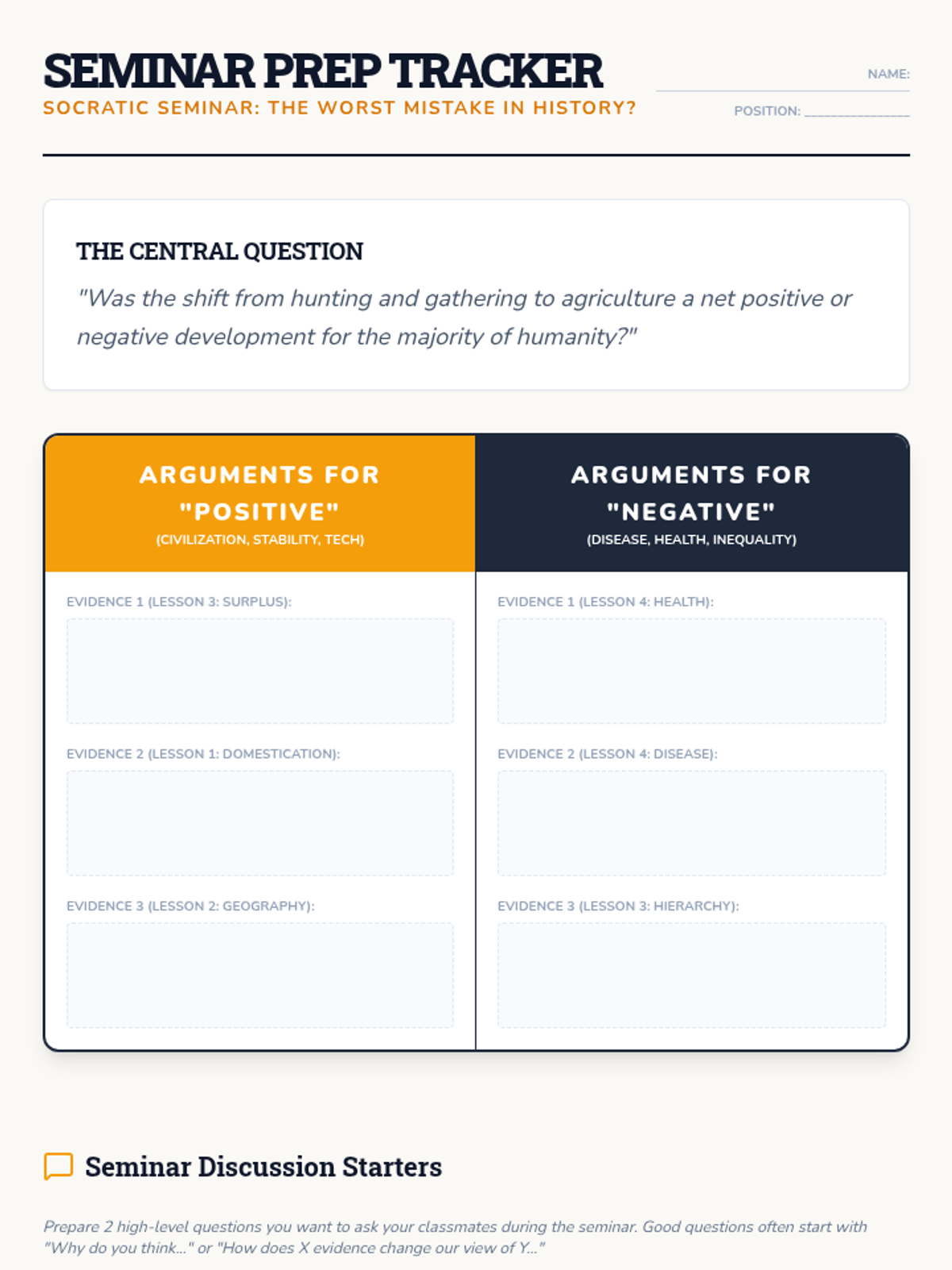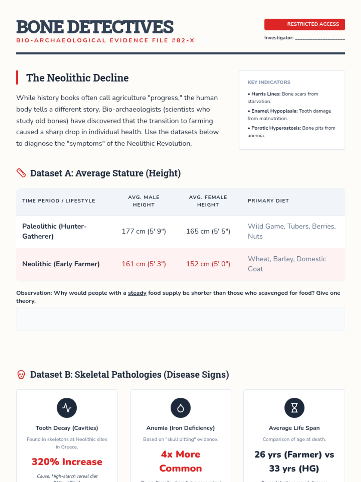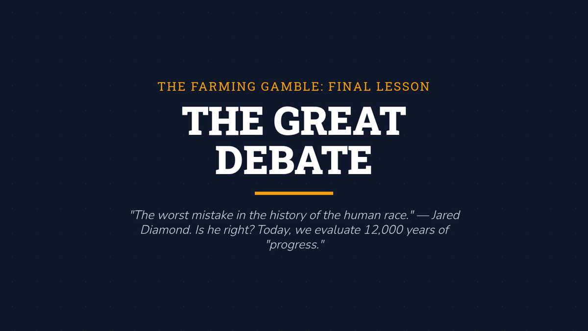 A deep dive into the Neolithic Revolution, challenging the narrative of pure progress by analyzing the biological, geographical, and social consequences of agriculture. Students evaluate whether the shift to farming was truly a benefit to humanity.