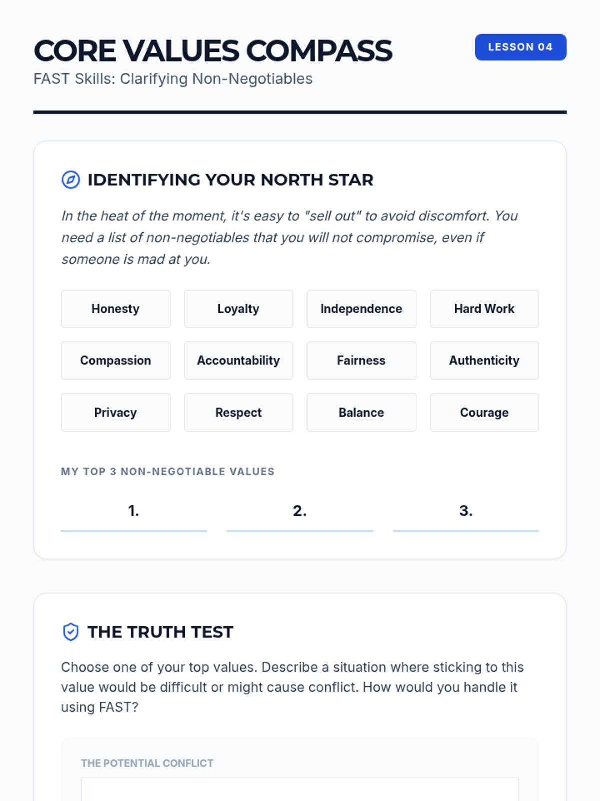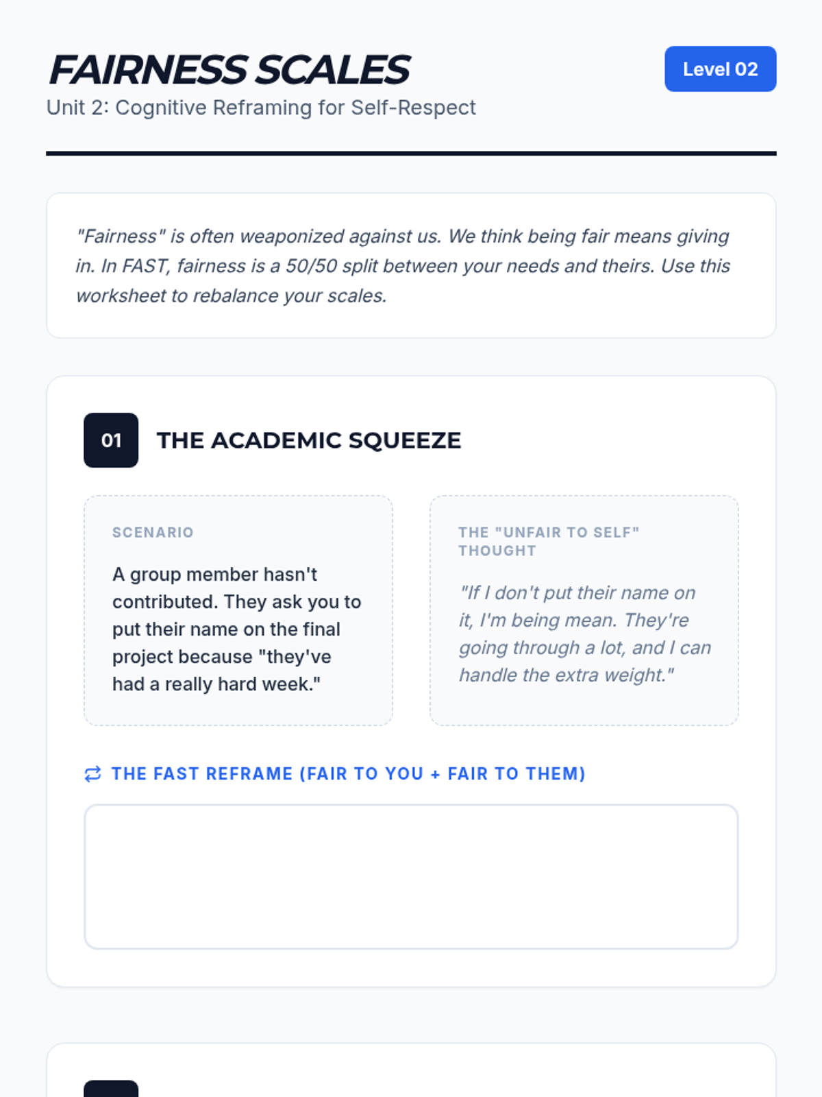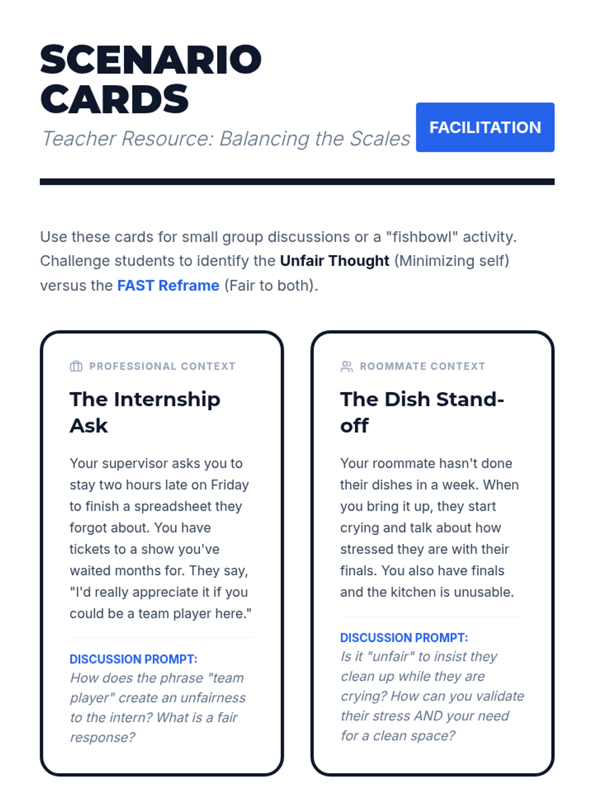 A comprehensive 5-lesson series for undergraduate students on the Dialectical Behavior Therapy (DBT) FAST skills. Students explore Fairness, Apologies, Sticking to Values, and Truthfulness to build a foundation for maintaining self-respect in social and professional contexts.