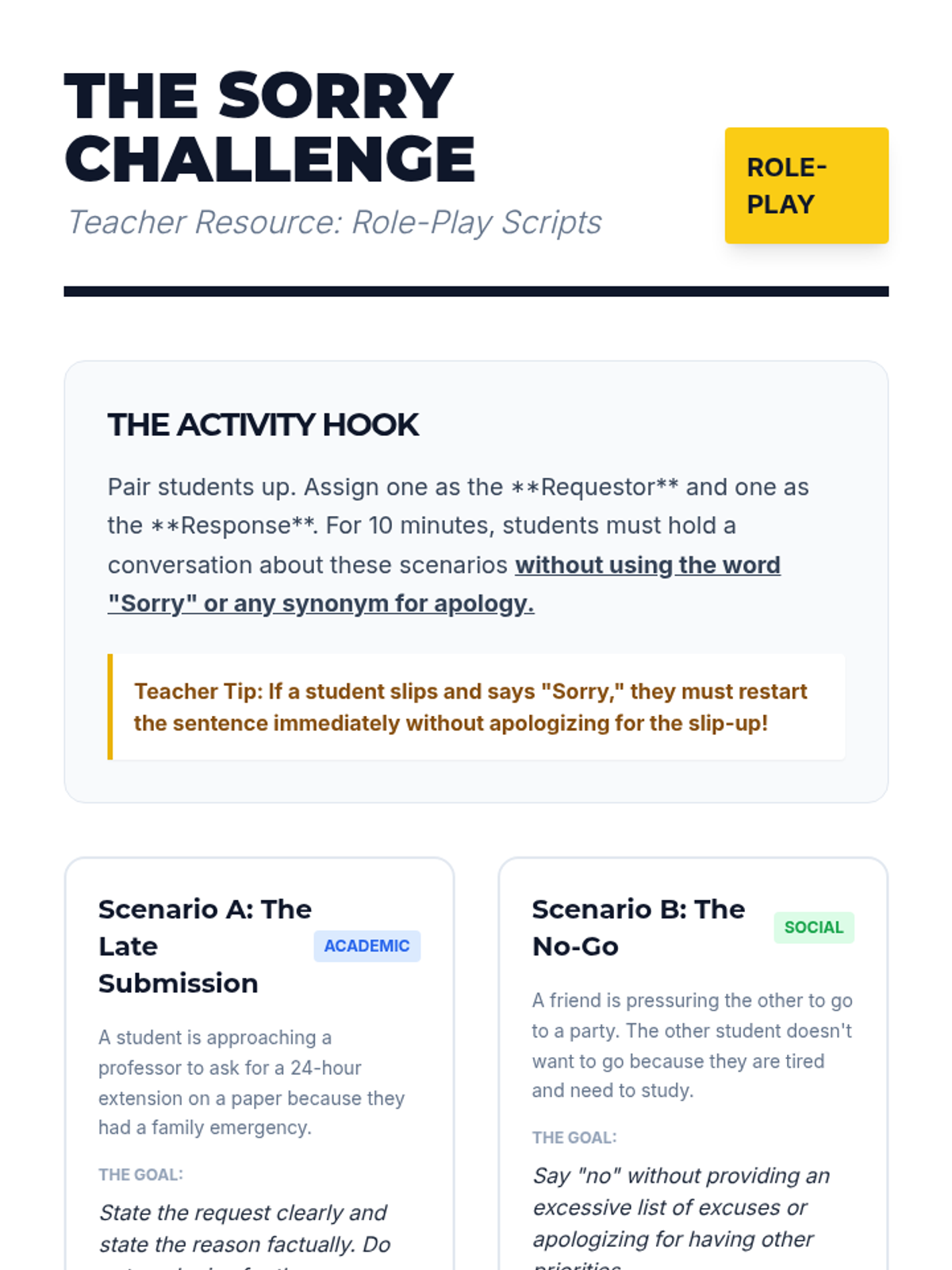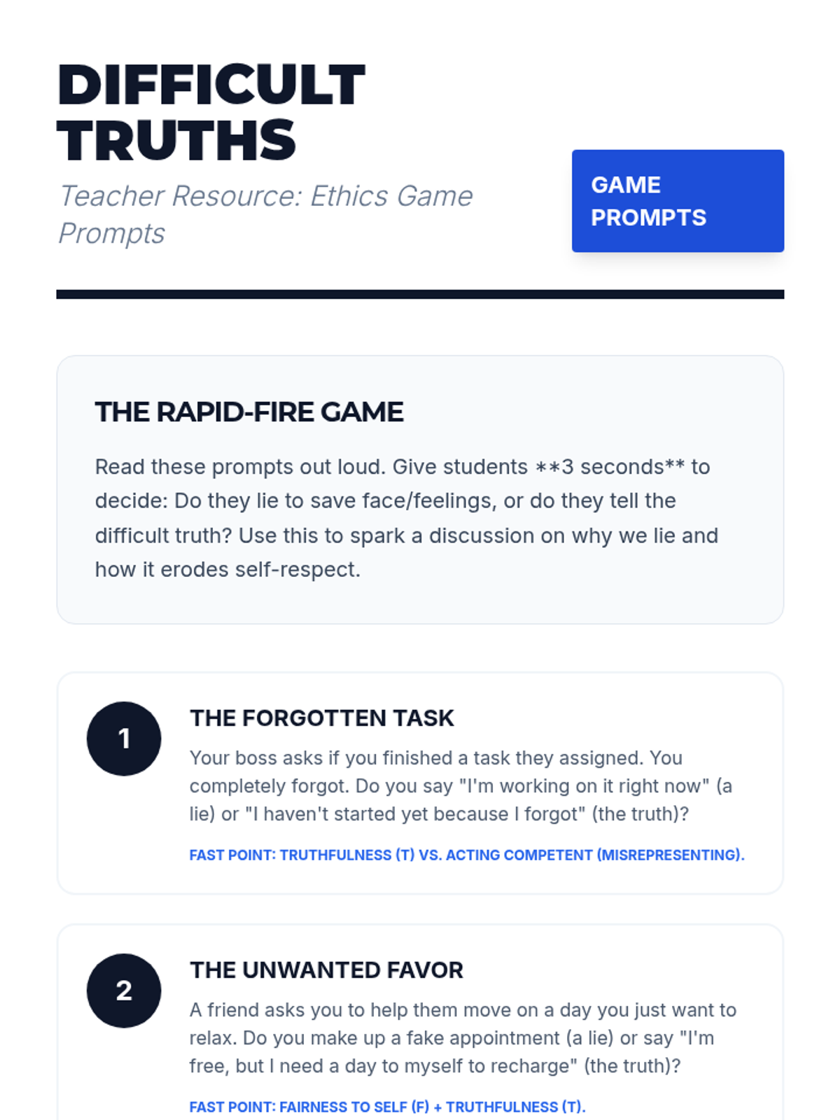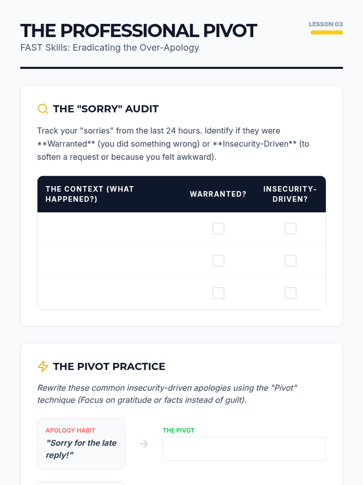 A comprehensive 5-lesson series for undergraduate students on the Dialectical Behavior Therapy (DBT) FAST skills. Students explore Fairness, Apologies, Sticking to Values, and Truthfulness to build a foundation for maintaining self-respect in social and professional contexts.
