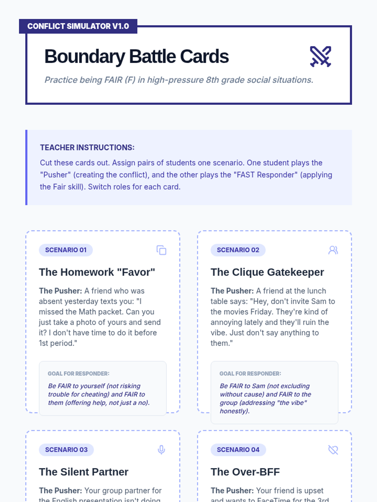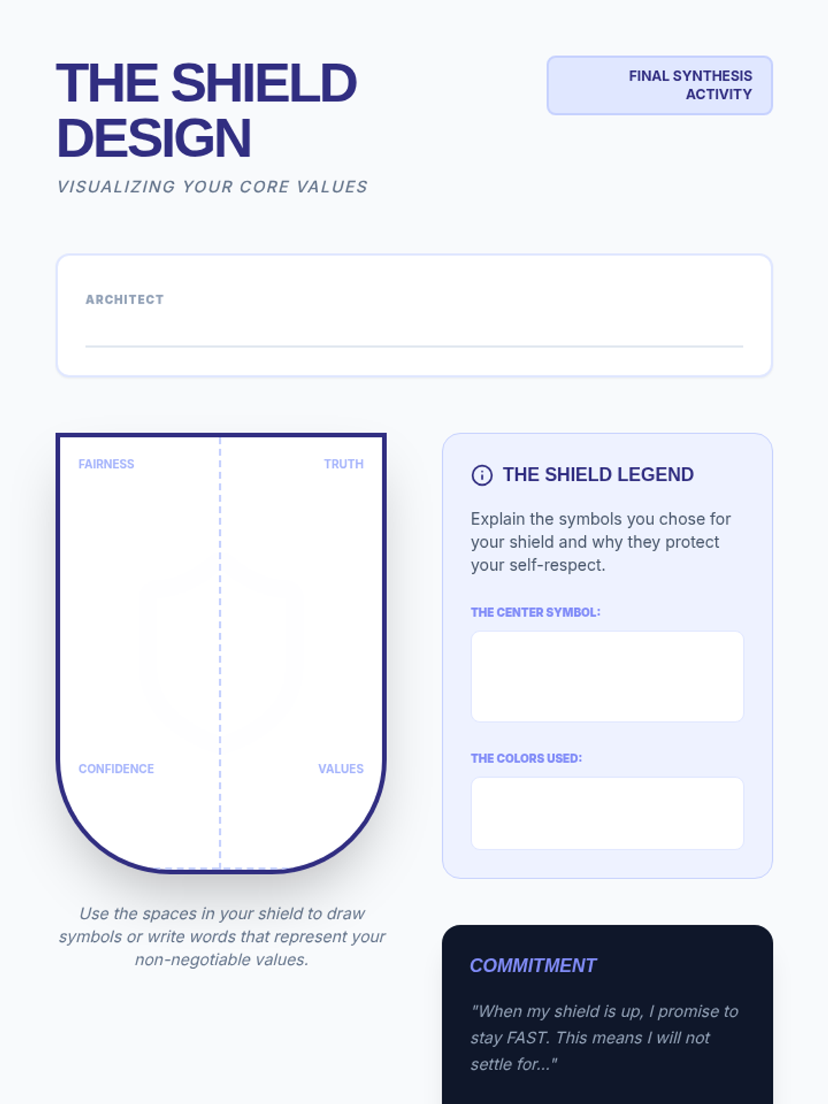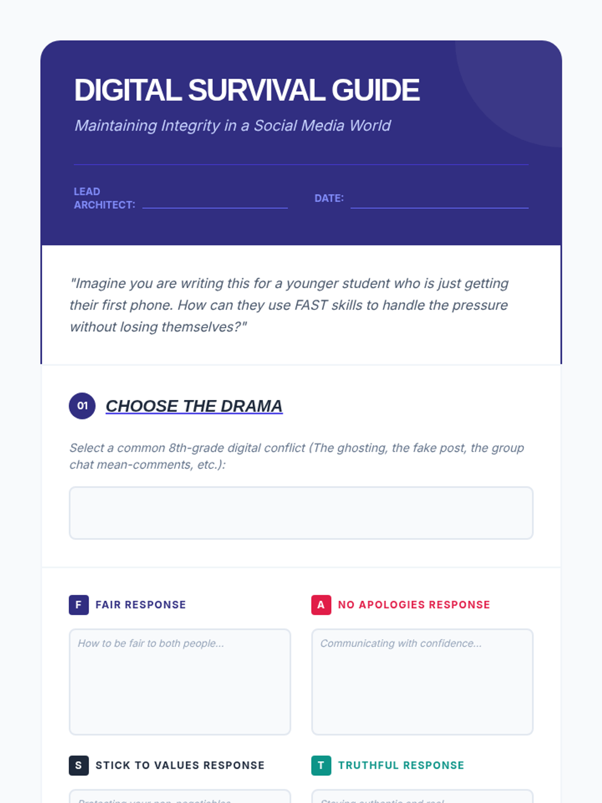 An 8th-grade counseling sequence exploring the FAST skills for self-respect (Fair, No Apologies, Stick to Values, Truthful). Students analyze social pressure, digital authenticity, and conflict resolution through case studies and creative projects.