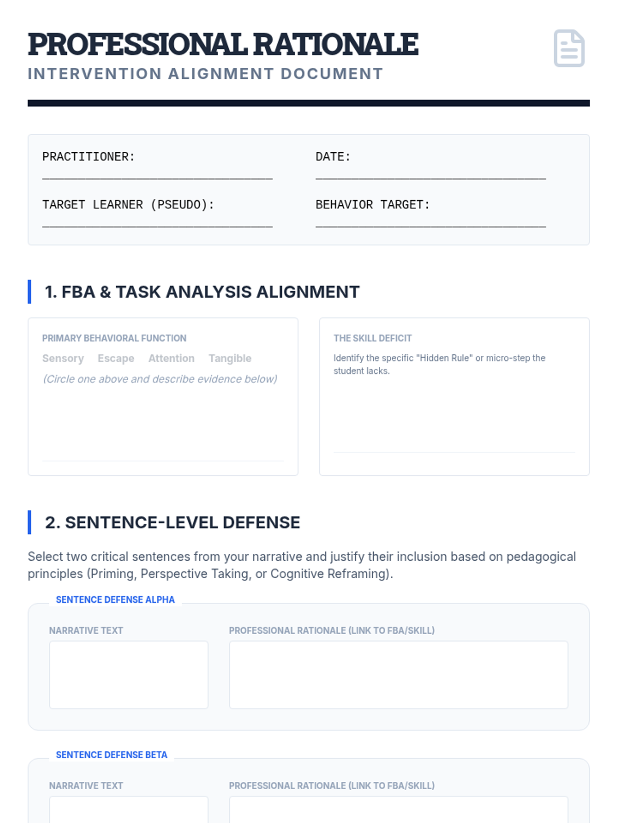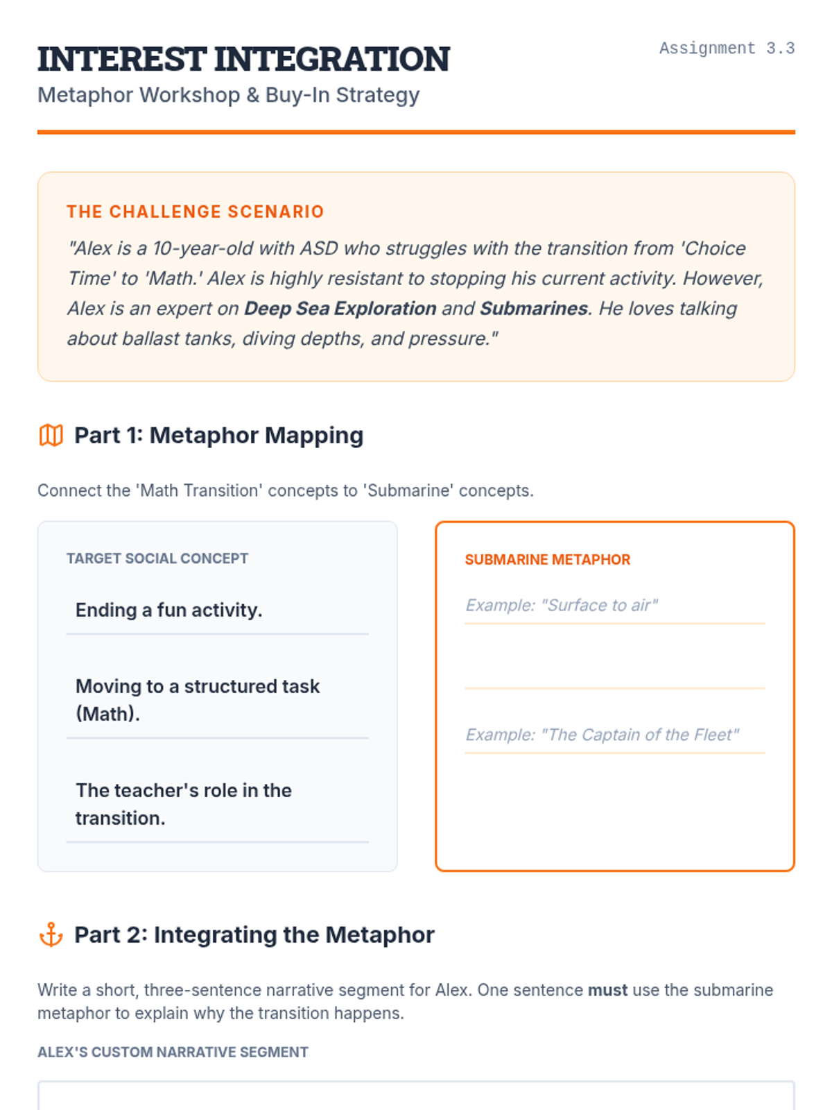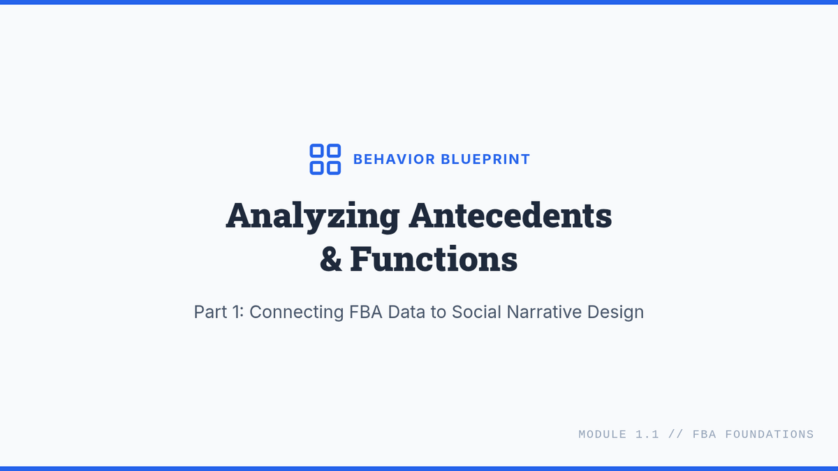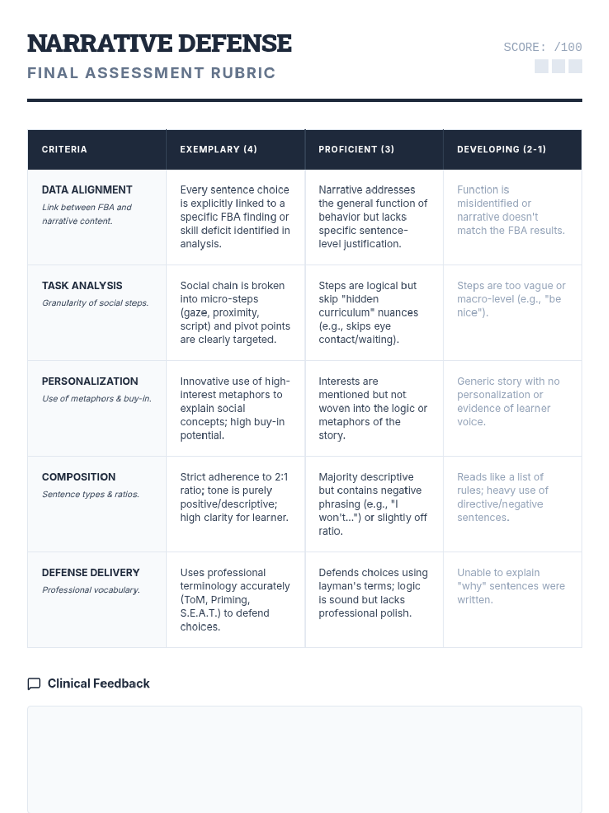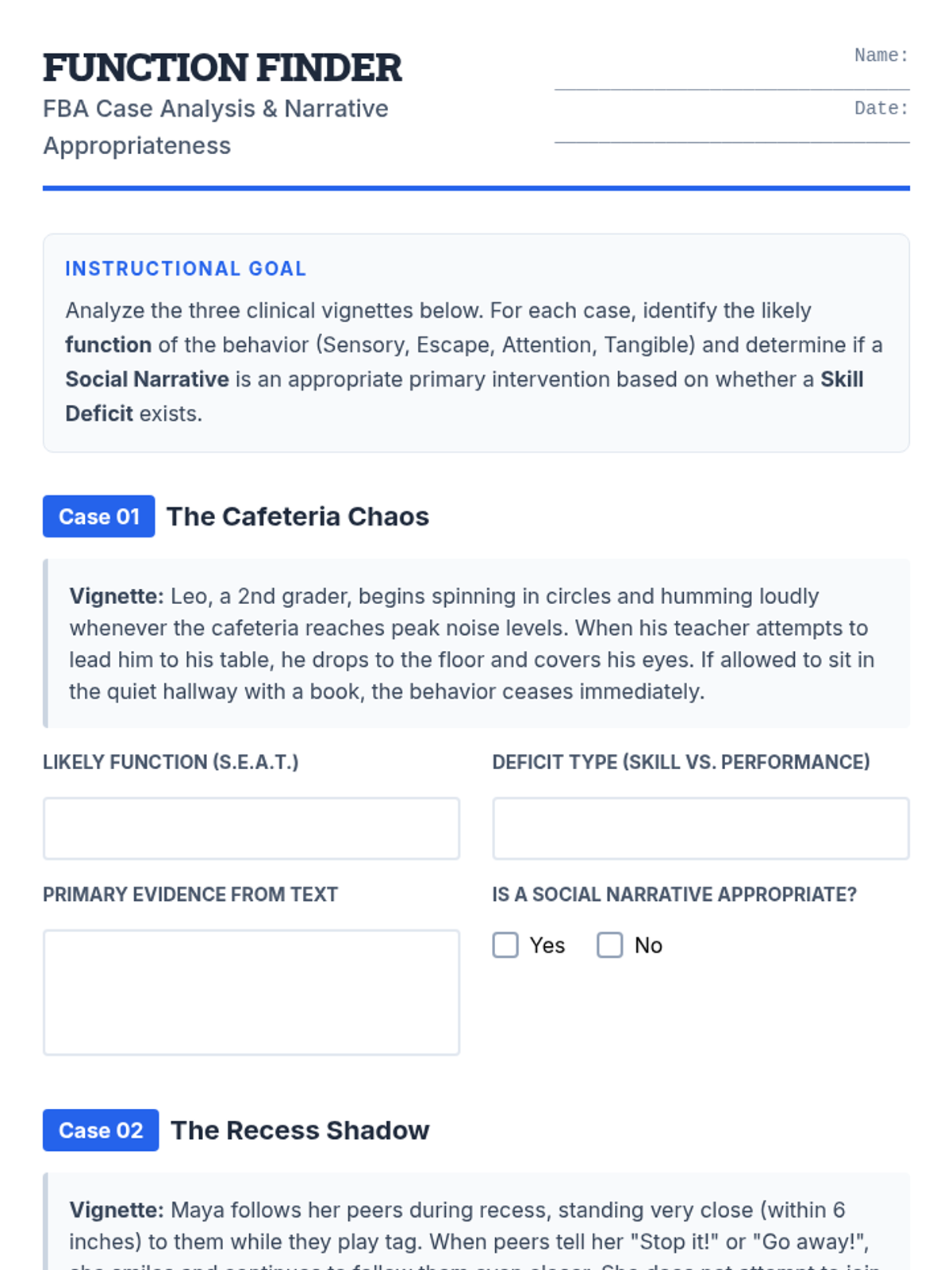 This sequence bridges the gap between Functional Behavior Assessment (FBA) and the creation of effective social narratives. Students learn to analyze behavioral functions, identify specific skill deficits, incorporate student interests, and justify their narrative choices with data-driven rationales.