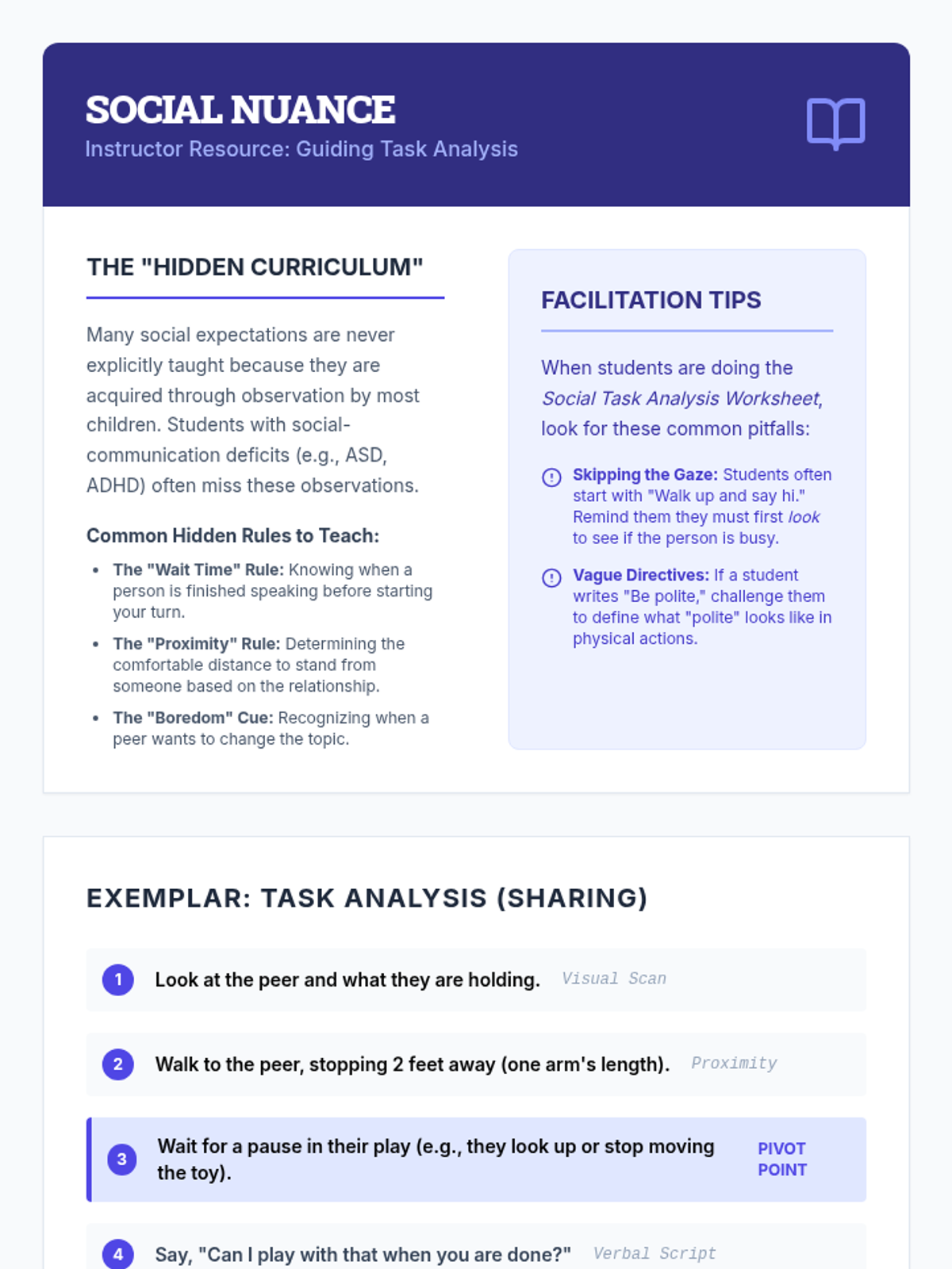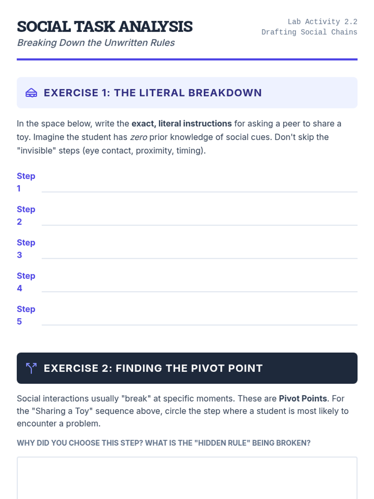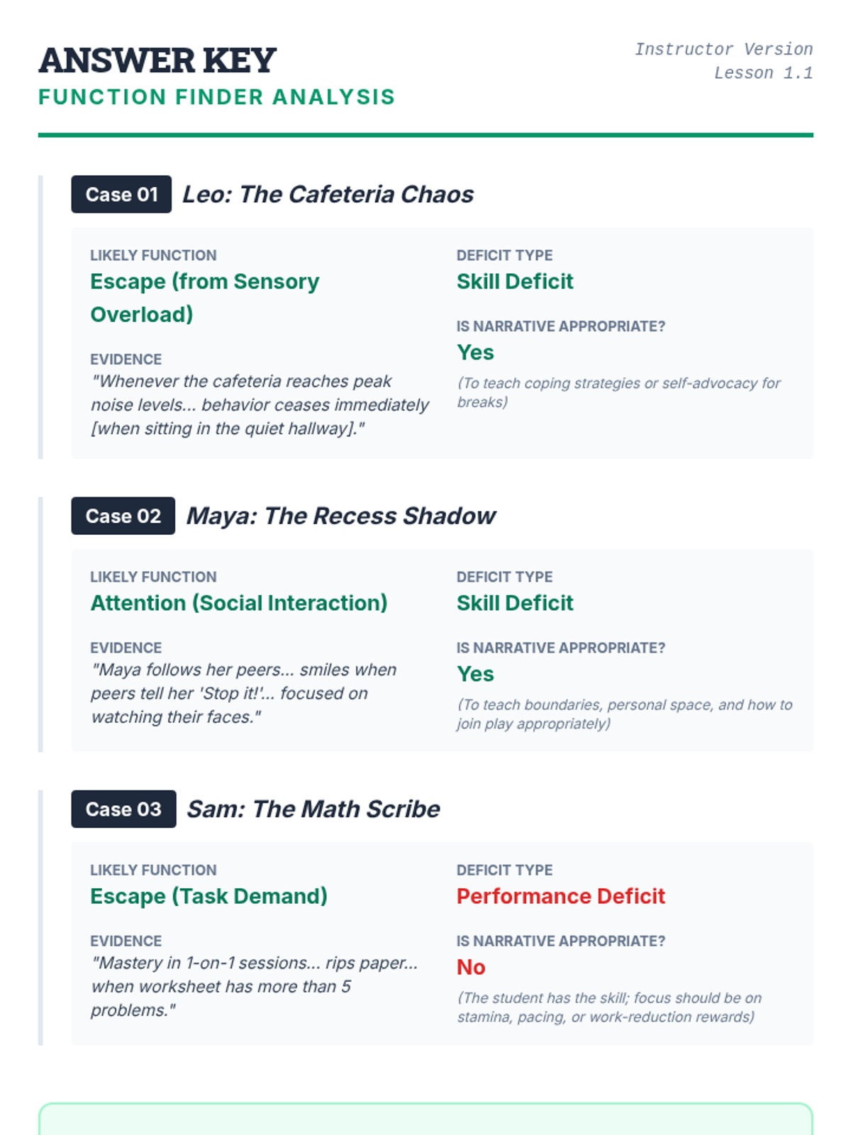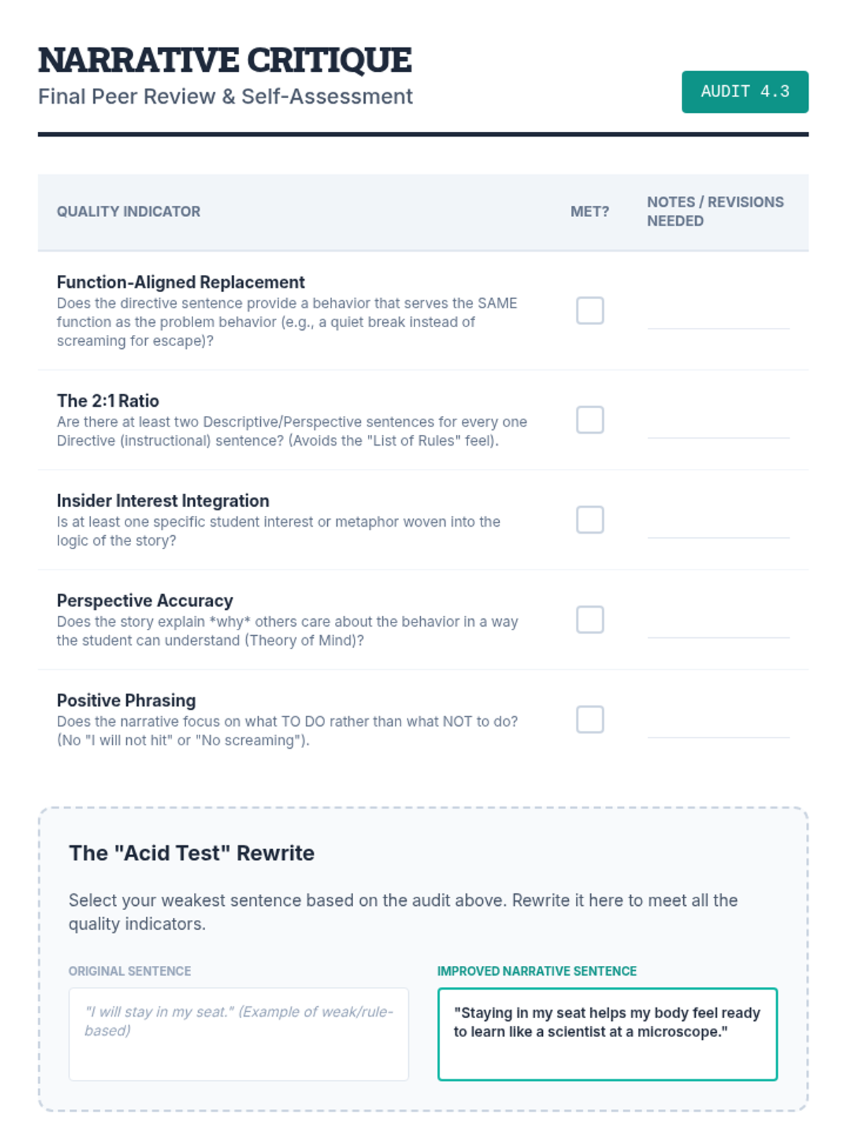 This sequence bridges the gap between Functional Behavior Assessment (FBA) and the creation of effective social narratives. Students learn to analyze behavioral functions, identify specific skill deficits, incorporate student interests, and justify their narrative choices with data-driven rationales.
