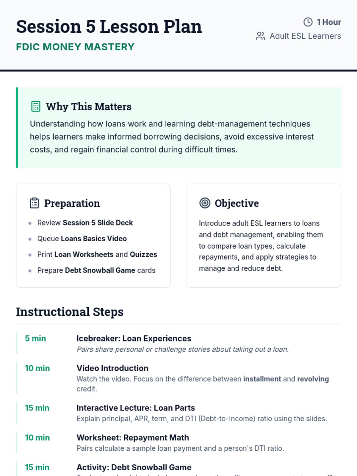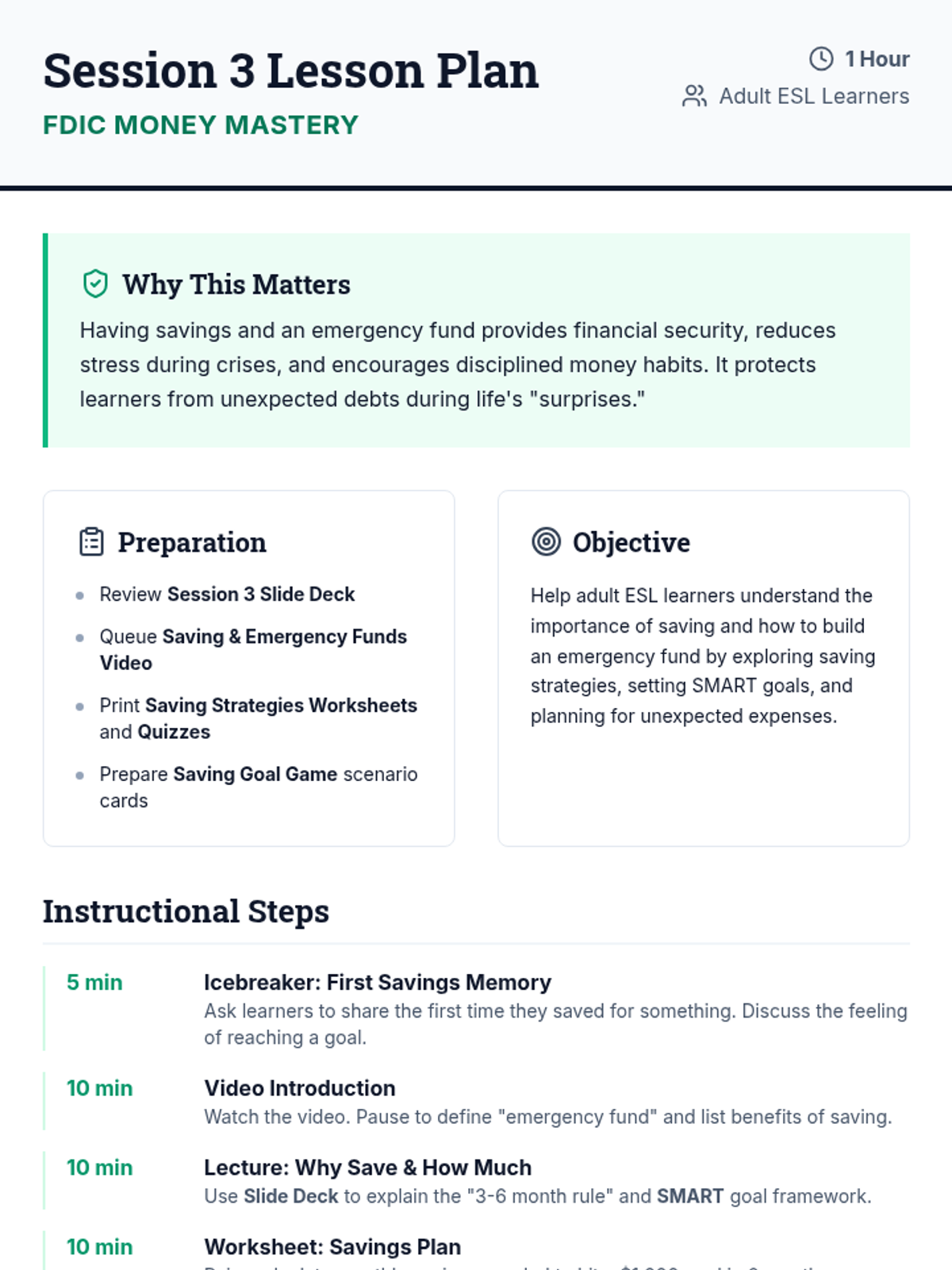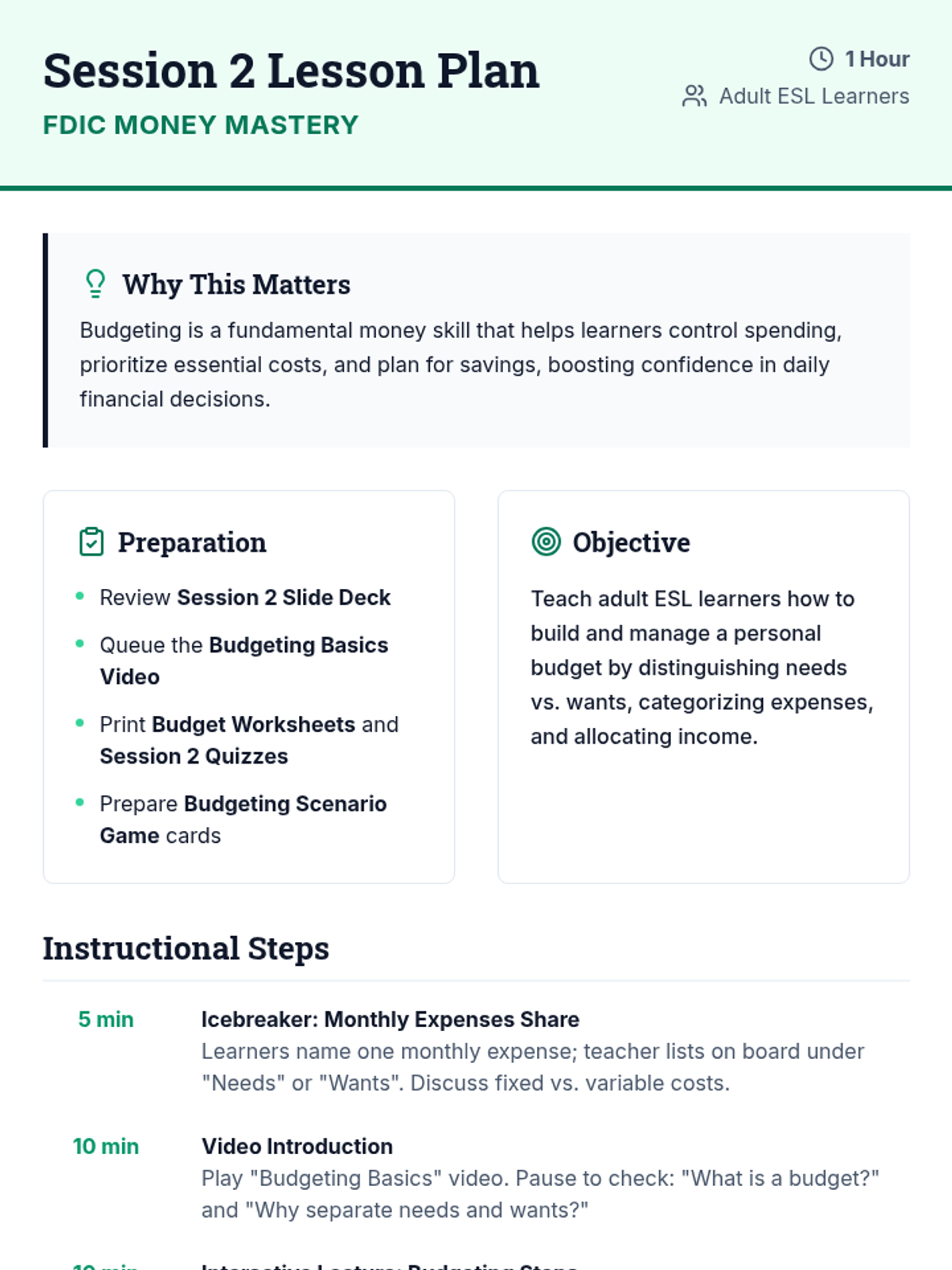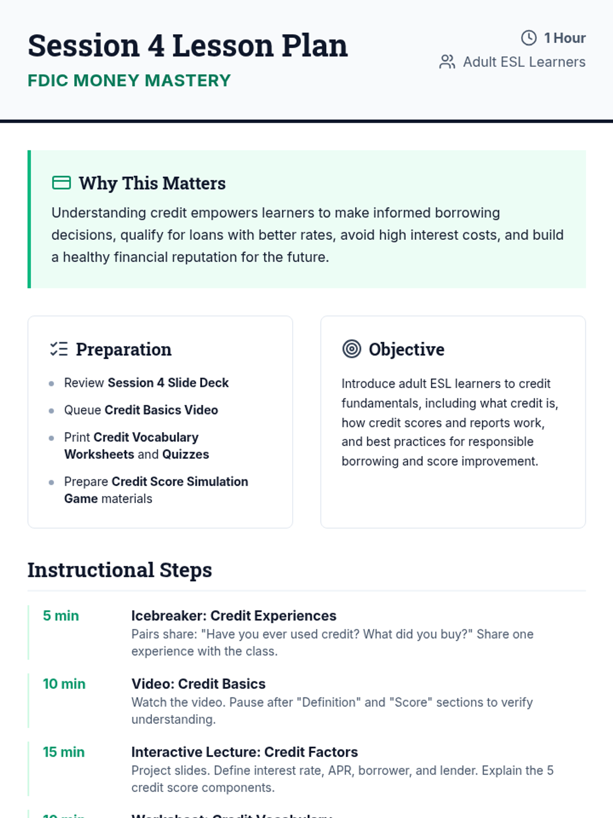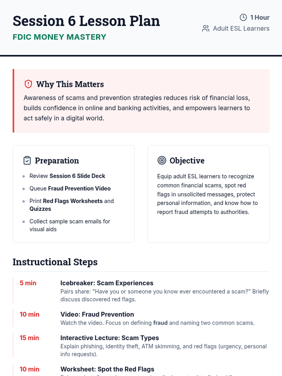 A comprehensive 6-session financial literacy course for adult ESL learners. Utilizing FDIC-based resources, this sequence covers banking basics, budgeting, saving, credit, loans, and fraud prevention to empower students with real-life money management skills.