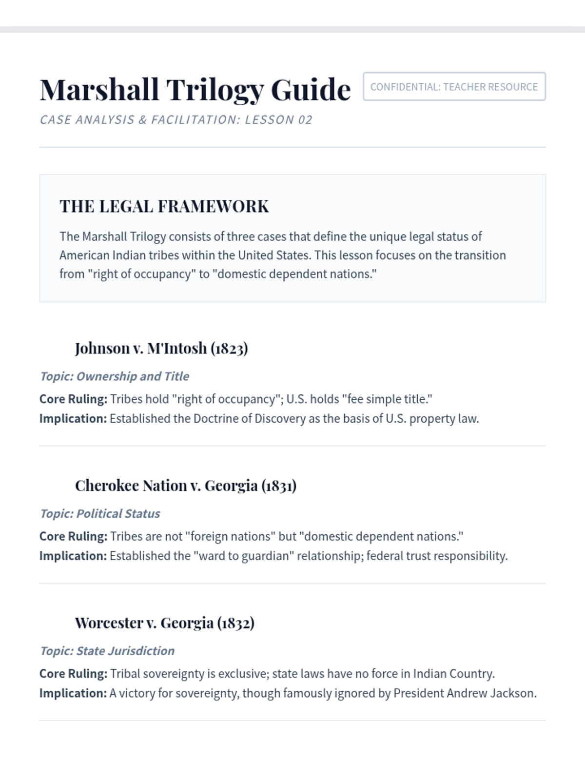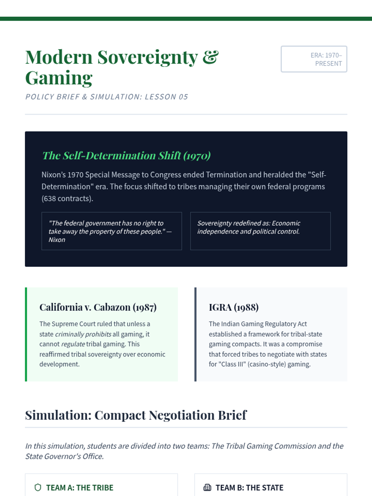 A graduate-level exploration of Federal Indian Law, tracing tribal sovereignty from the Doctrine of Discovery through the Marshall Trilogy to modern gaming compacts. Students analyze how legal frameworks have functioned as tools of both dispossession and self-determination.