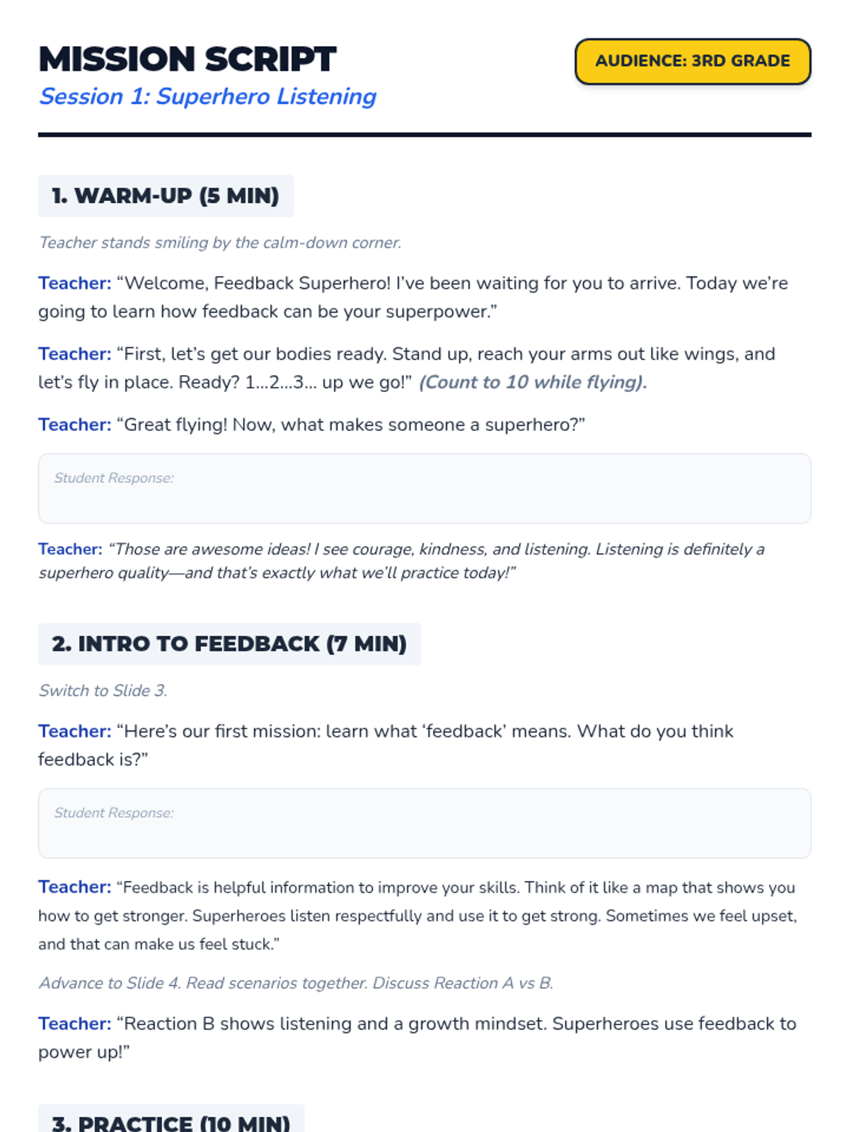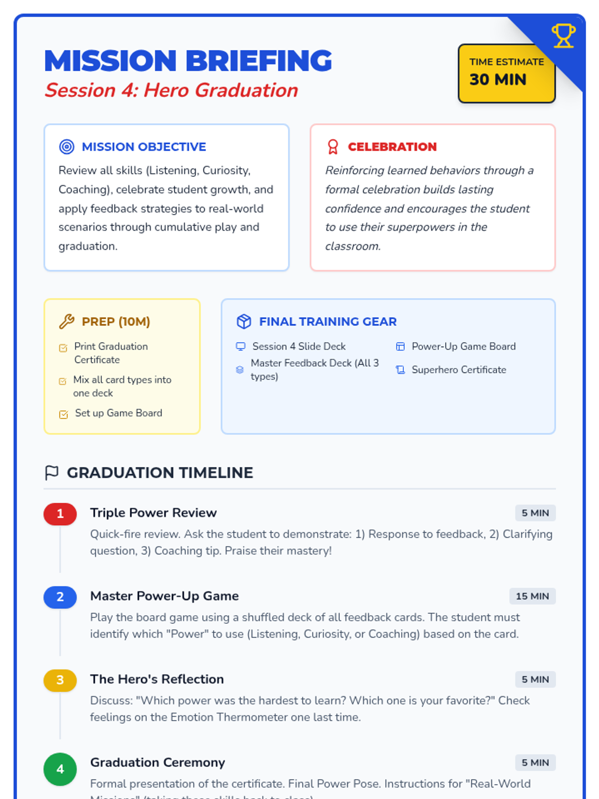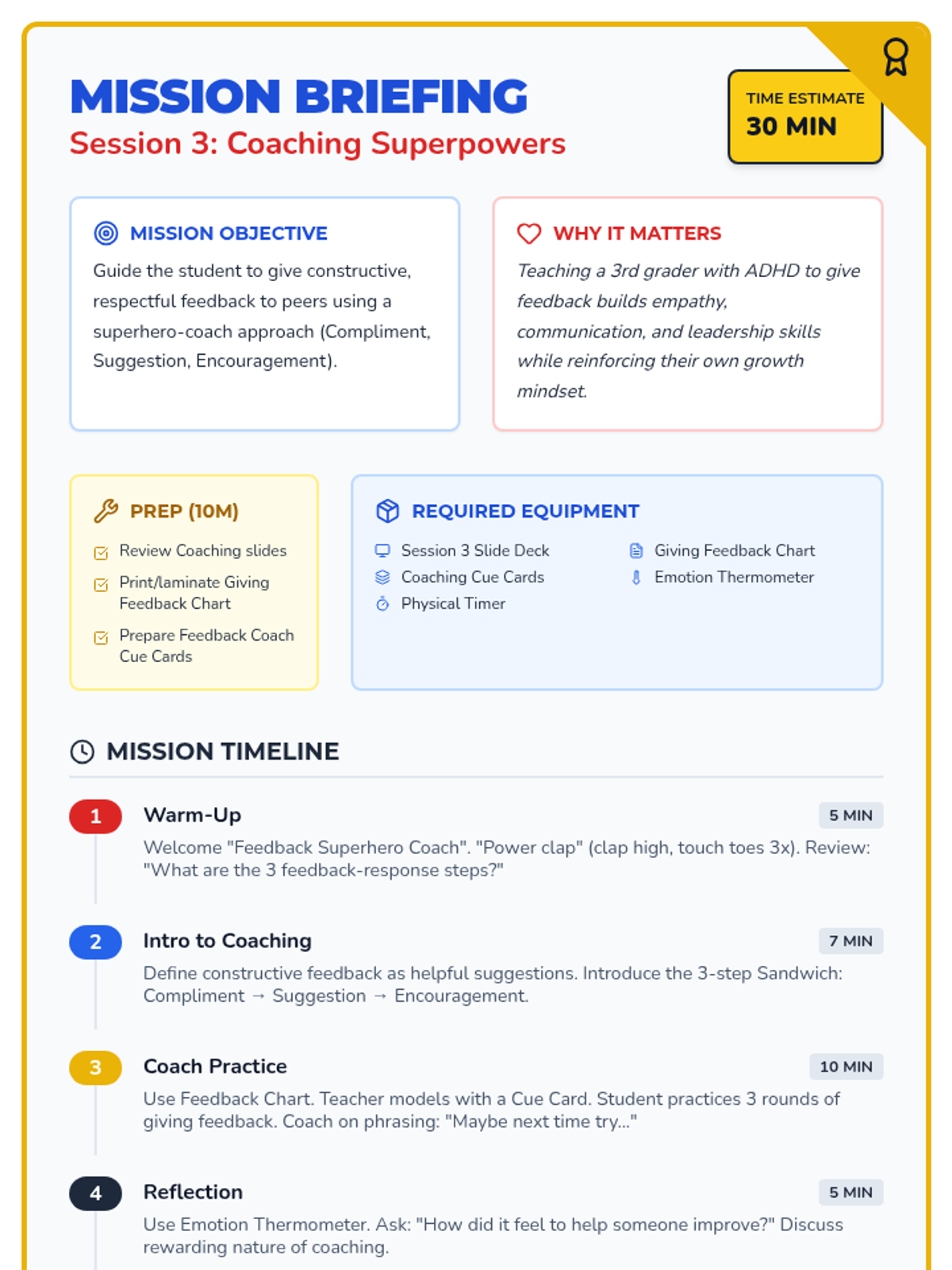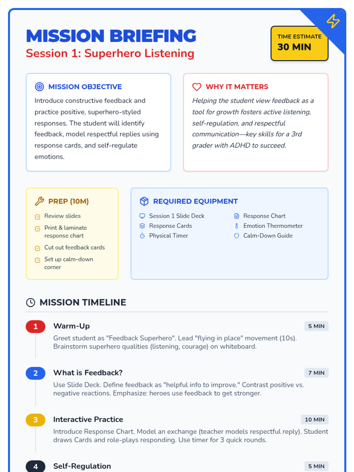 A 4-session intensive intervention sequence designed for 3rd-grade students with ADHD. It uses a superhero theme to teach positive feedback reception, clarifying questions, and constructive coaching through interactive role-play and self-regulation tools.