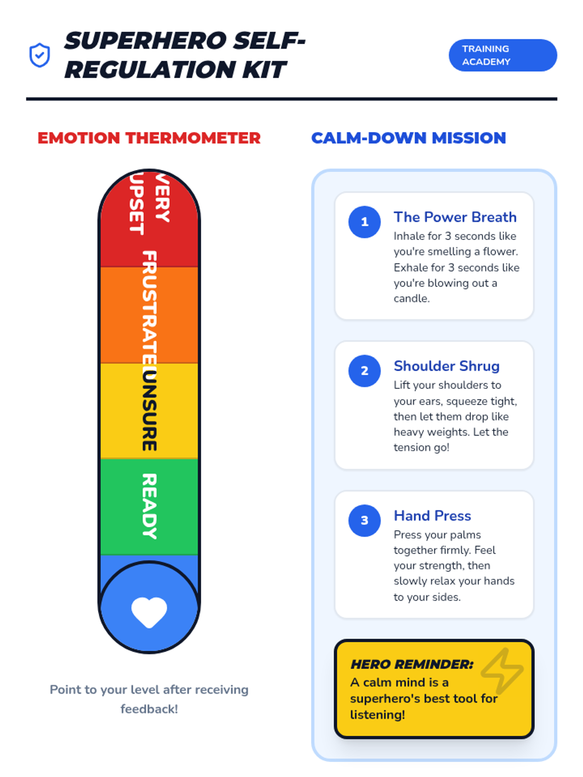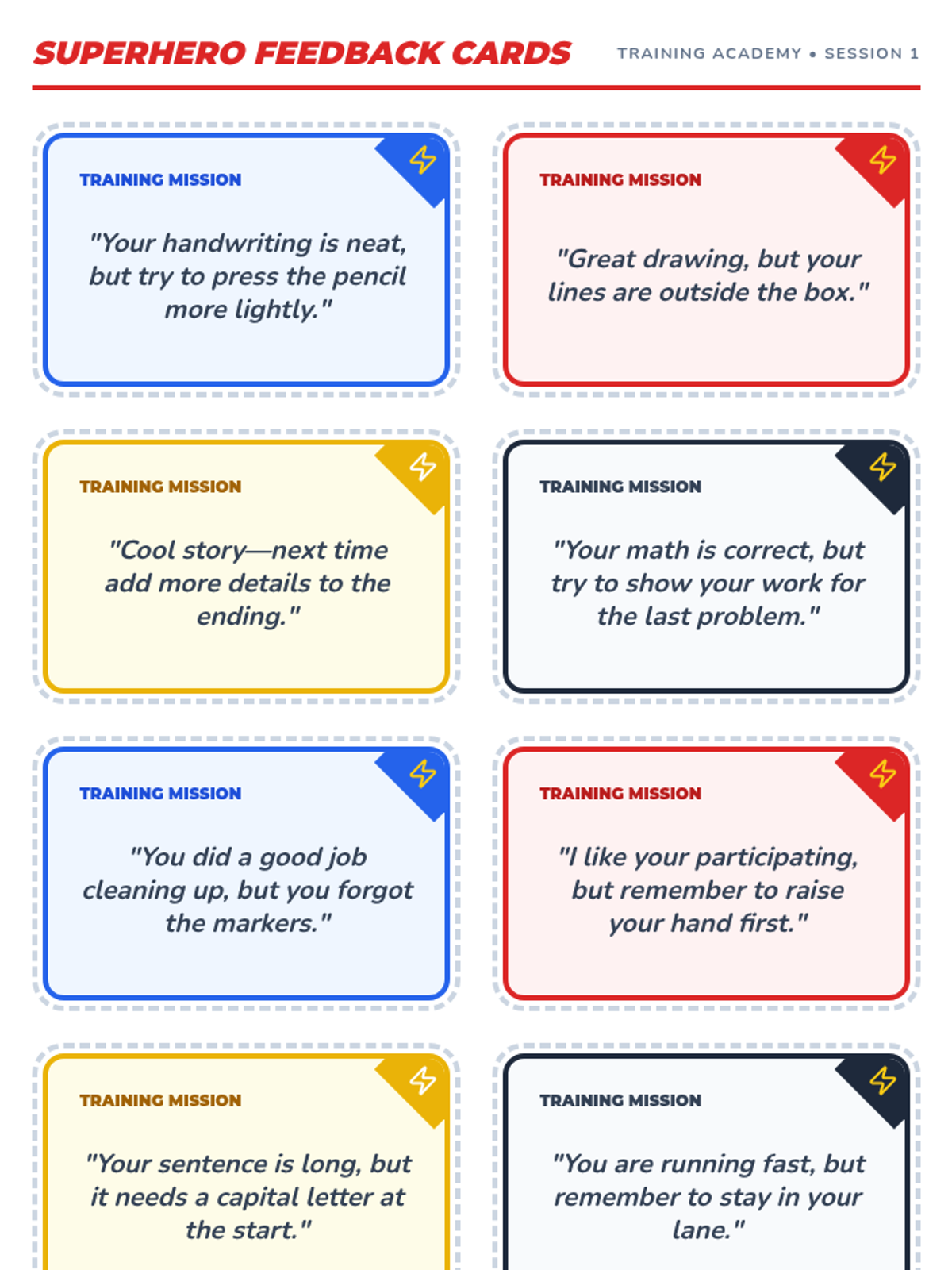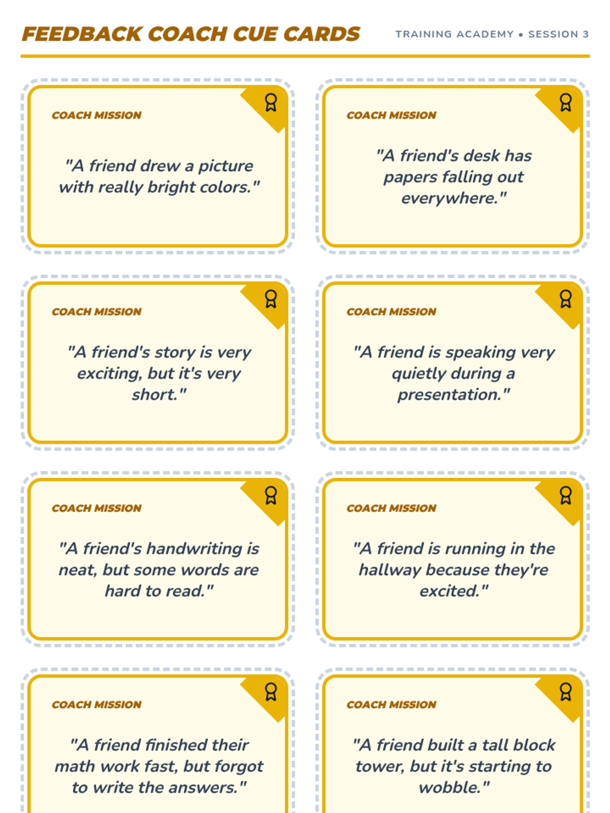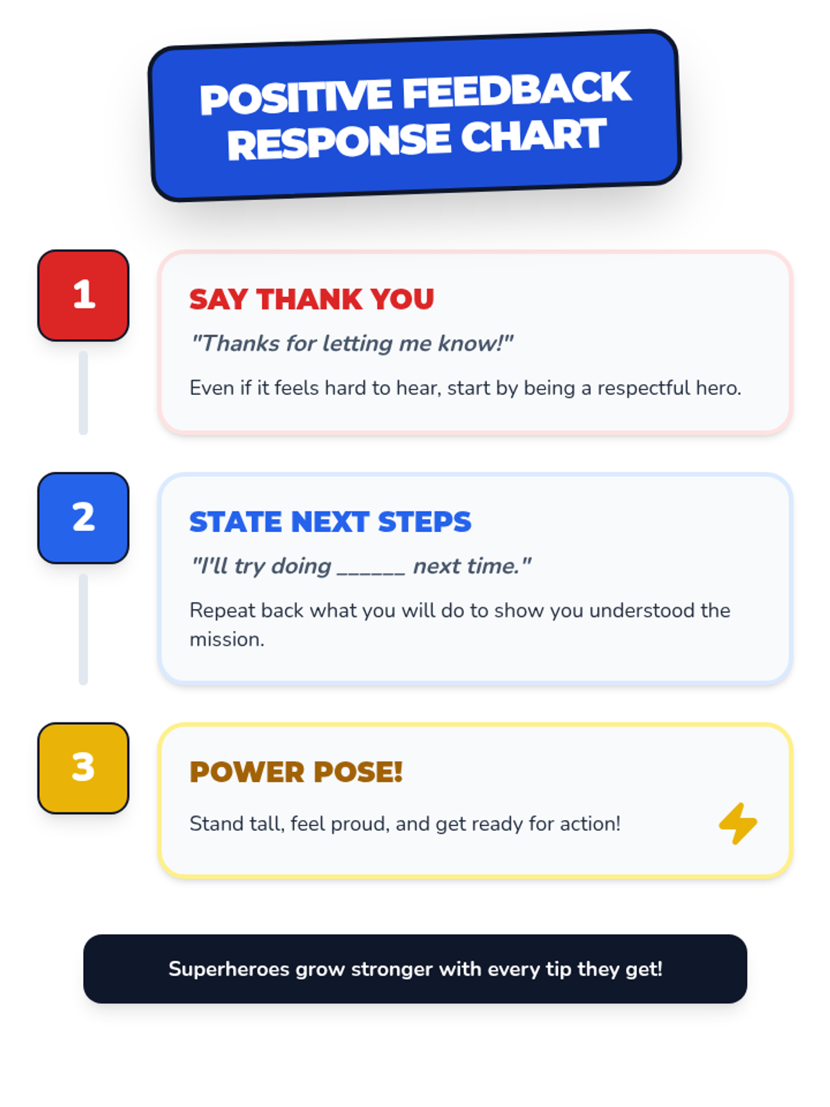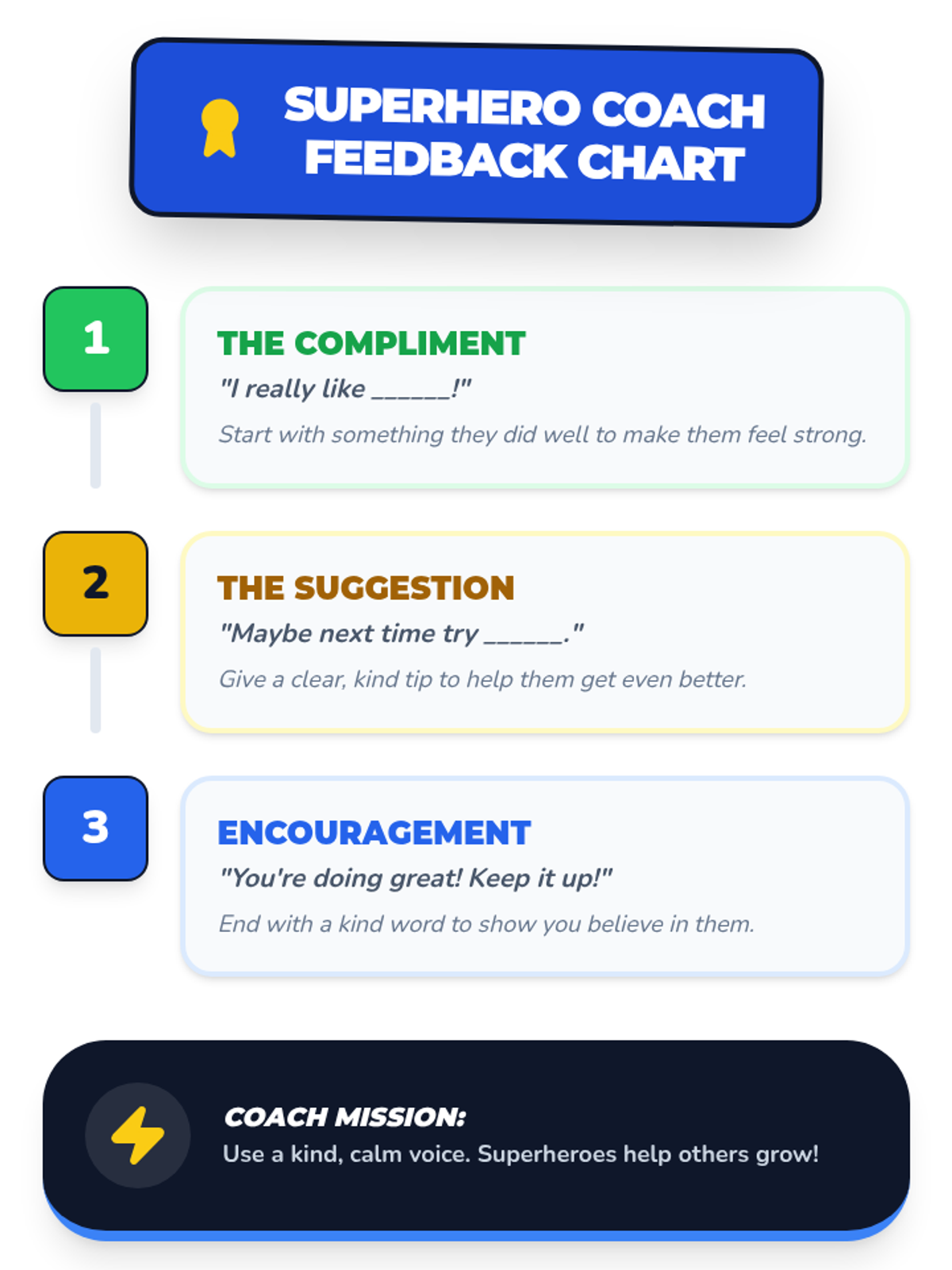 A 4-session intensive intervention sequence designed for 3rd-grade students with ADHD. It uses a superhero theme to teach positive feedback reception, clarifying questions, and constructive coaching through interactive role-play and self-regulation tools.