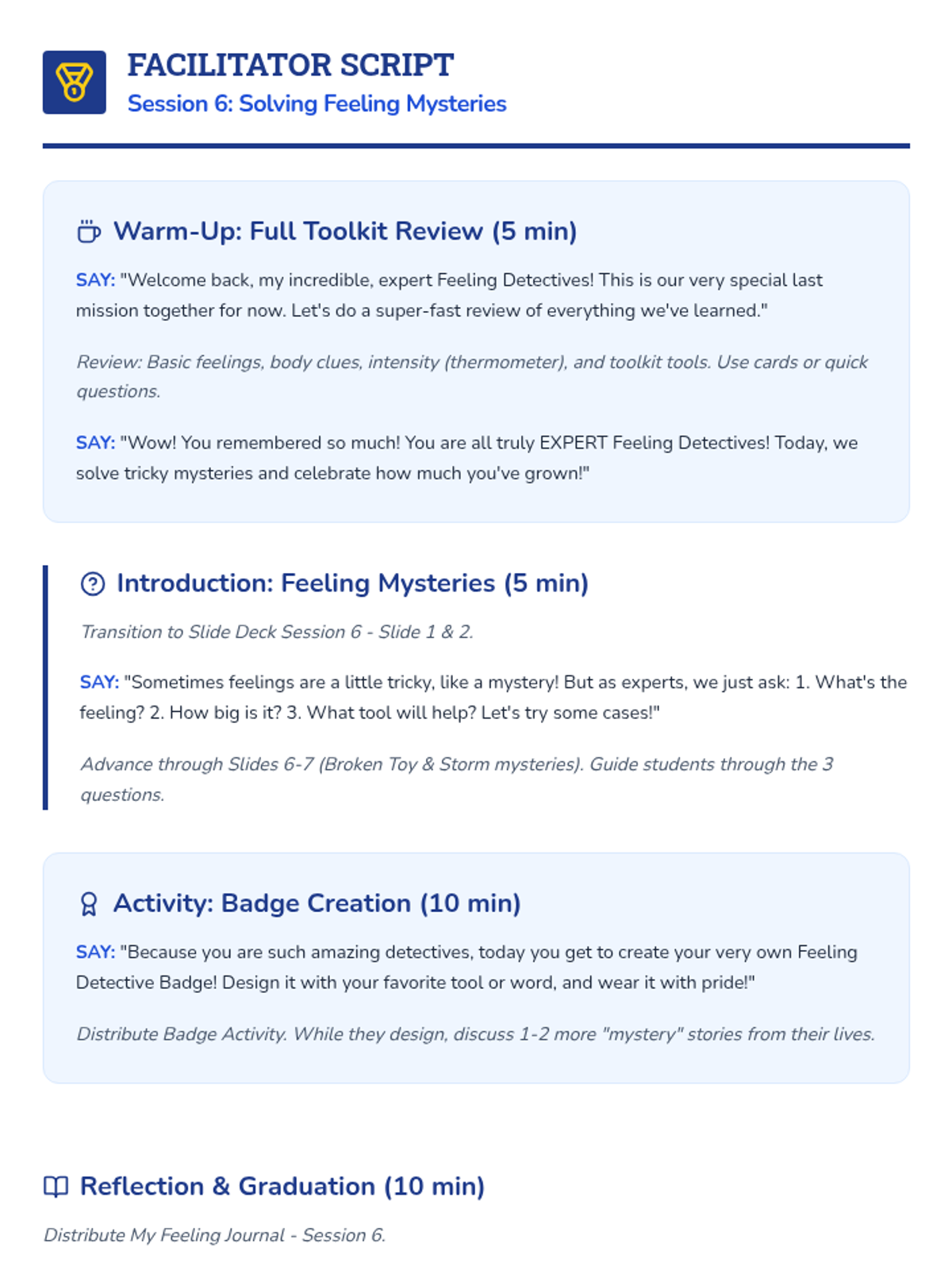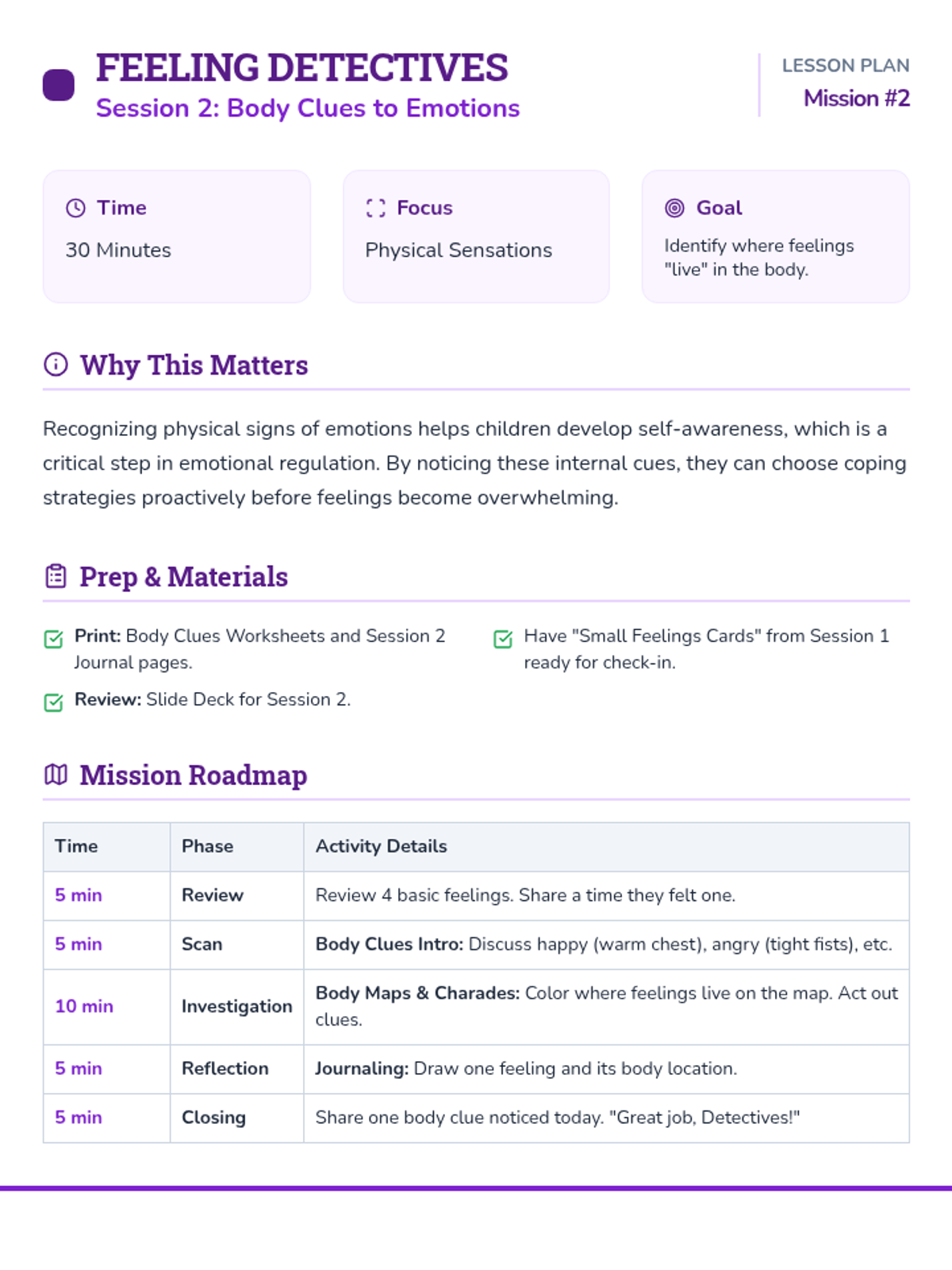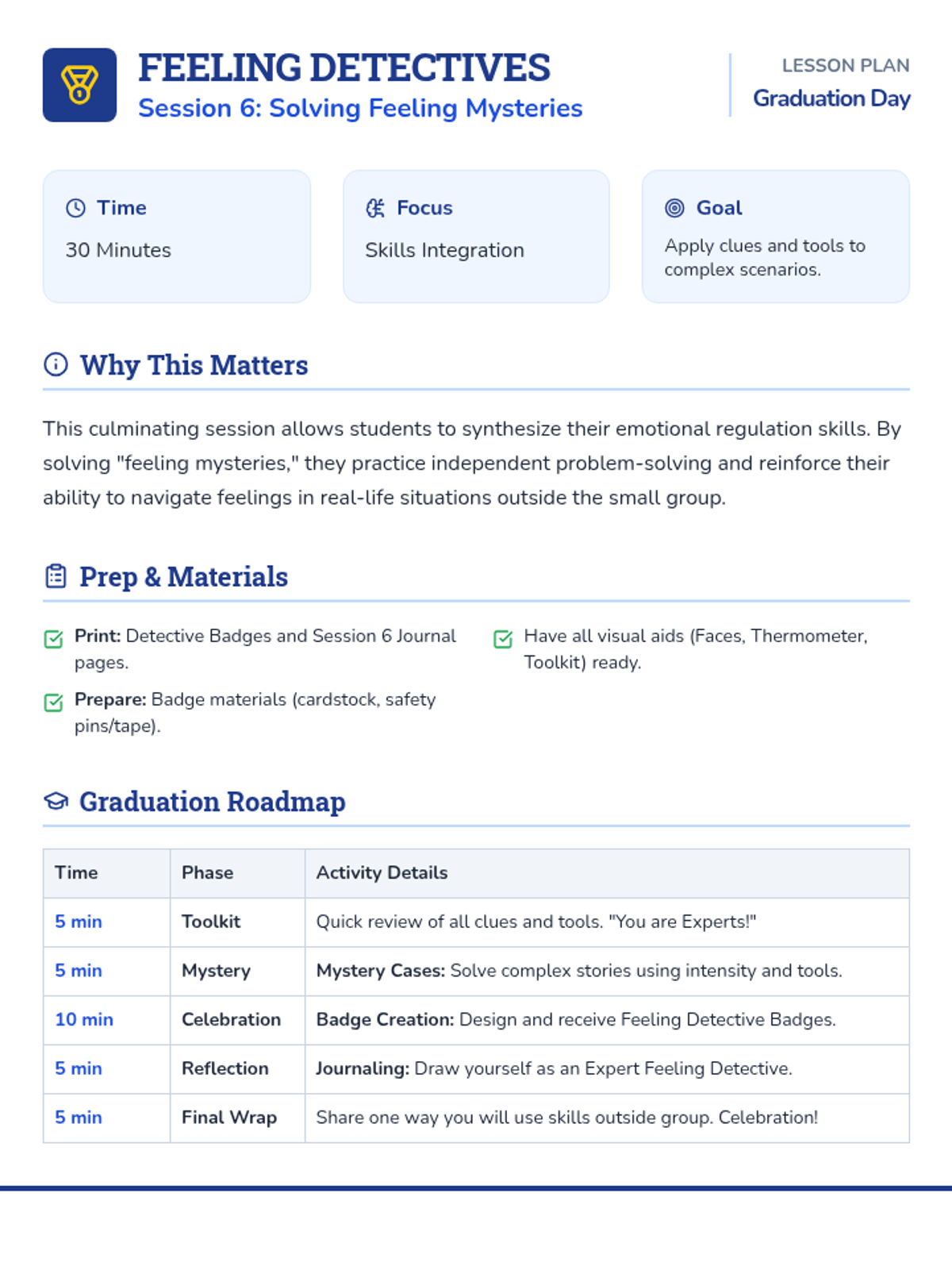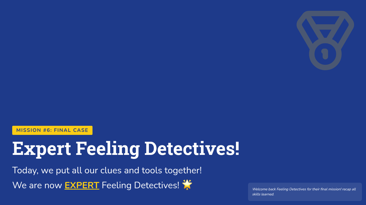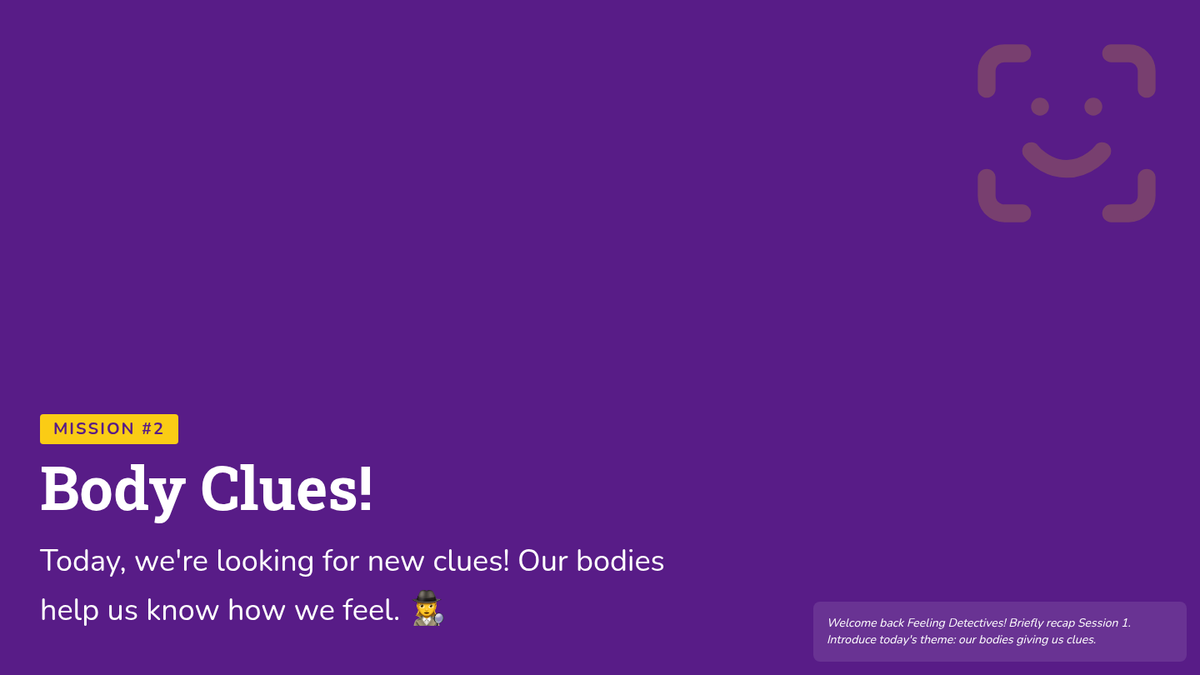 A 6-session social-emotional learning curriculum designed for kindergarteners to identify, understand, and regulate their emotions through the engaging lens of being 'Feeling Detectives'. Students build a toolkit of calming strategies and learn to recognize physical clues of emotions.