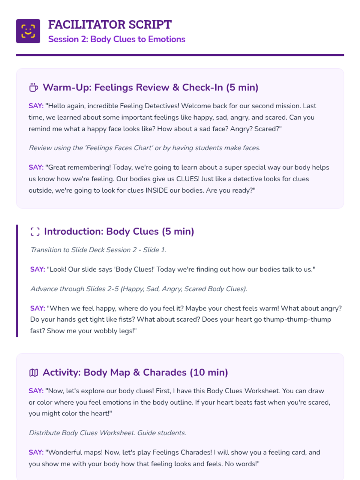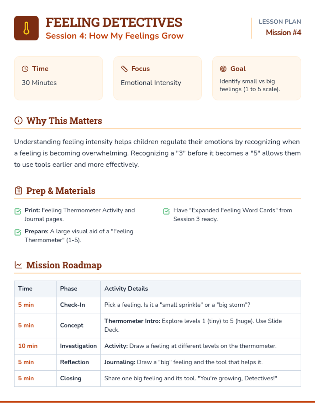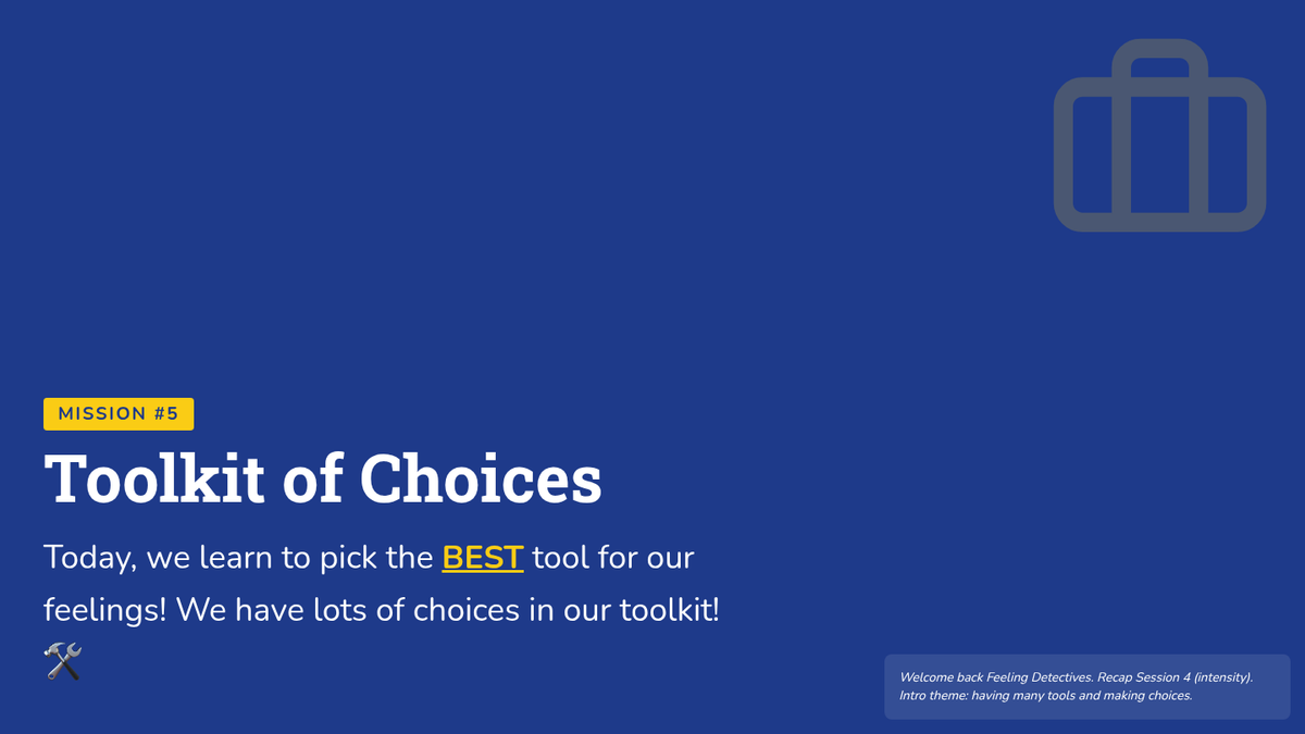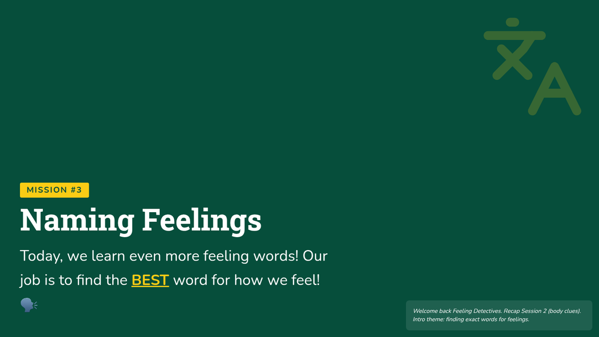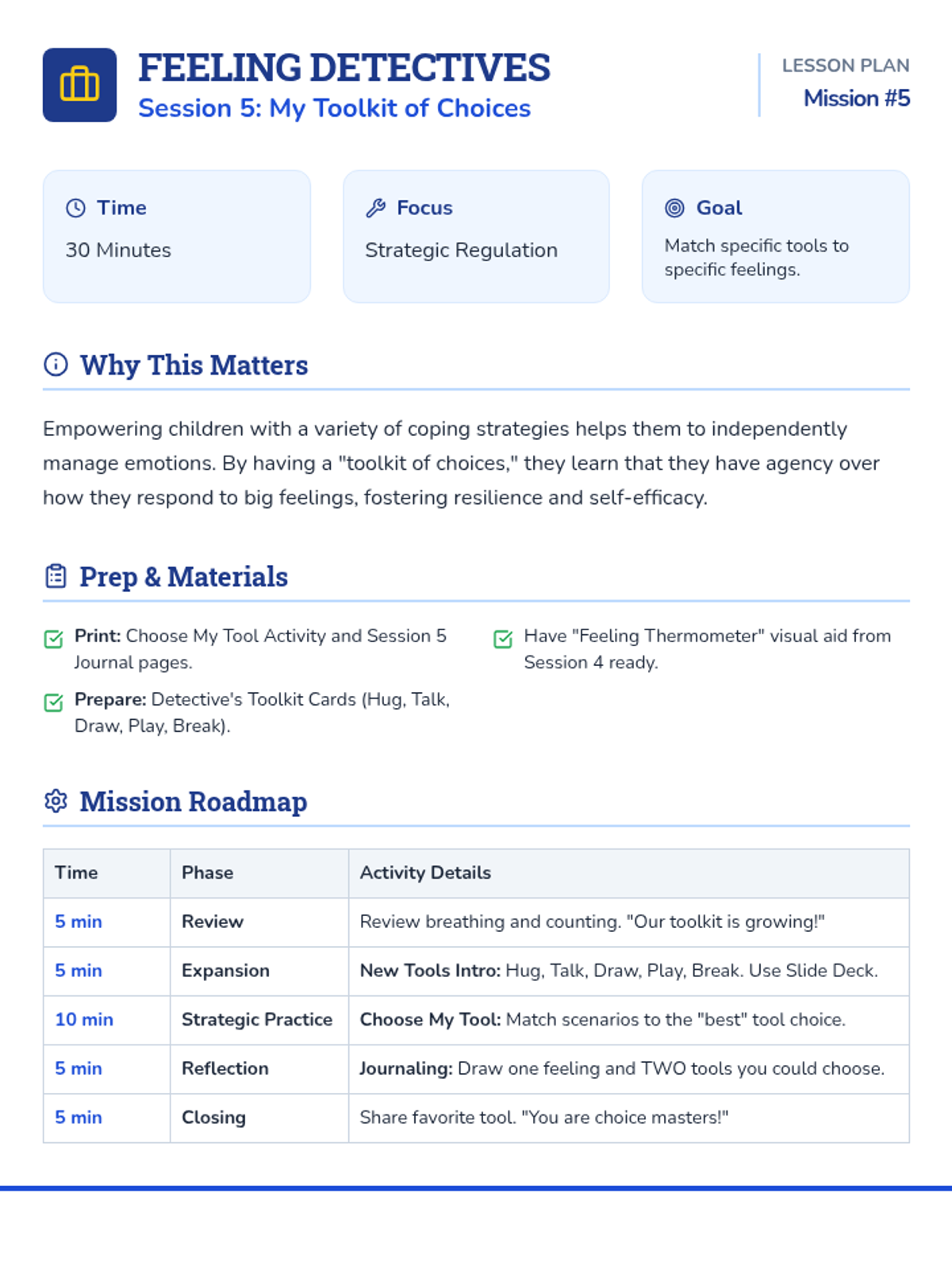 A 6-session social-emotional learning curriculum designed for kindergarteners to identify, understand, and regulate their emotions through the engaging lens of being 'Feeling Detectives'. Students build a toolkit of calming strategies and learn to recognize physical clues of emotions.