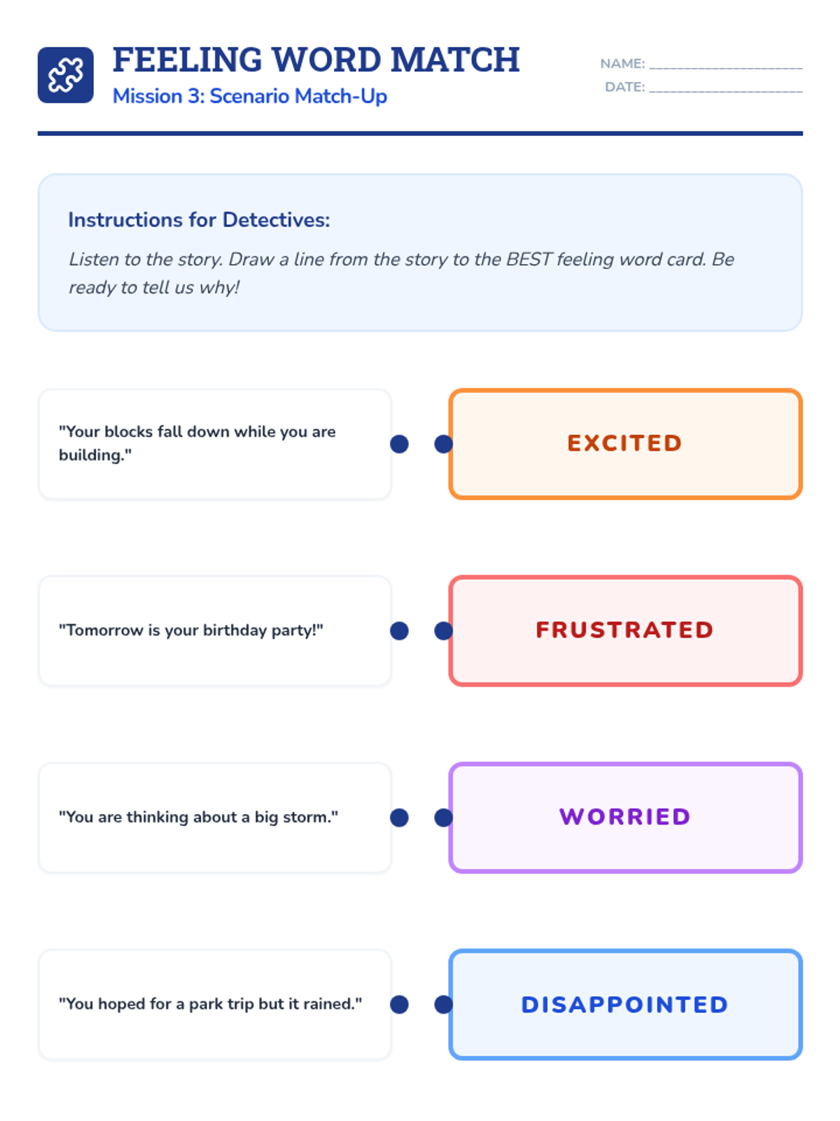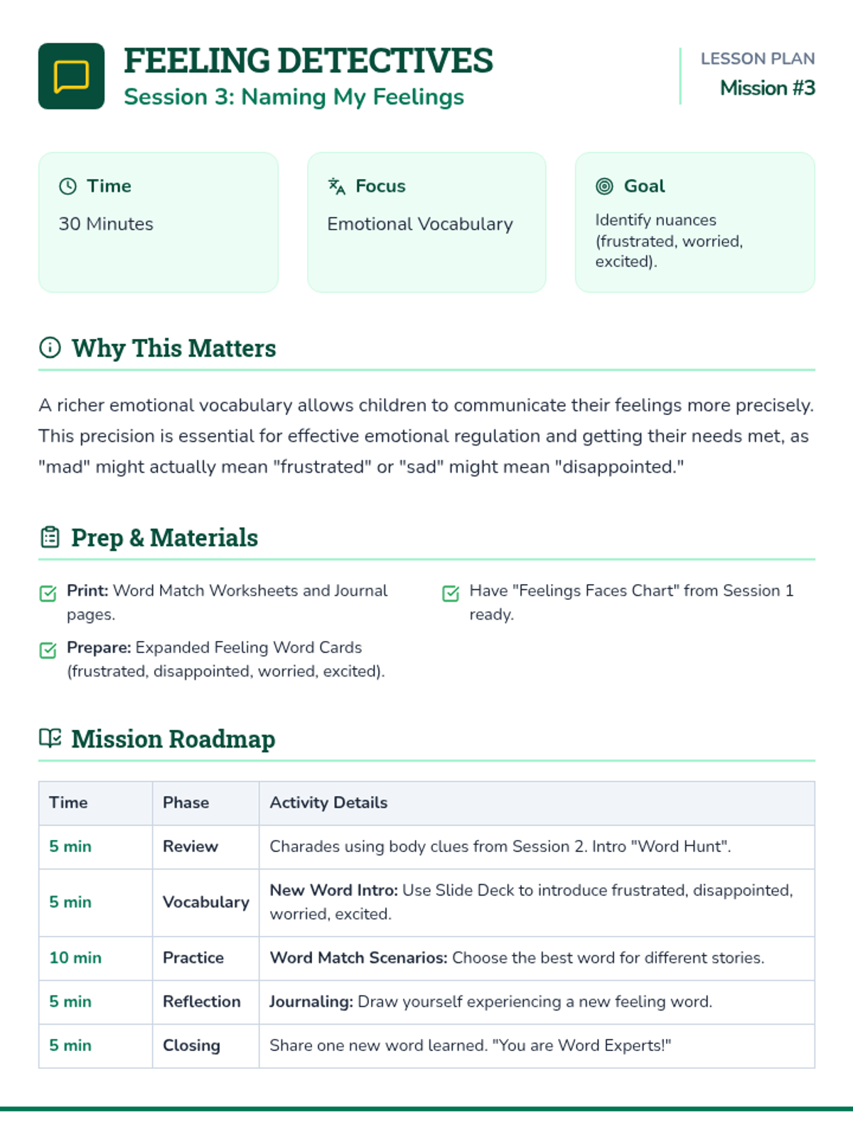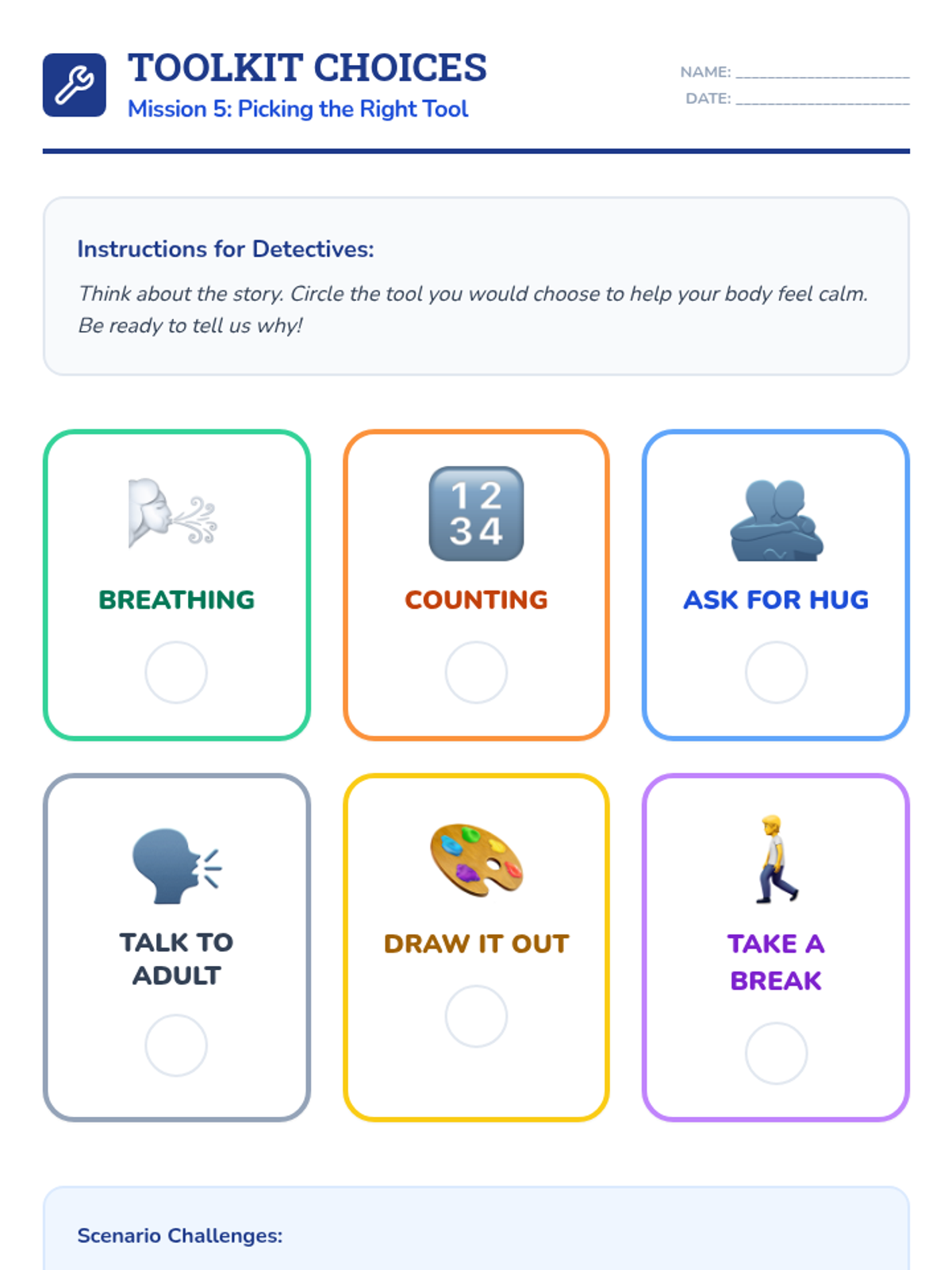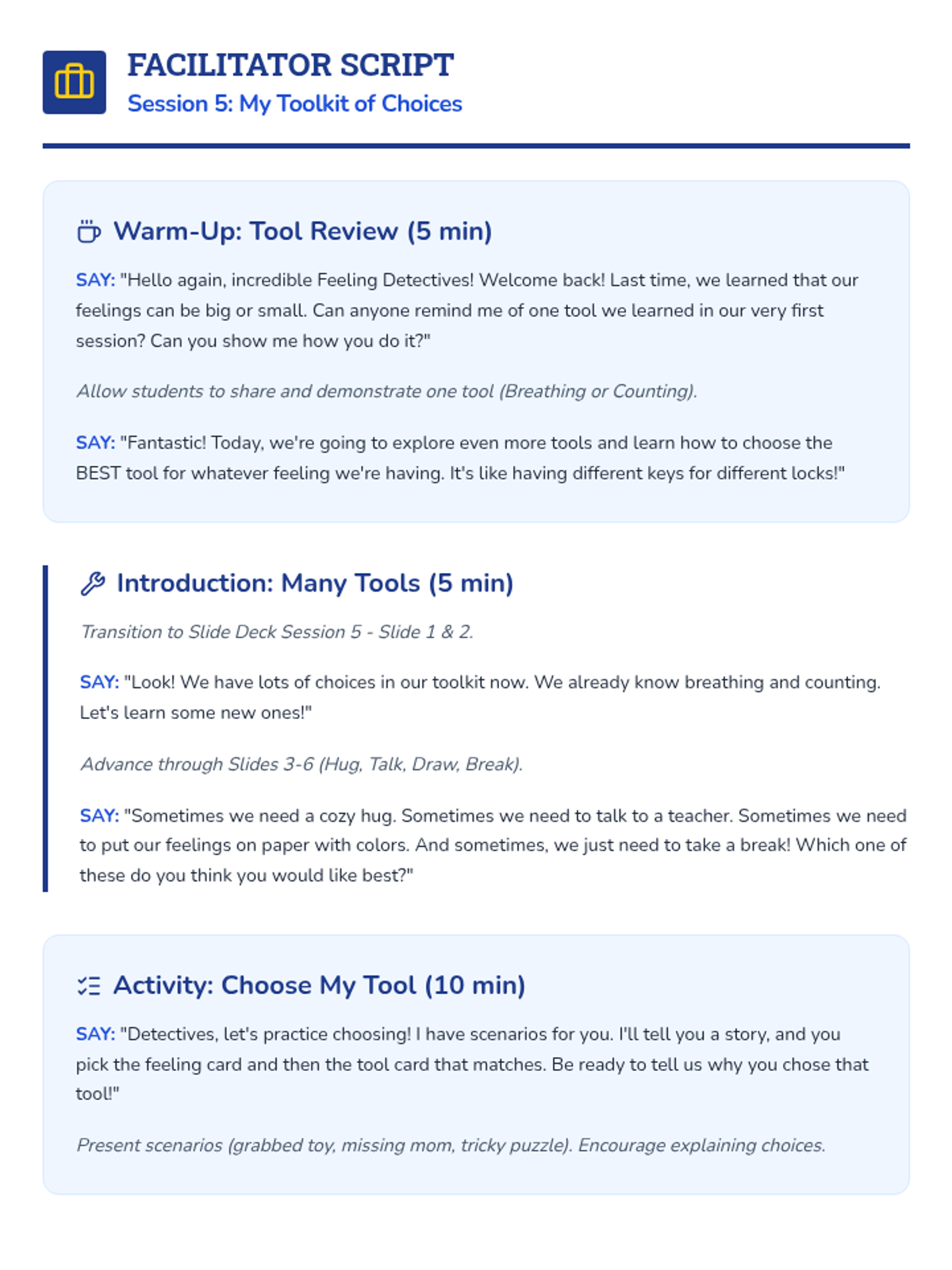 A 6-session social-emotional learning curriculum designed for kindergarteners to identify, understand, and regulate their emotions through the engaging lens of being 'Feeling Detectives'. Students build a toolkit of calming strategies and learn to recognize physical clues of emotions.