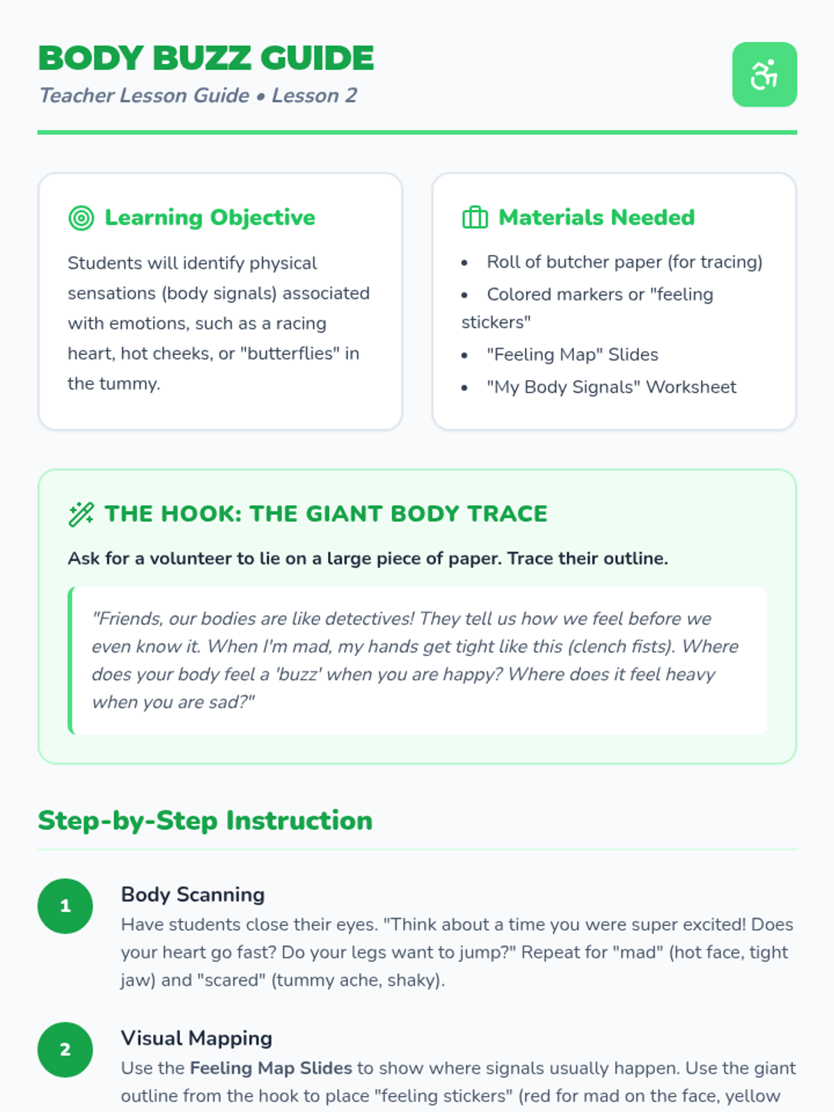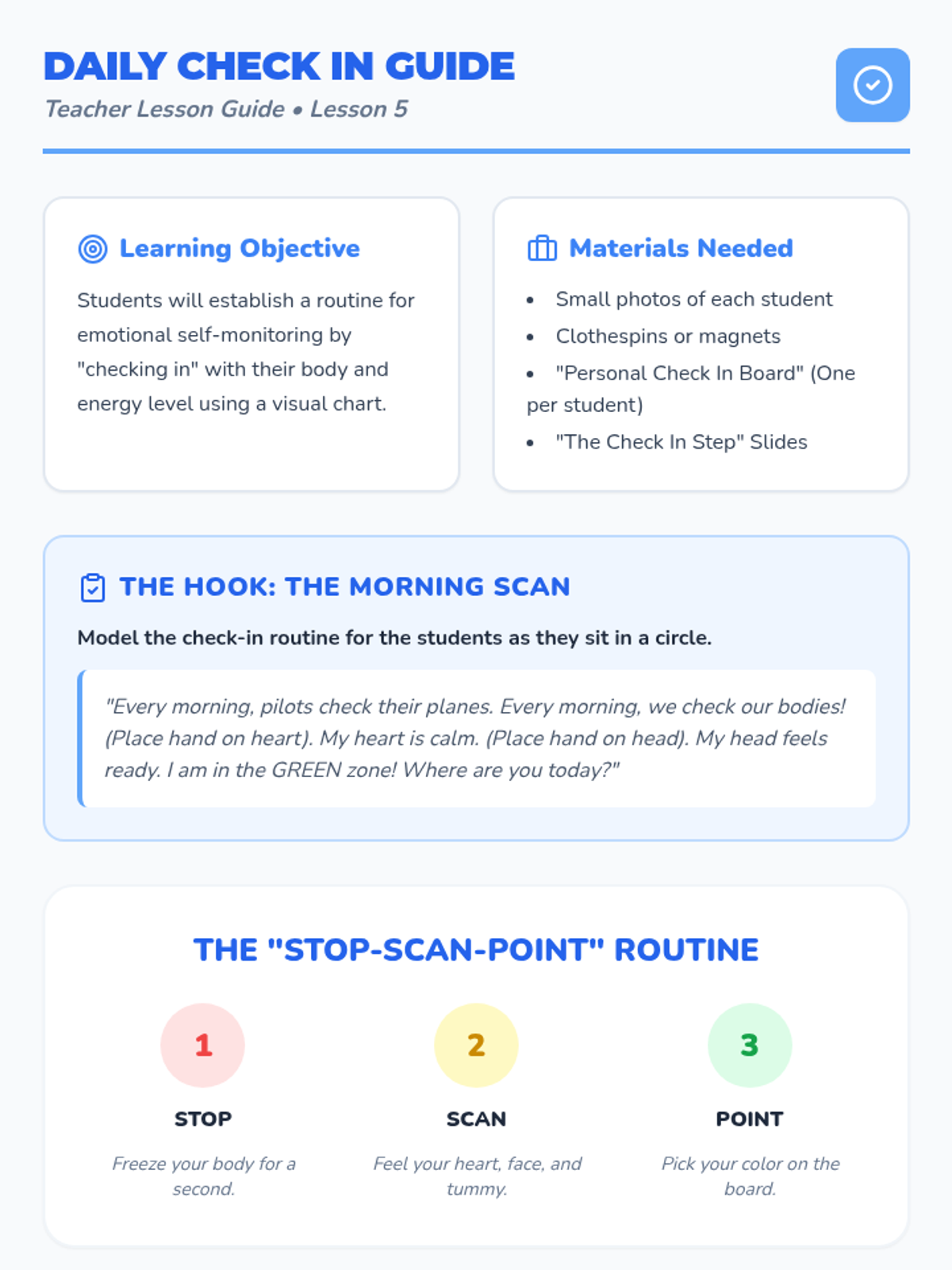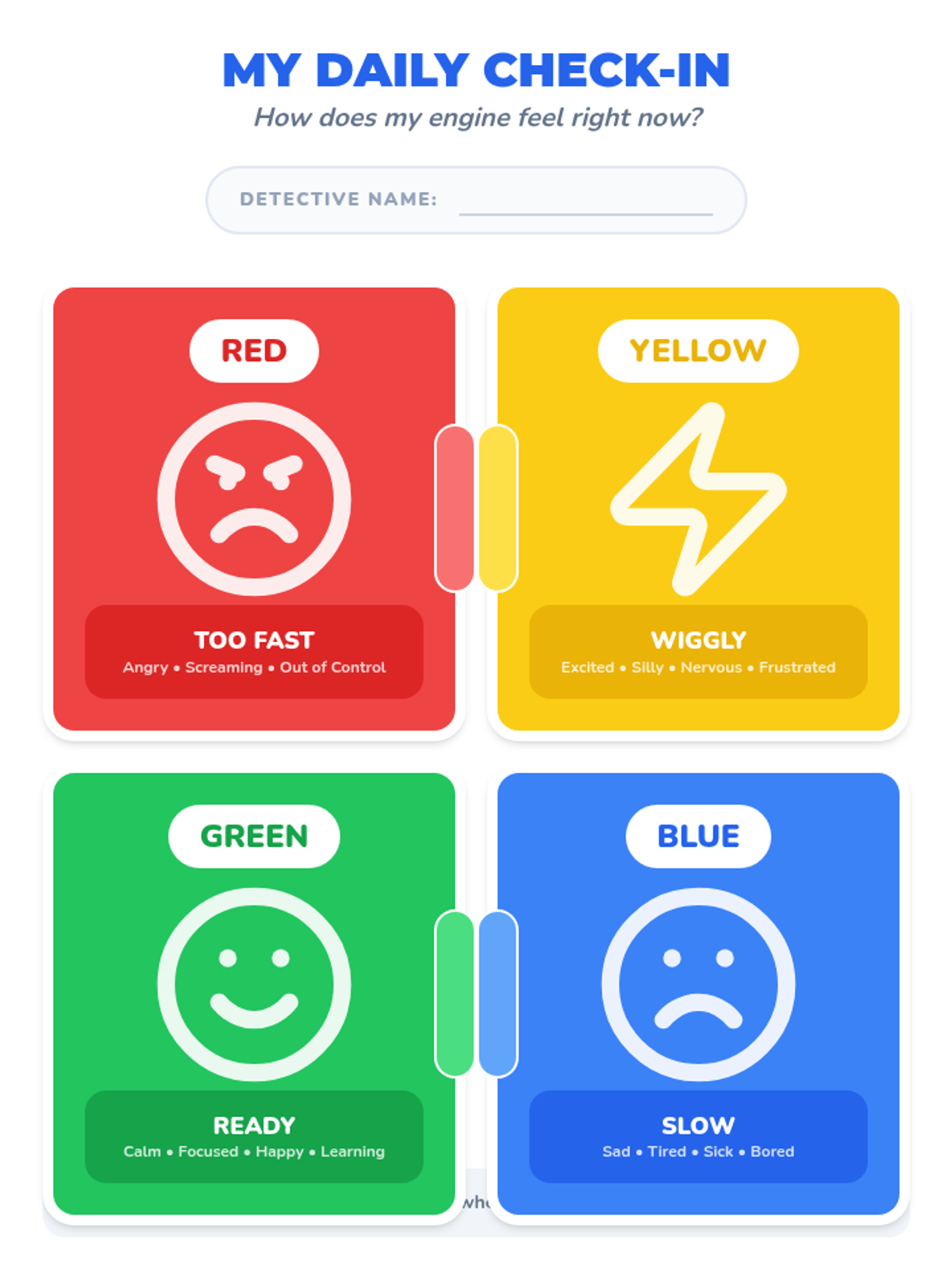 A foundational sequence for Pre-K students to identify basic emotions, recognize physical body signals (interoception), and associate feelings with a color-coded energy system to improve self-regulation.
